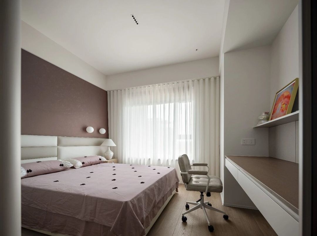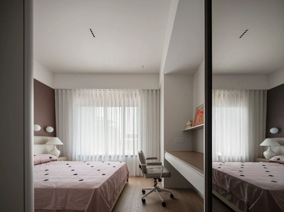 女孩房主要以孩子喜欢的粉色为基地,不管是柜子的转角还是软包灯具,都尽量采用弧形圆形设计,避免孩子产生磕碰。