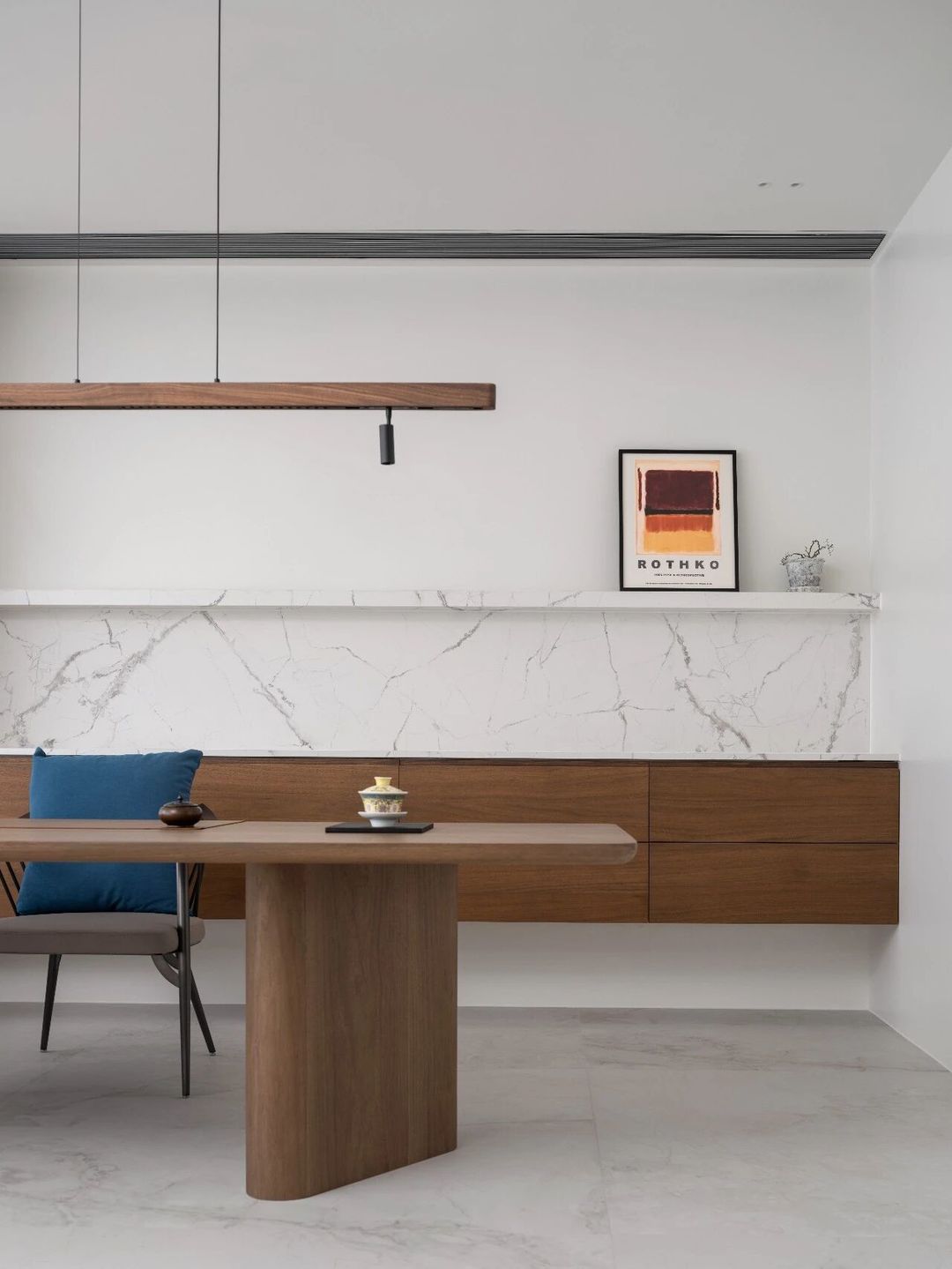 餐厅设计在了厨房的门口,餐桌设计的岩板长桌,可以满足一家四口同时就餐。有客人来了也可以临时加凳子,同时满足8-10人就餐是没有问题的。