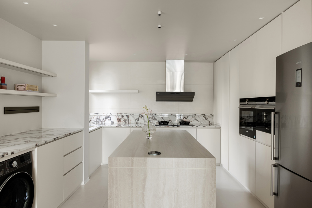 在空间利用上,我们突破了传统的设计思维,空间的分隔不再依赖于墙体。厨房入口处的背靠背柜体设计,既巧妙地分隔了空间,还增加了储物的实用性。