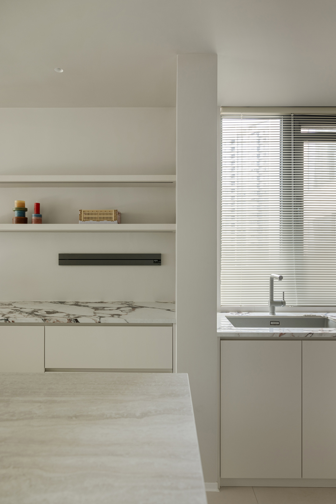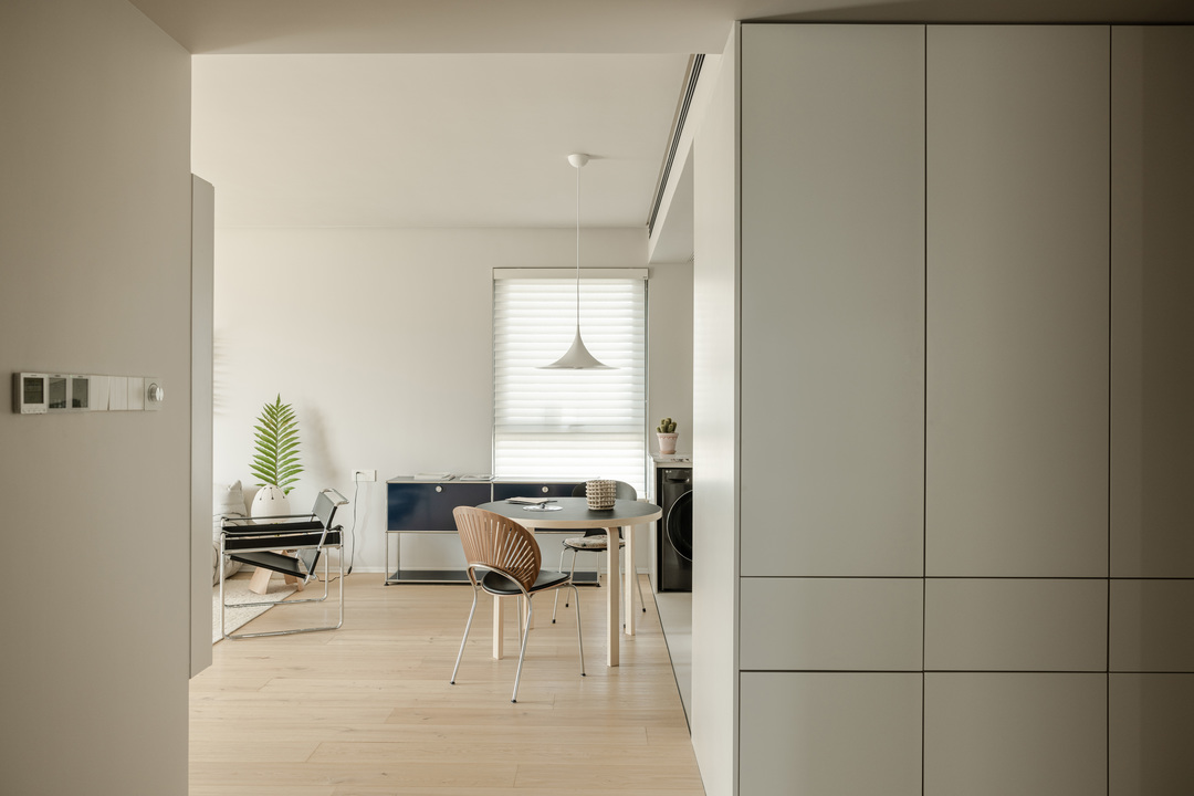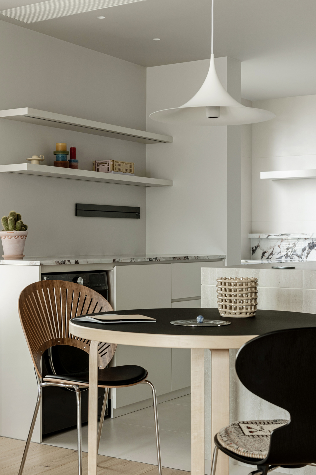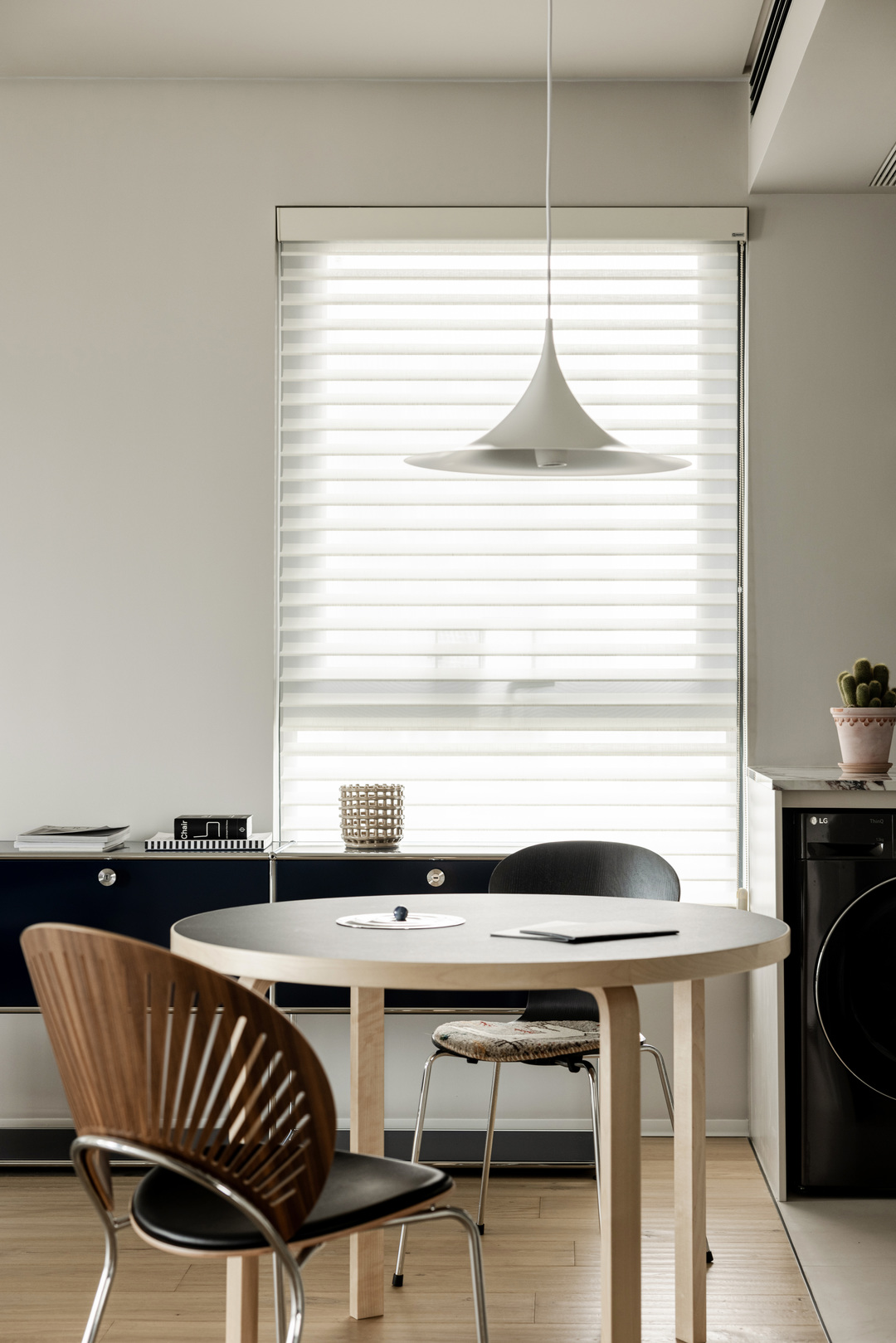 在餐厨区域的设计中,我们优先考虑了厨房的使用需求,将更多的空间留给厨房。一张小圆桌成为了屋主二人的用餐区域,简洁却温馨。在设计上,我们有意弱化了餐厅的概念,不再将其作为独立的空间处理,而是根据屋主的生活习