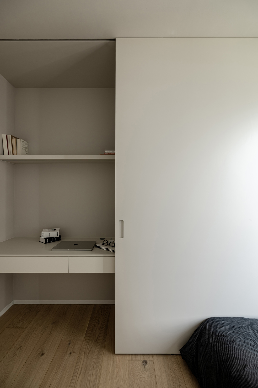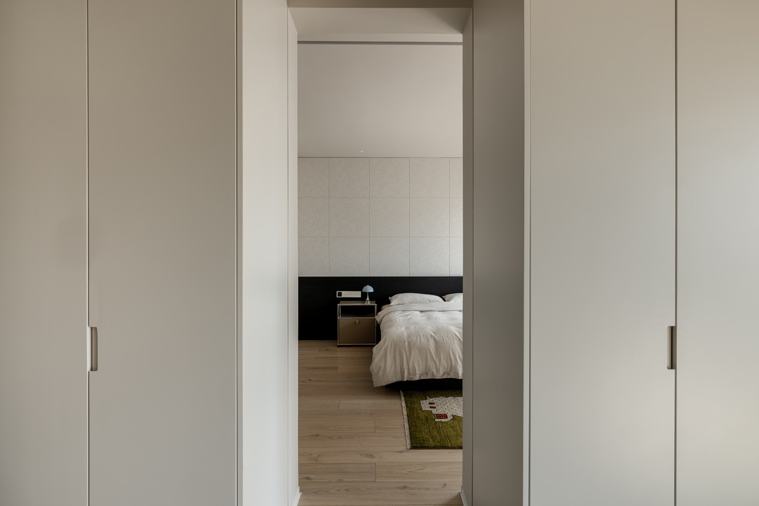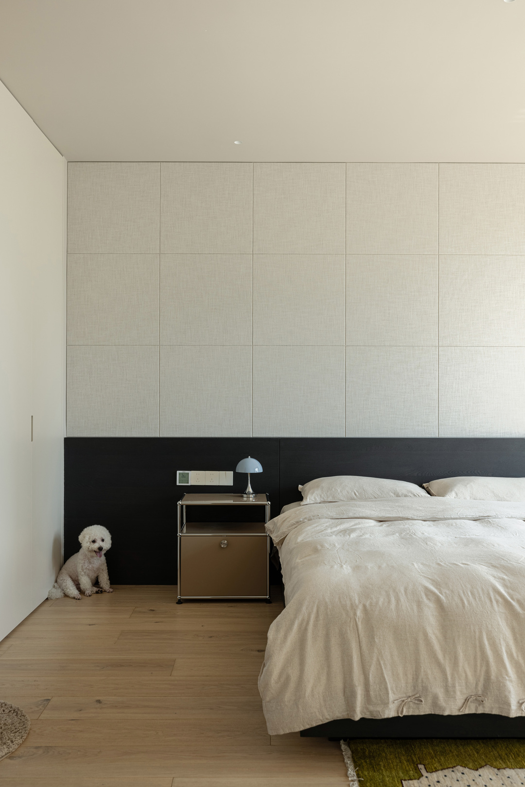 我们还将主卧的动线巧妙地融入了衣橱区域,使动线与收纳功能紧密结合,既提升了空间的利用率,也让整体的流畅感与实用性更加突出。双动线的设计进一步提升了屋主的活动灵活性与自由度。主卧则延续了简洁的中性色调,温润的影木与柔和的棉麻材质为空间增添了几分温馨,在简约的设计中散发出自然与舒适的气息。