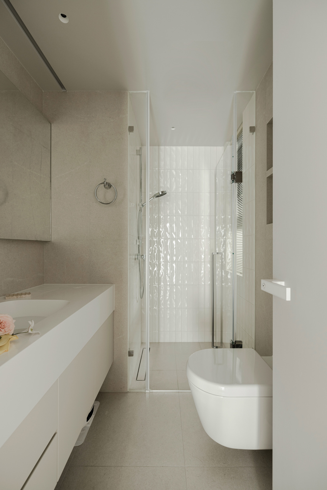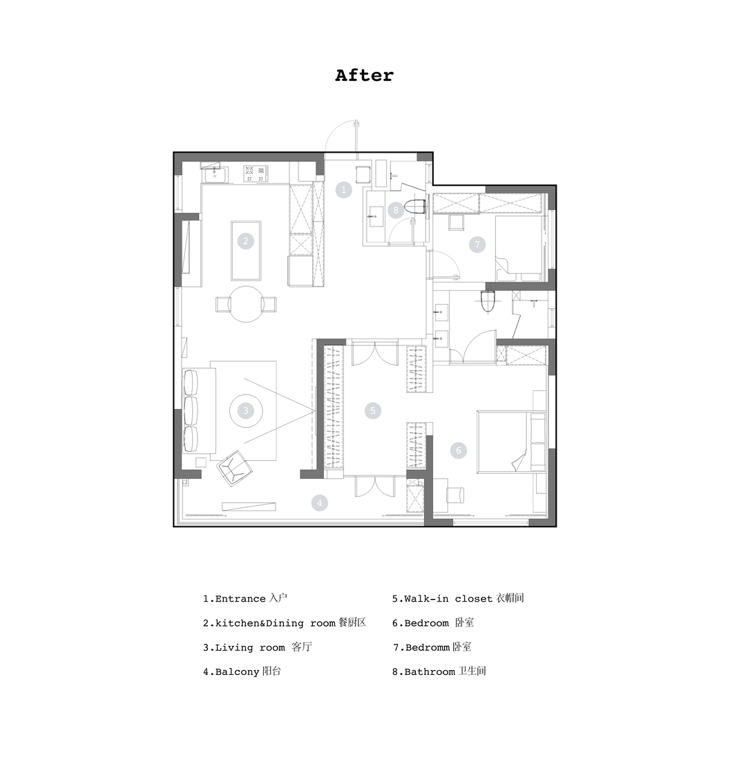 在本次户型改造中,我们重点优化了动线、重新分配了空间,并改善了采光。通过移除原户型中的储物间,配合使用透光的玻璃门,让更多自然光洒入室内,使整个空间变得更加通透明亮。此外,我们还扩大了浴室和厨房的面积,使其从仅满足基本需求提升为更加舒适、宽敞的使用体验,进一步提升了居住的舒适感。