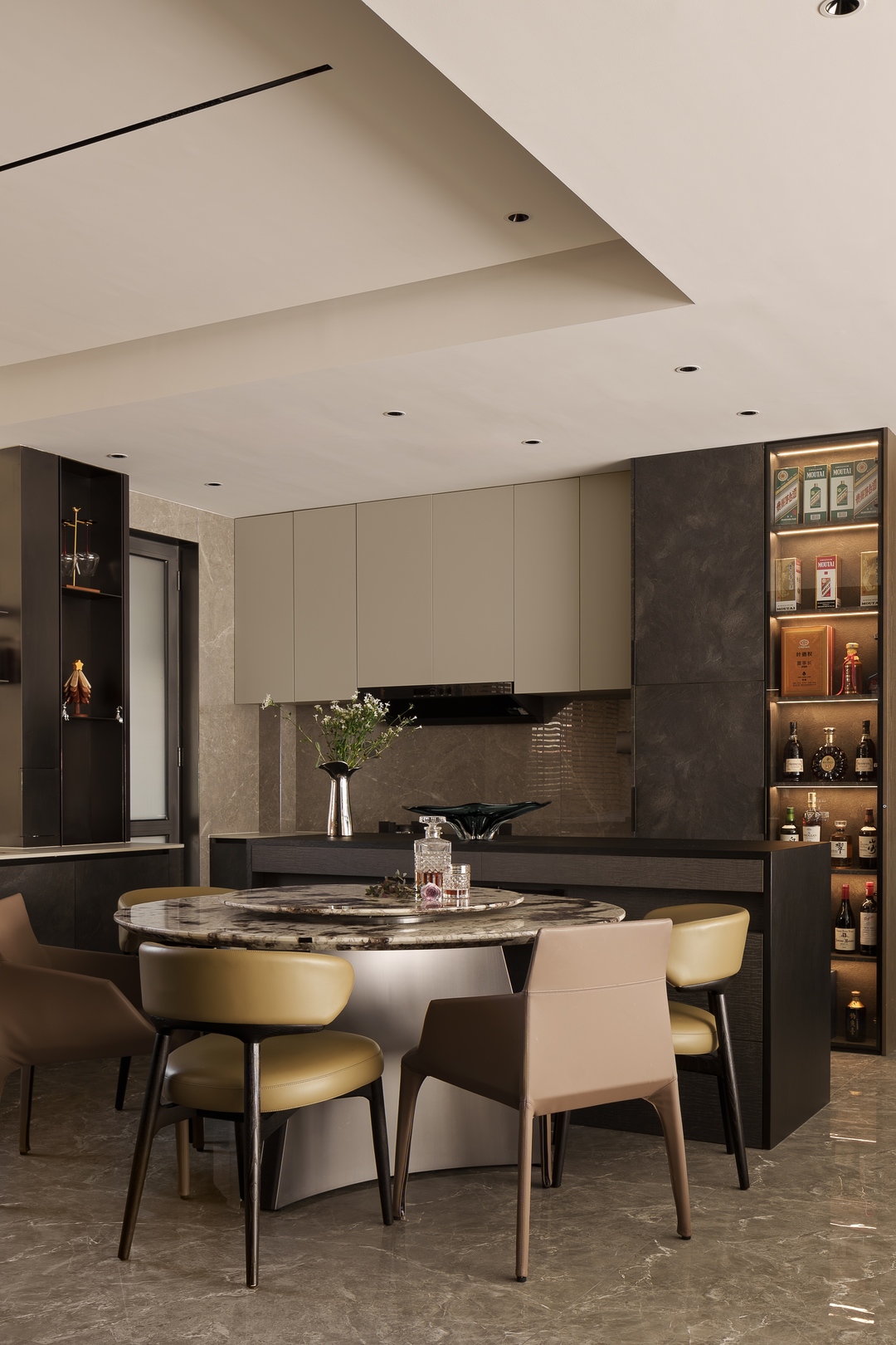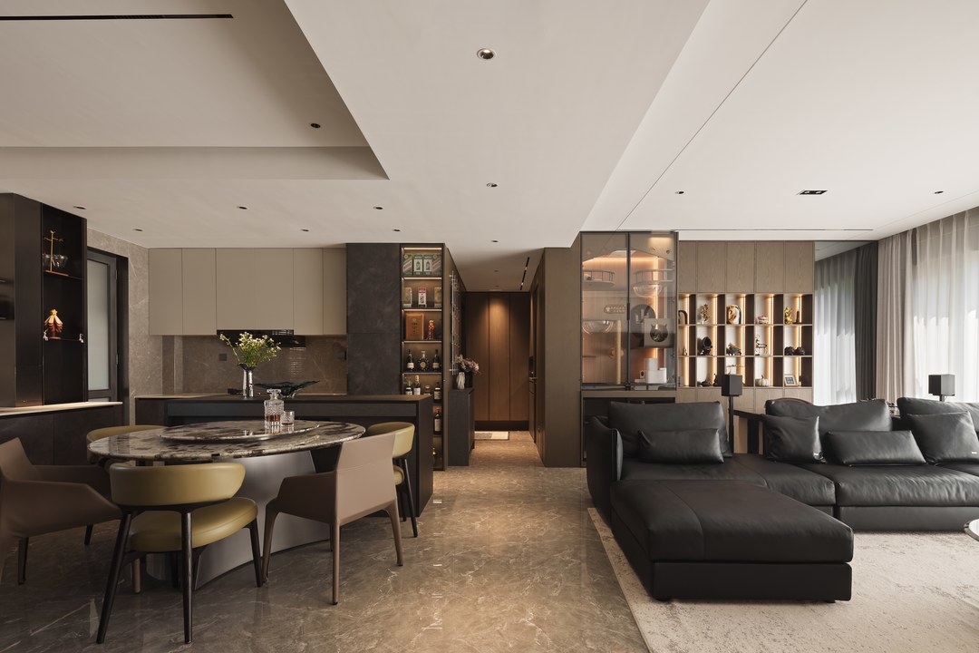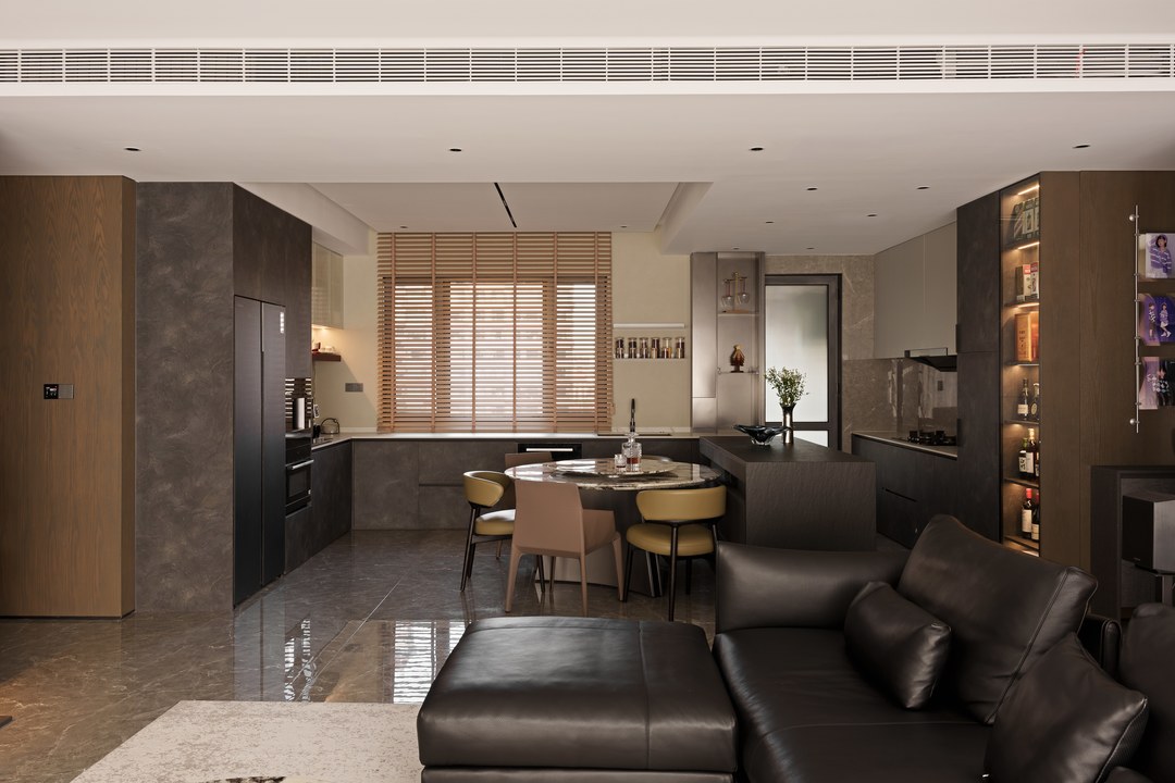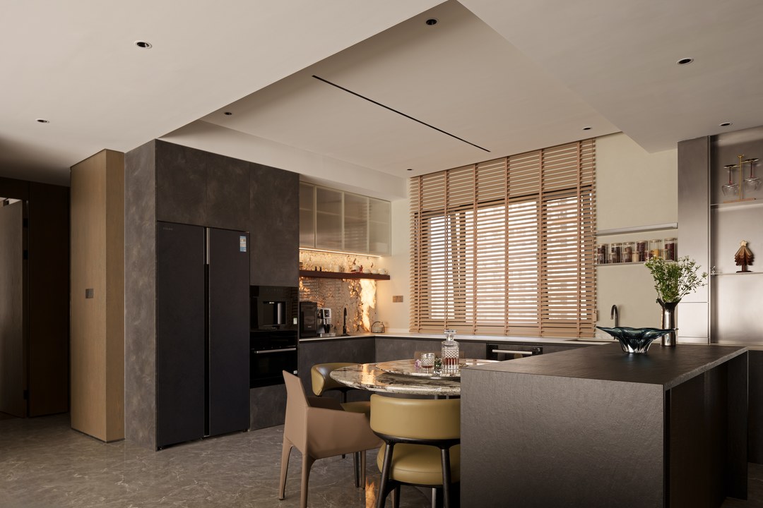 餐厨重新做开放式一体设计,延续客厅的高级沉稳