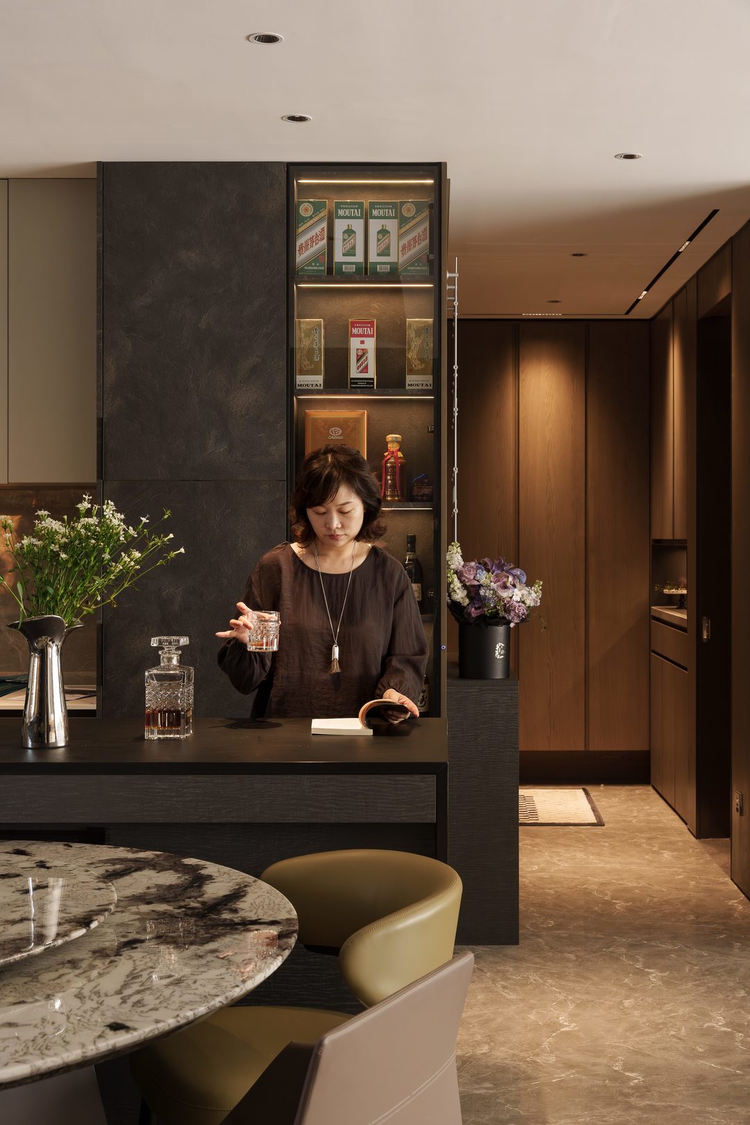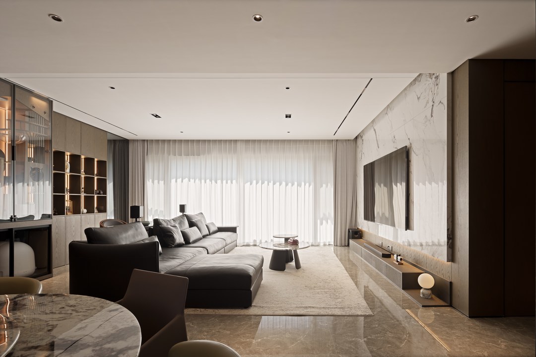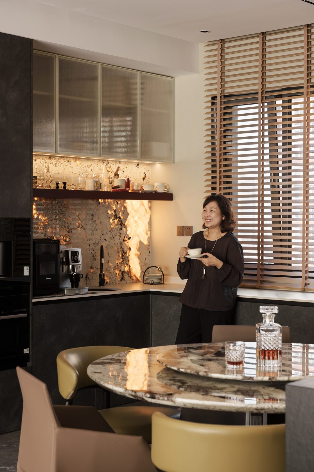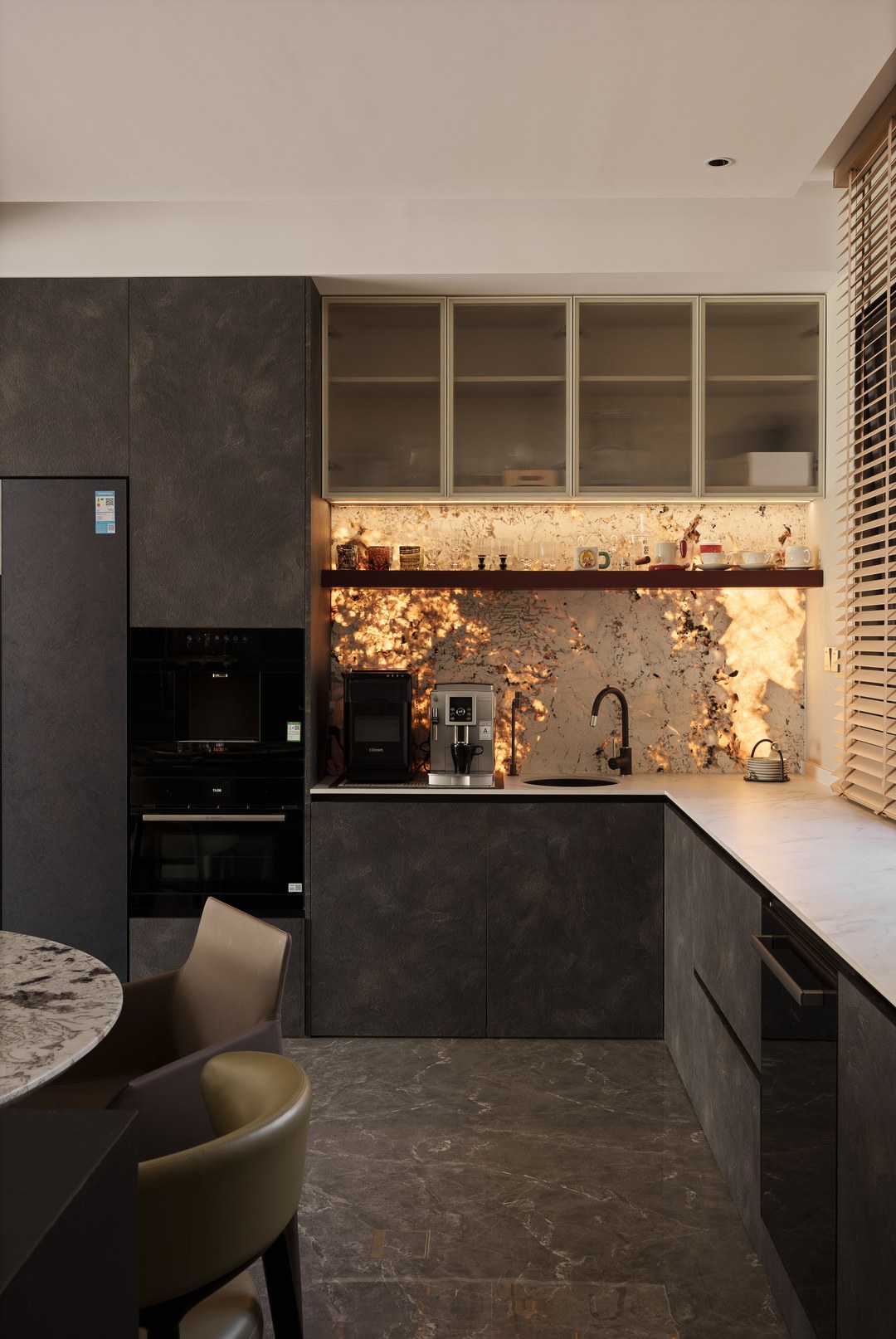 餐厨重新做开放式一体设计,延续客厅的高级沉稳
