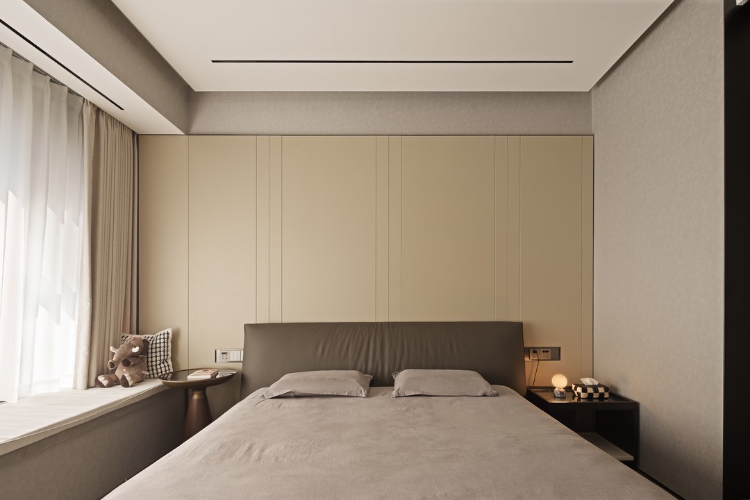 卧室软装搭配了床品,面料和飘窗台,用灯光材质和色彩为休息区增加浪漫的氛围
