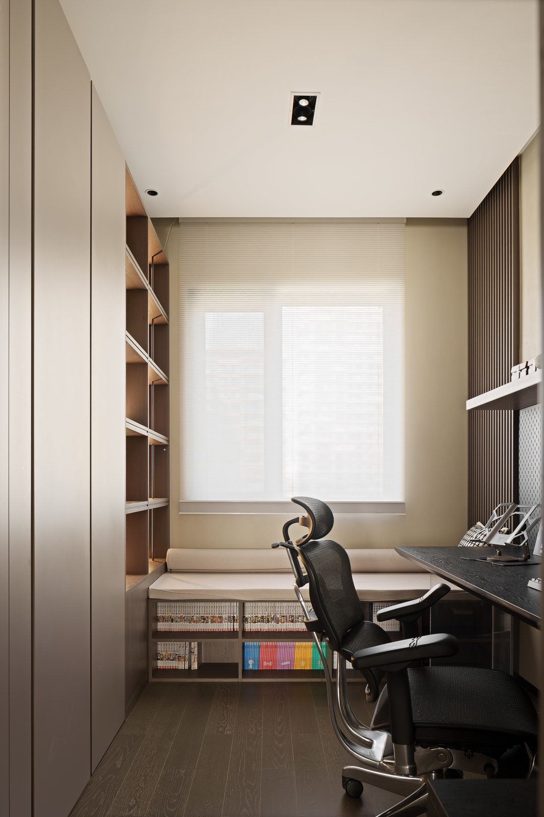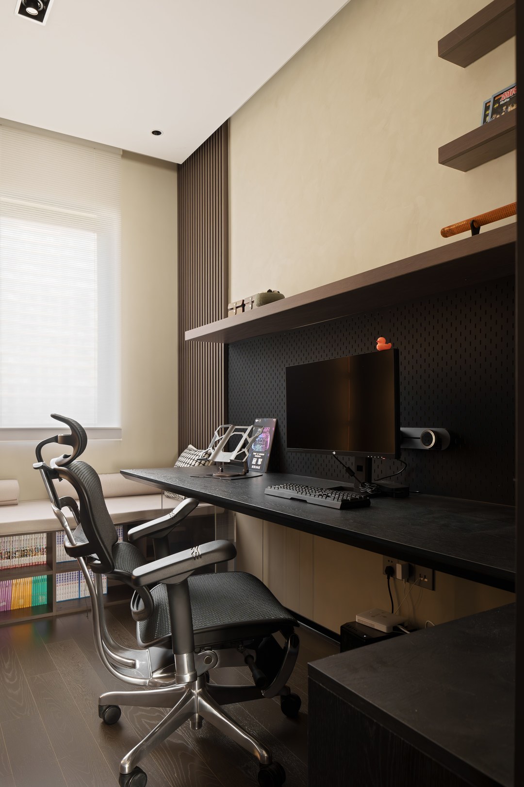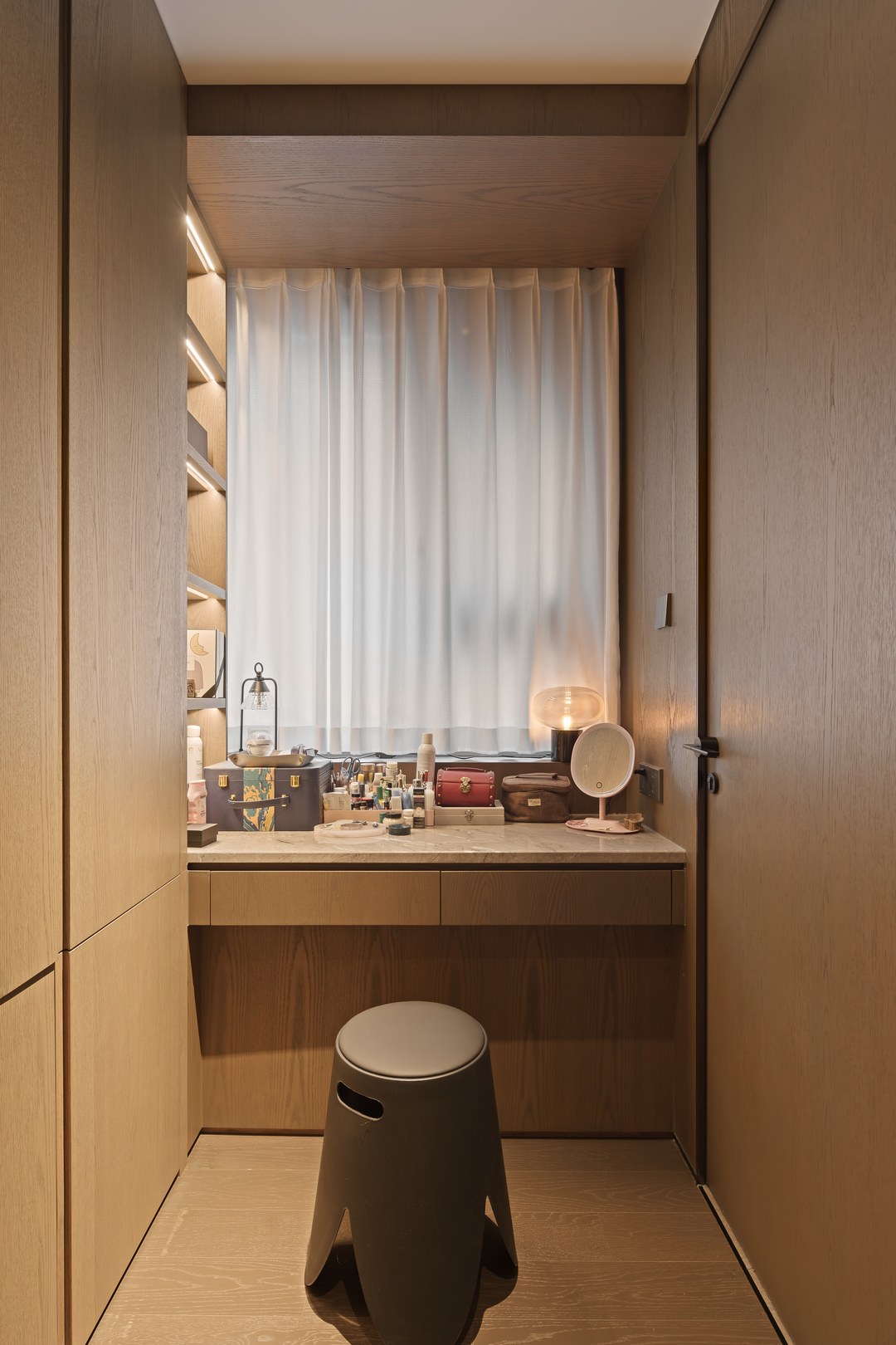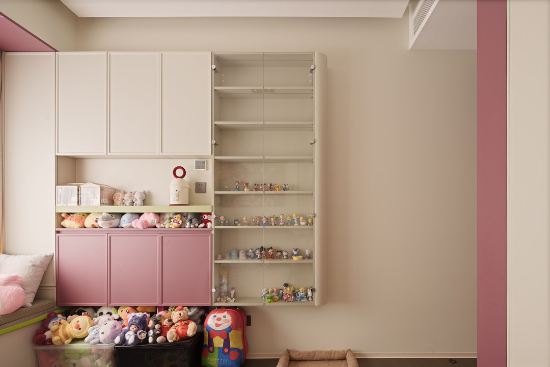 女孩房是暮光紫色系。开放格,定制盲盒玻璃展示柜,可以自己摆放喜欢的手办