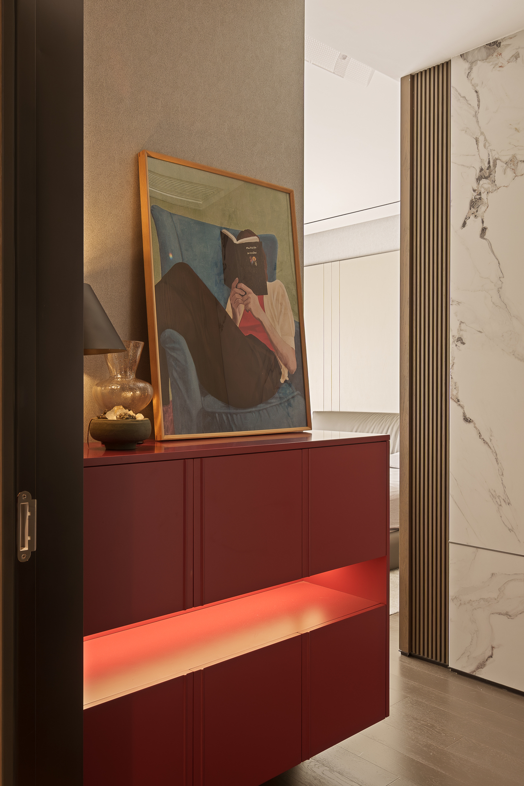 主卧睡眠区内玄关定制勃肯地红色边柜,