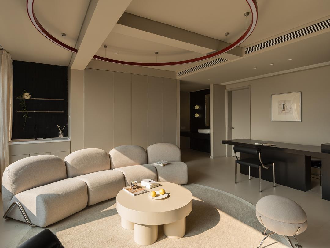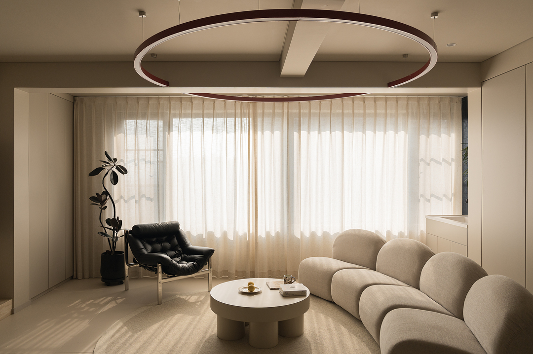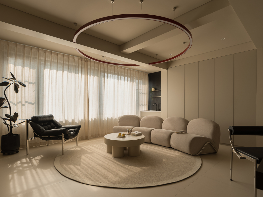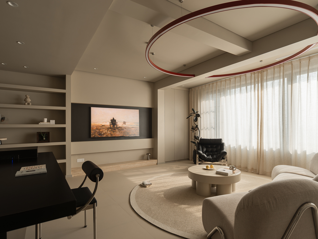 搭配环形吊灯,不仅柔化了横梁的存在感,还让视觉焦点聚集到客厅沙发区域。