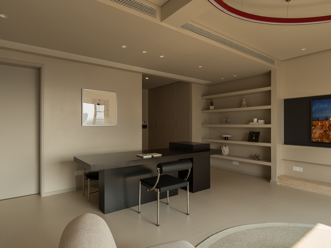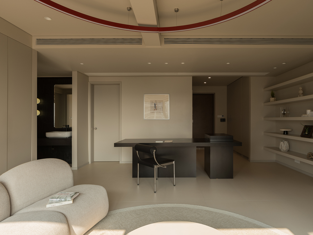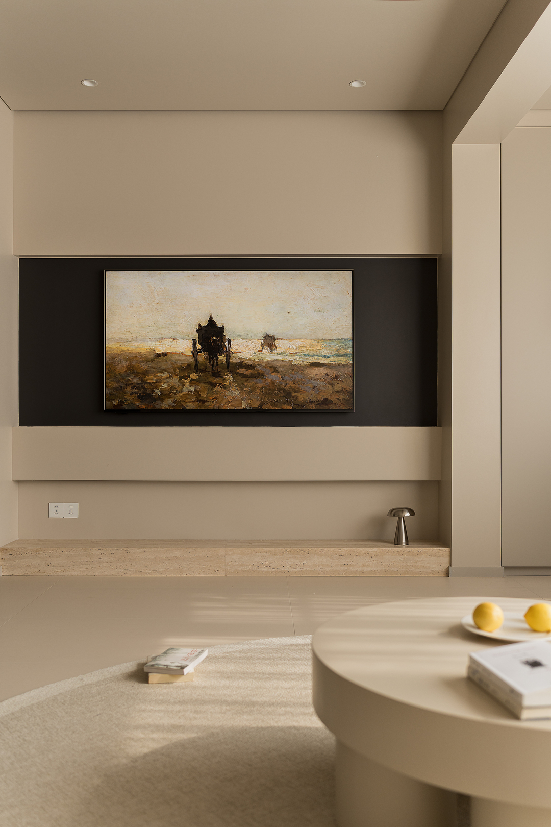 搭配环形吊灯,不仅柔化了横梁的存在感,还让视觉焦点聚集到客厅沙发区域。