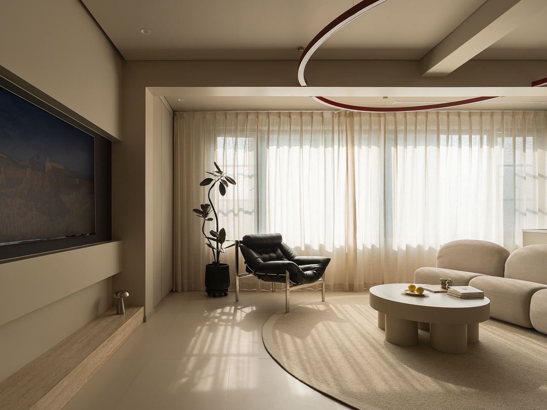 圆形地毯+弧形沙发+环形吊灯,让整个空间的线条流畅自然,削弱横梁带来的突兀感。