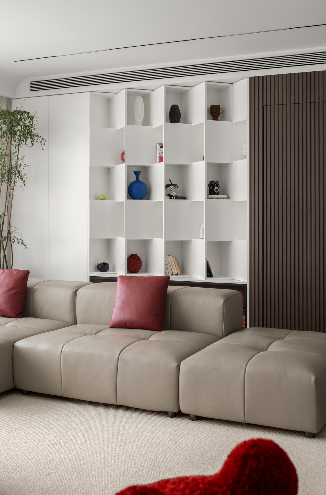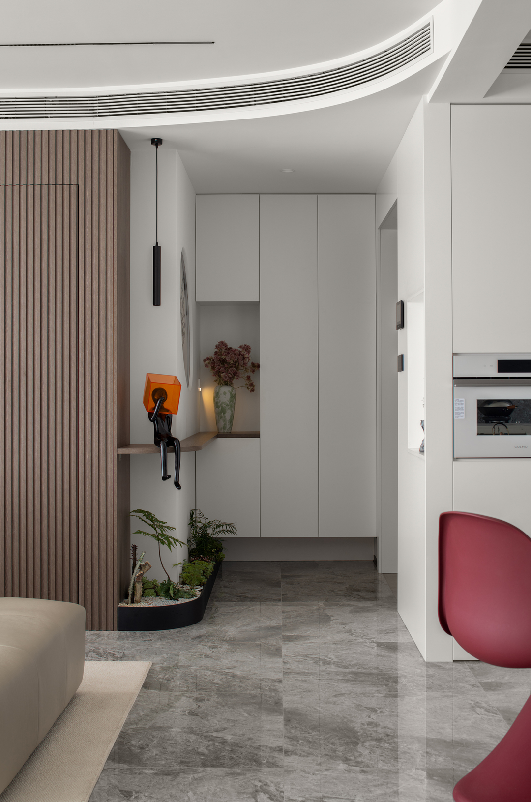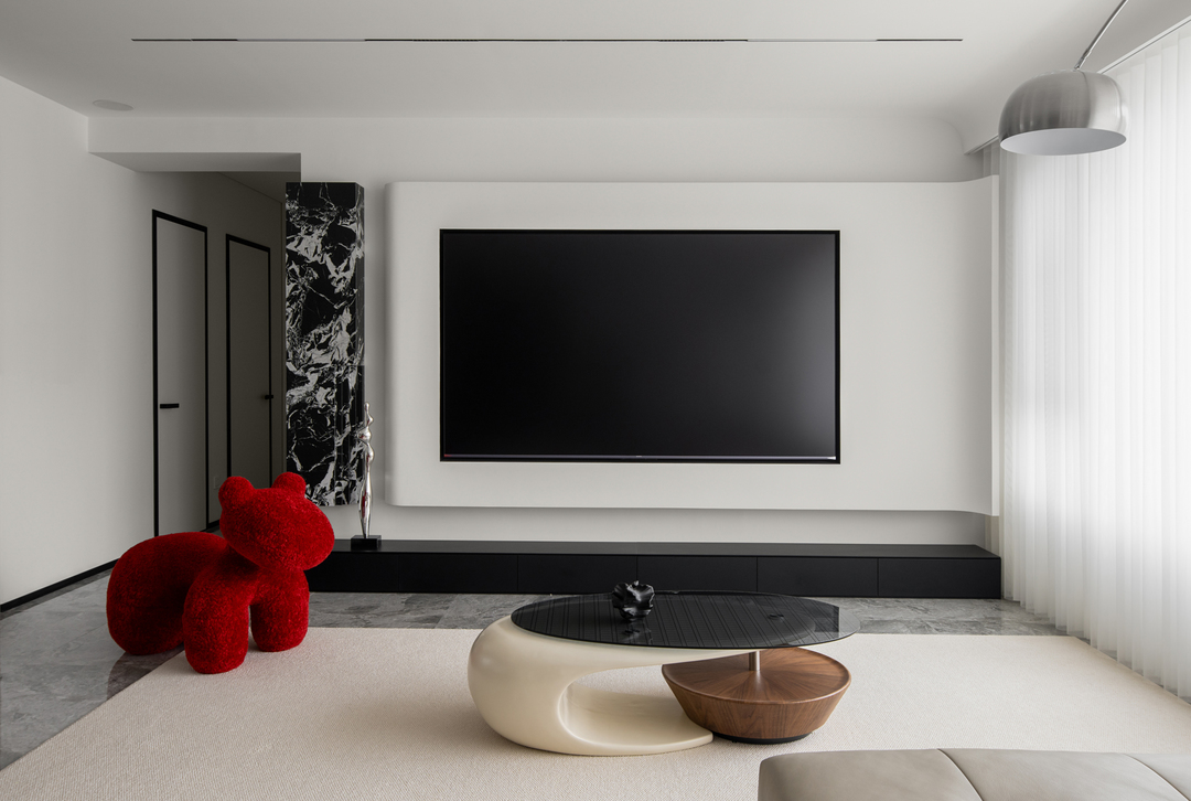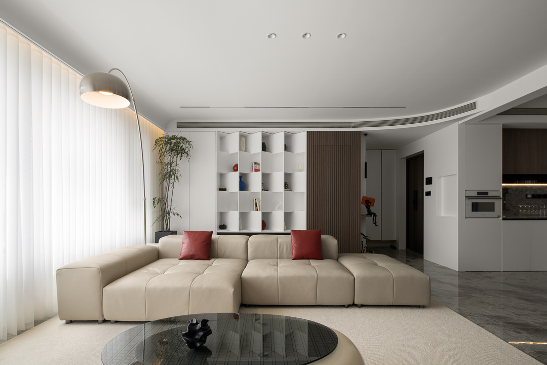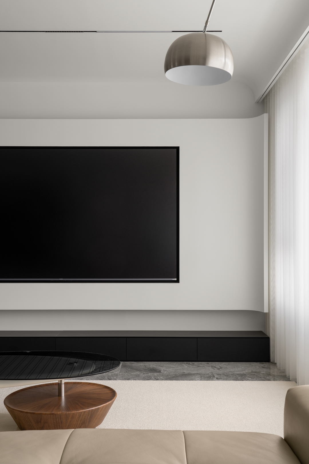 电视墙简洁的白色弧形造型,搭配黑色的长条地柜,简约大气。沙发后的展示架打破常规的规整布局,为空间带来灵动的艺术氛围。绿植和木色格栅增加自然元素,次卧的隐形门也藏于其中。