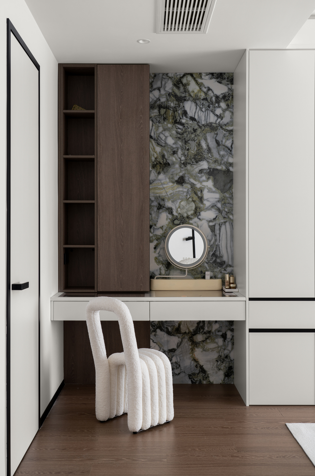 进门梳妆台区域利用角落空间,与旁边的床尾收纳柜相连,背景墙采用的大理石材质,提升空间的精致感。搭配的白色毛绒椅子造型独特,深棕色的地板增加了空间的稳重感。