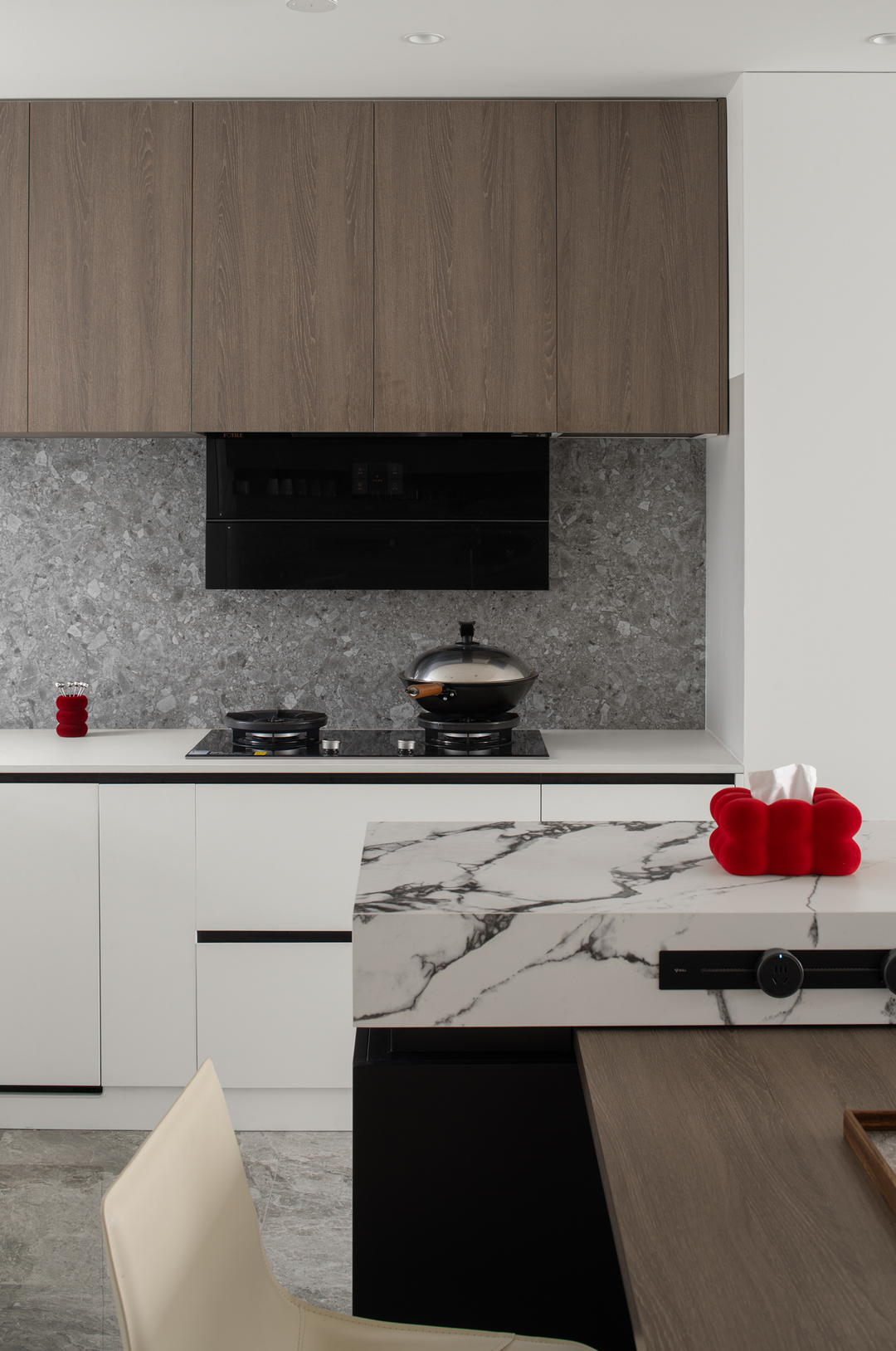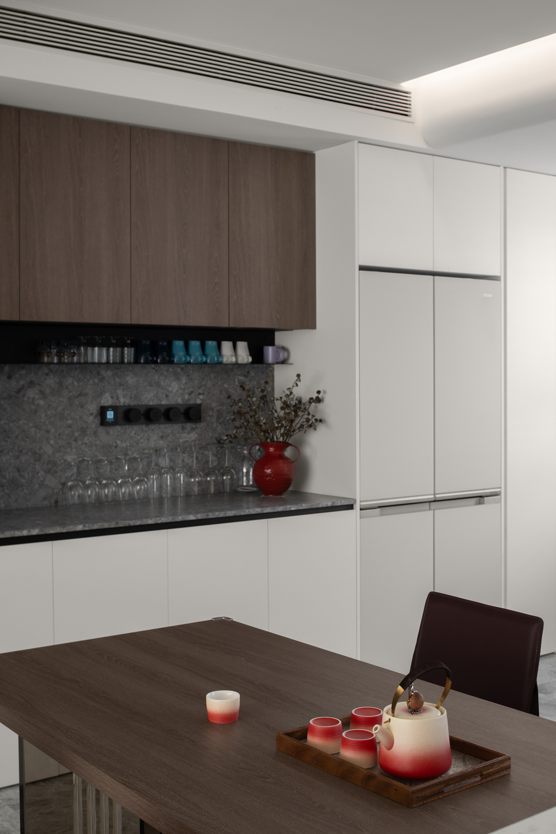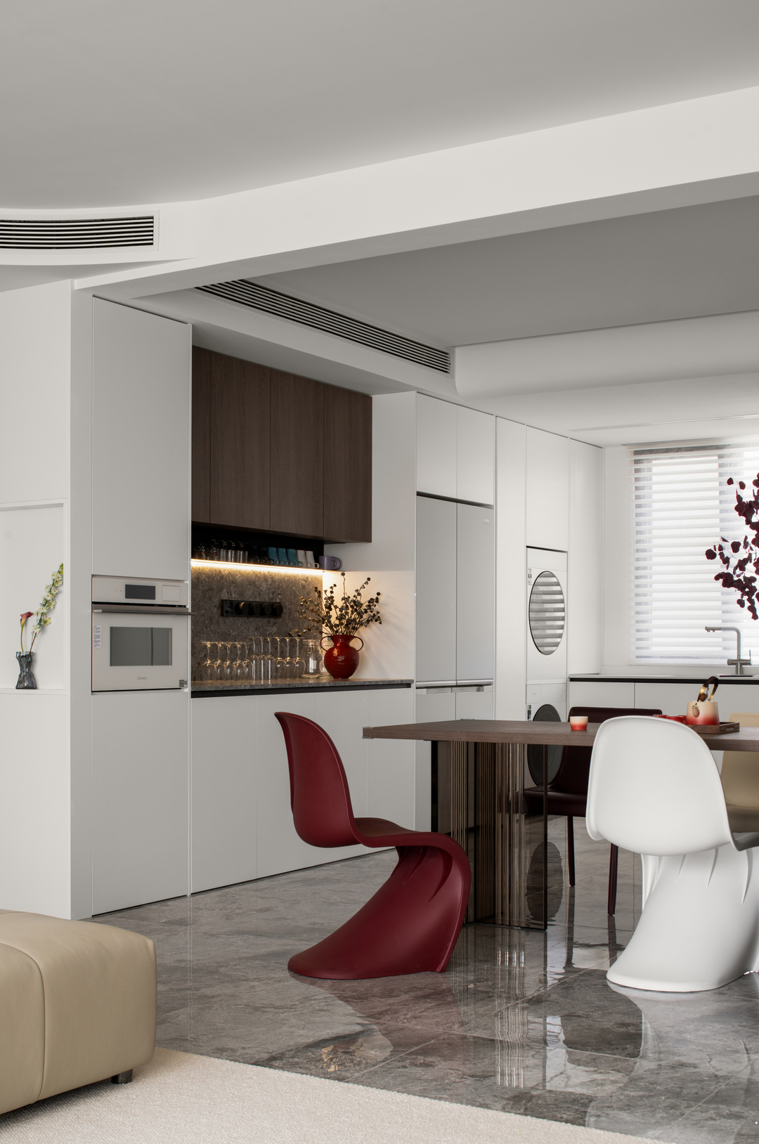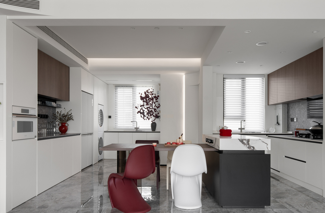 餐厨采用开放式设计,形成一个连贯的空间。岛台餐桌居中布置,连接了中厨区和西厨区。家政区位于角落,不占用主要活动空间,外观统一整洁。