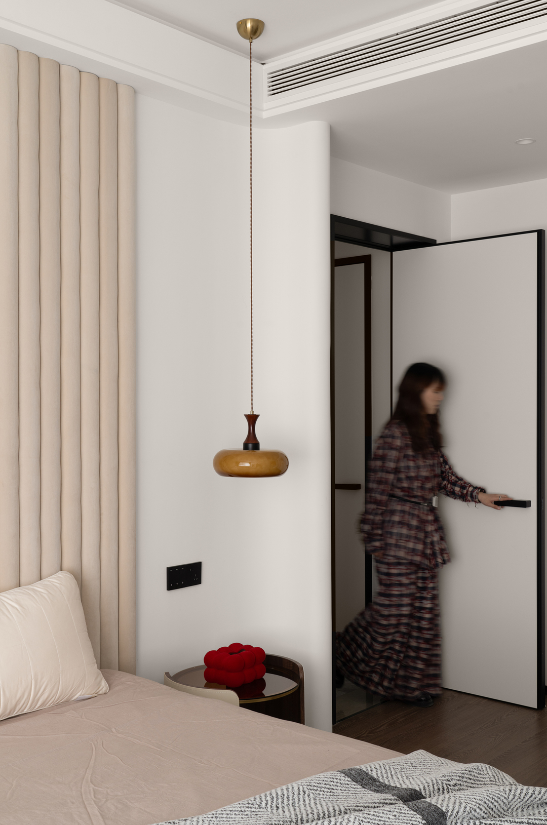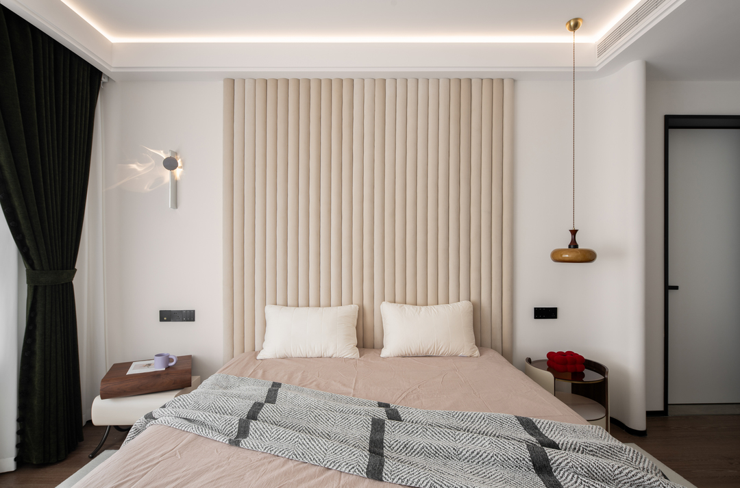 主卧整体以米白色的柔和色调为主,床头背景墙采用竖条纹软包设计增加了空间的立体感与层次感,不同材质和造型的吊灯、壁灯相互映衬,成为空间中的装饰亮点。