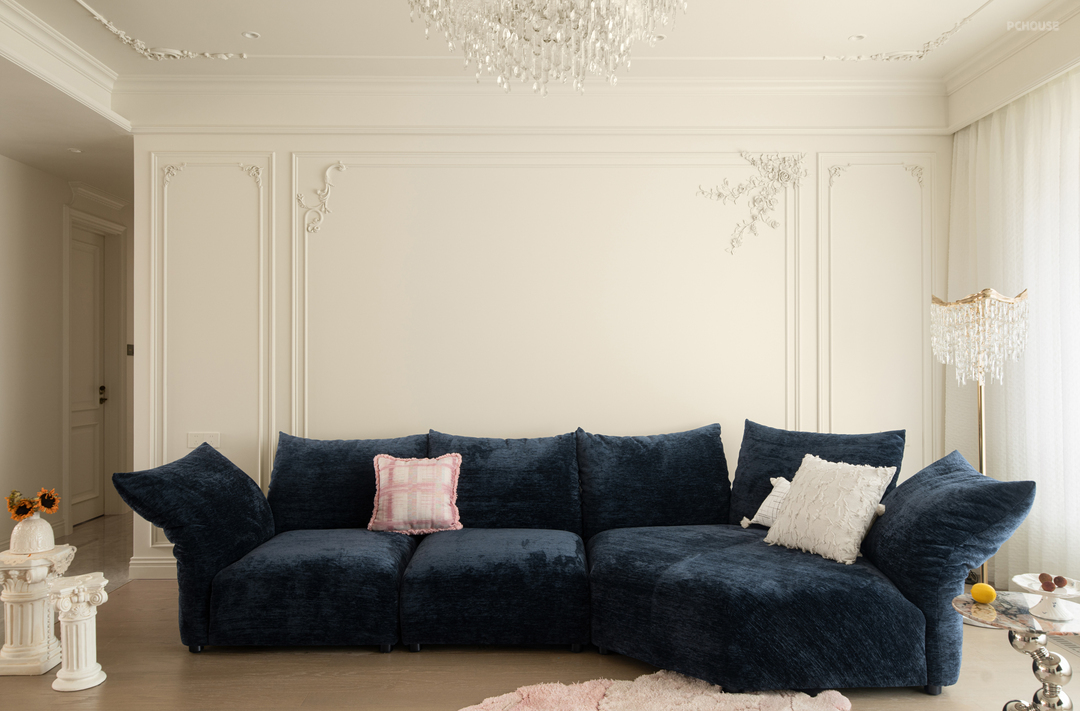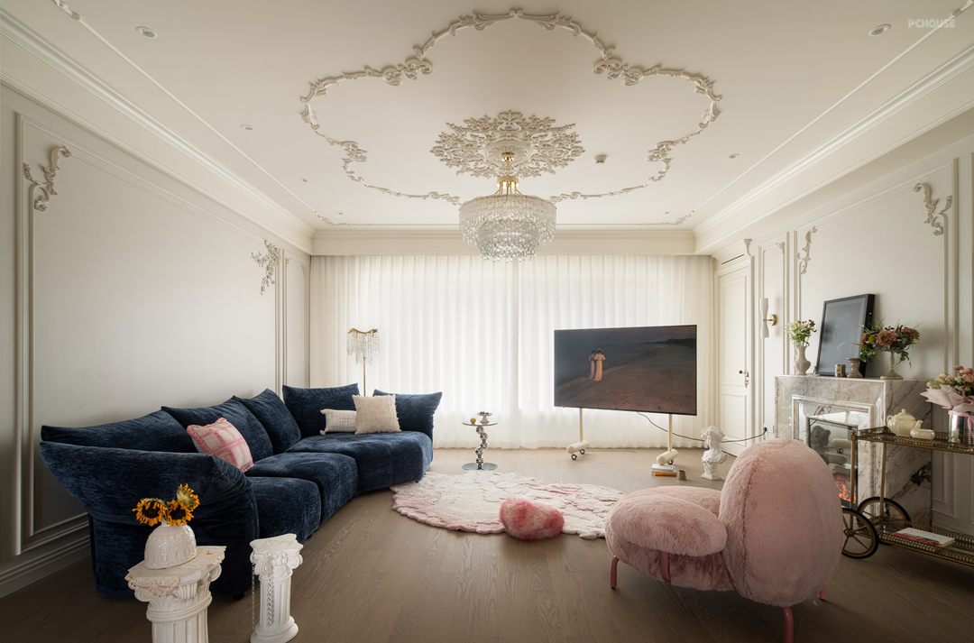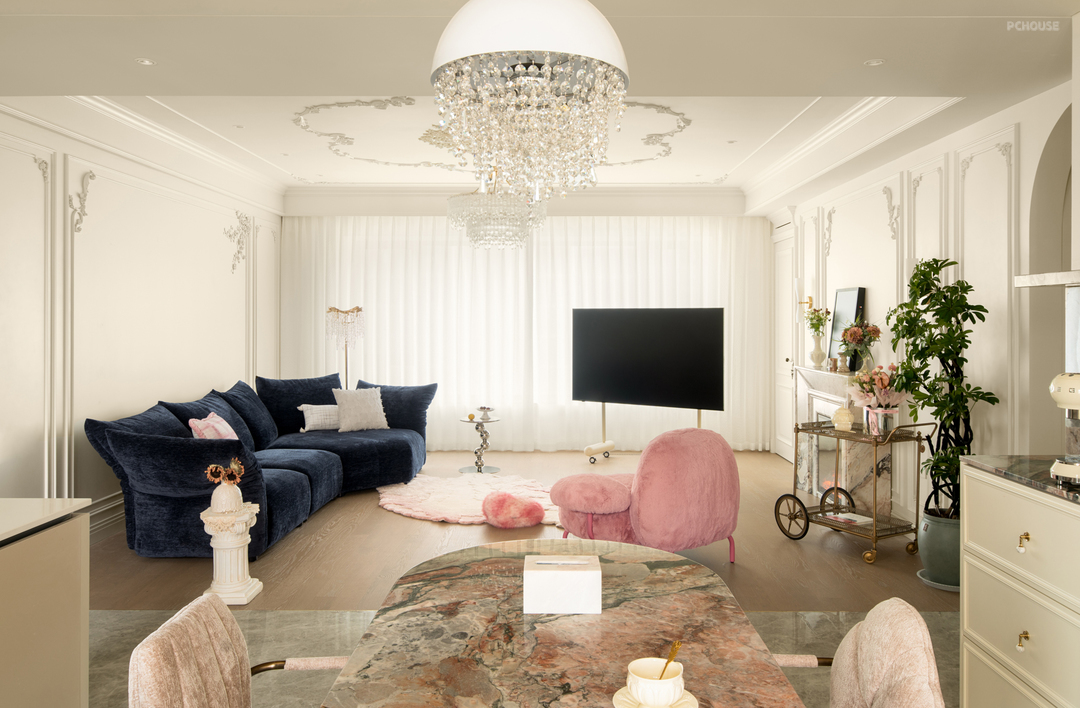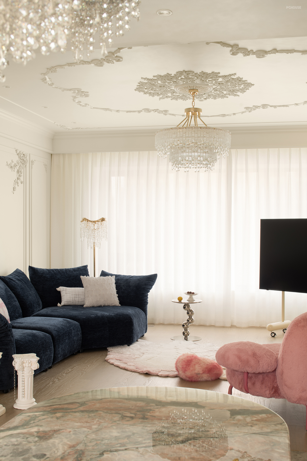 会客厅做围坐式布局,以大面积留白保证空间通透舒适性,大体量蓝色花瓣沙发是整个客厅的视觉中心,搭配业主喜爱的粉色可移动单人椅、水晶落地灯、造型感边几等个性特别的家居软装,优雅不失质感。