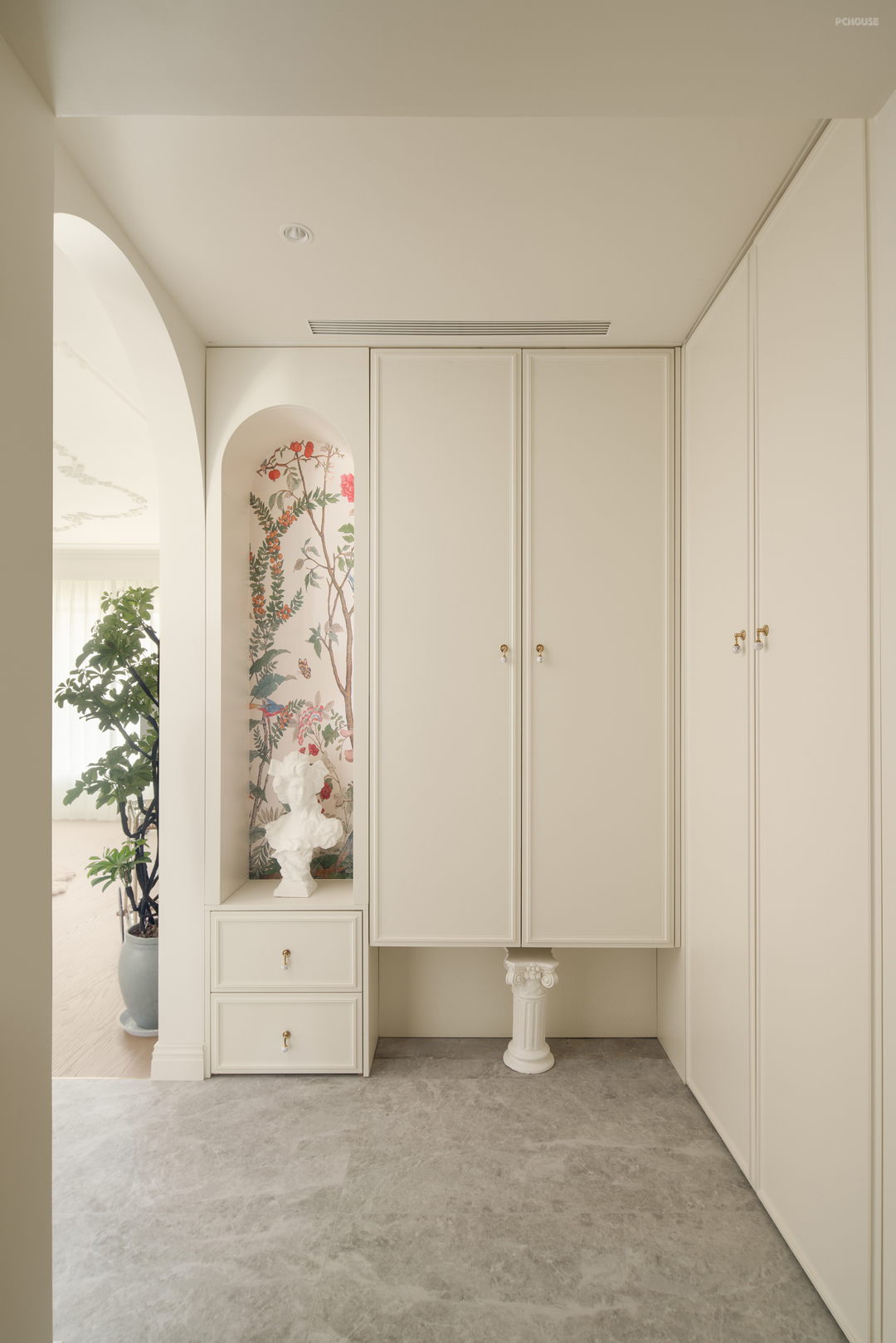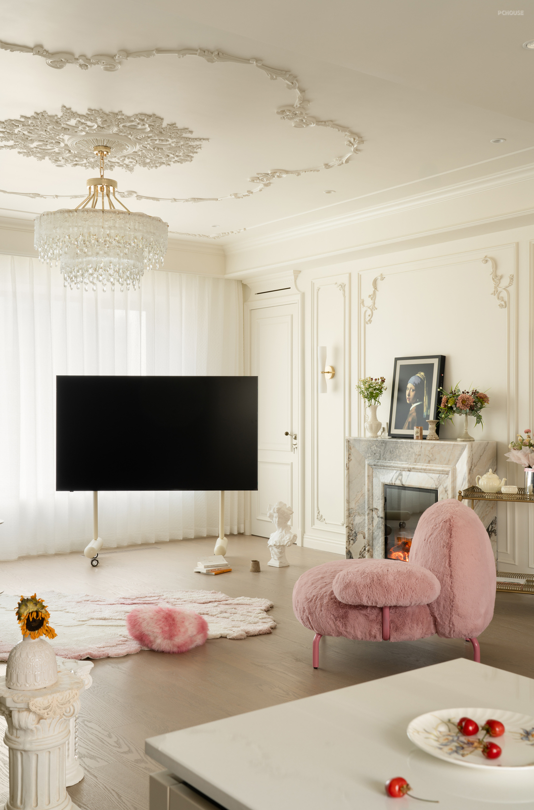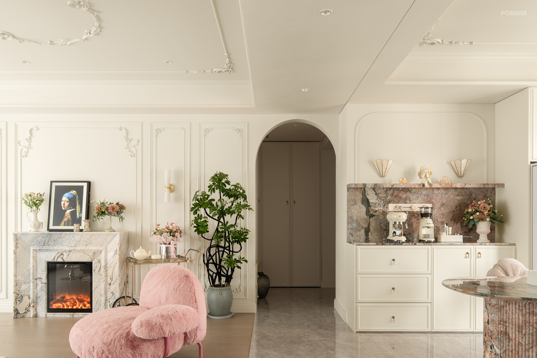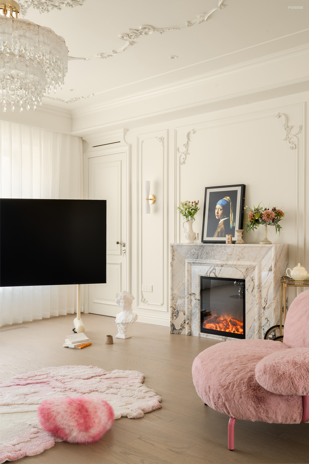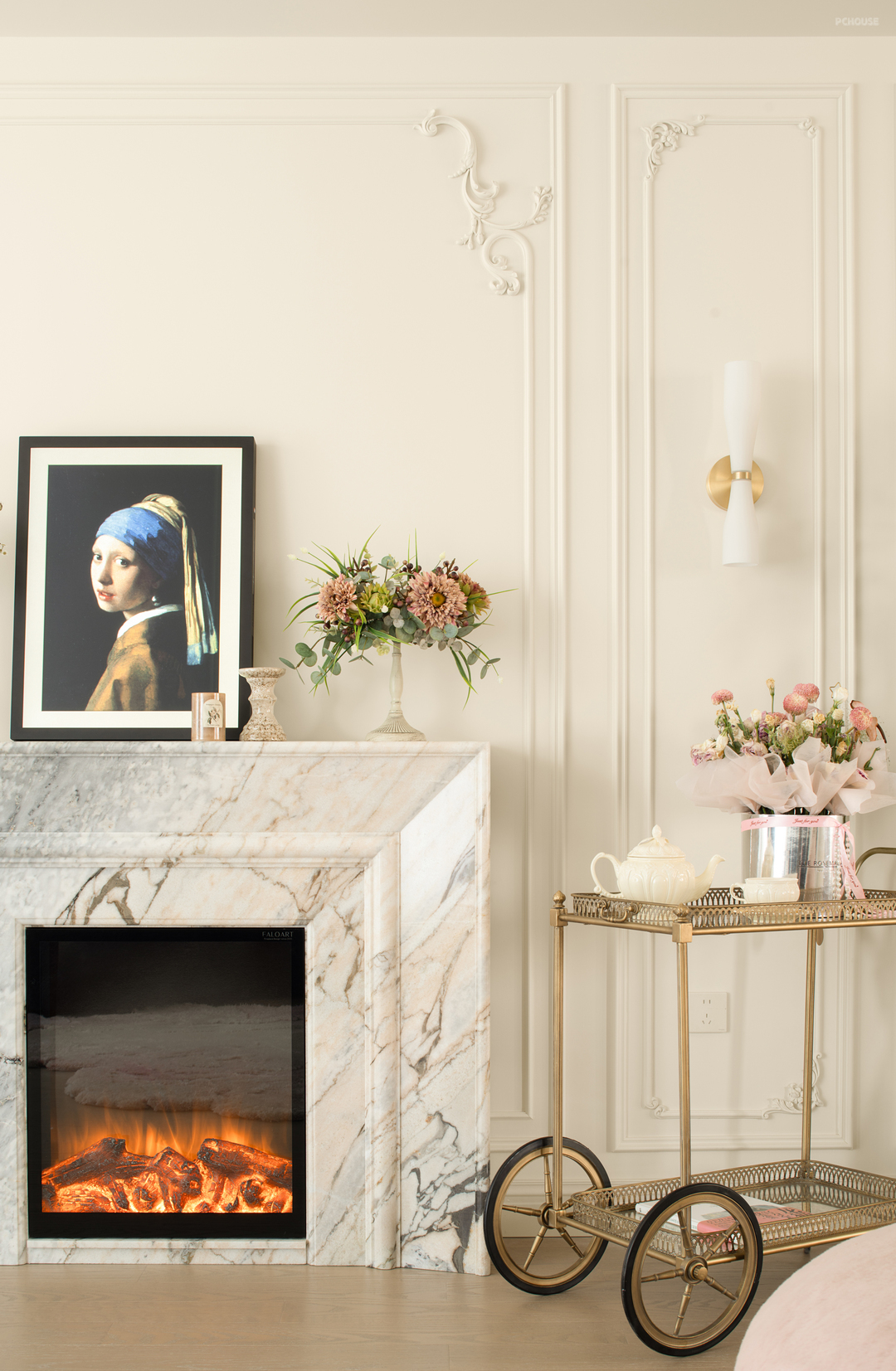 原始电视墙改为法式壁炉,可移动电视更灵活且方便使用。这一面将法式的精致、浪漫与克制发挥到极致,与沙发一侧融合的恰到好处。大理石造型电子壁炉、小体量法式线条雕刻、复古花篮推车、花卉装饰、壁画音响、壁挂灯,精致的细节叠加成电影感十足的法式家。