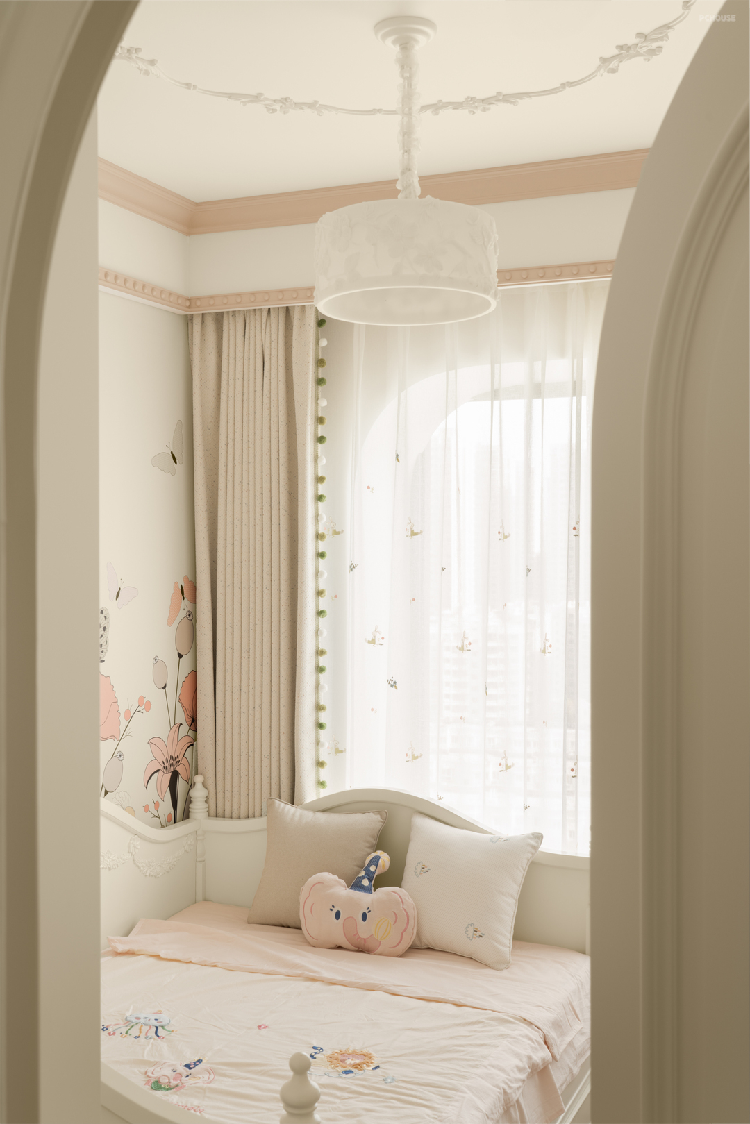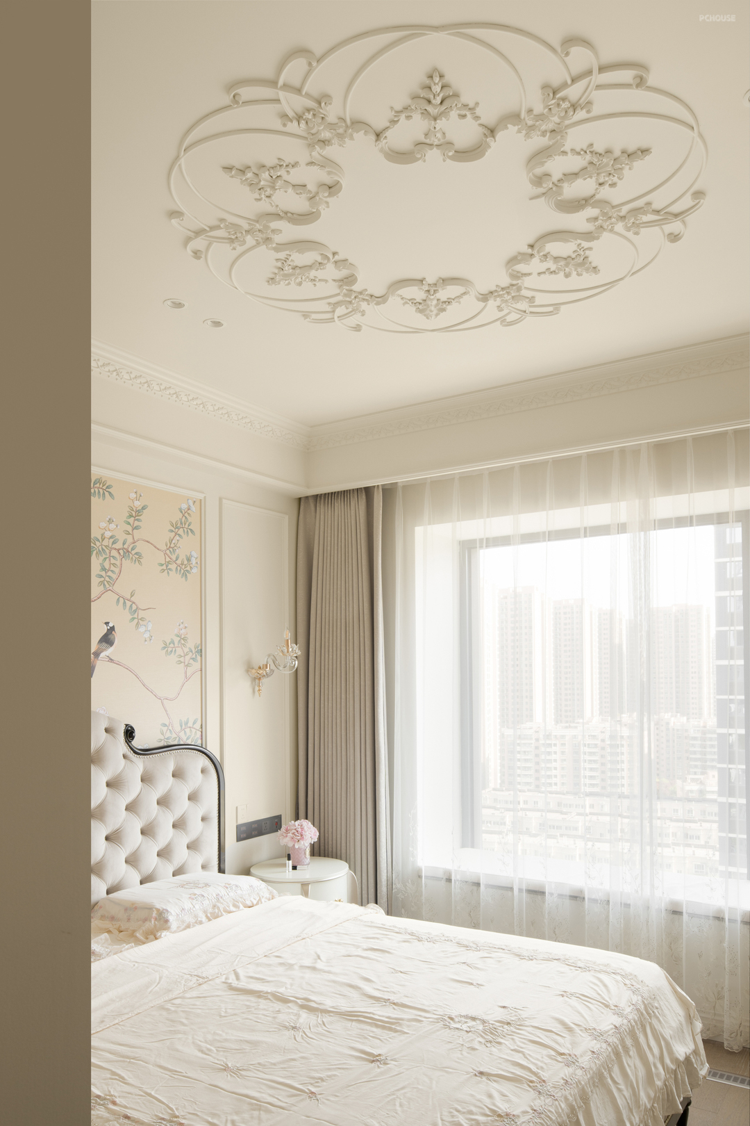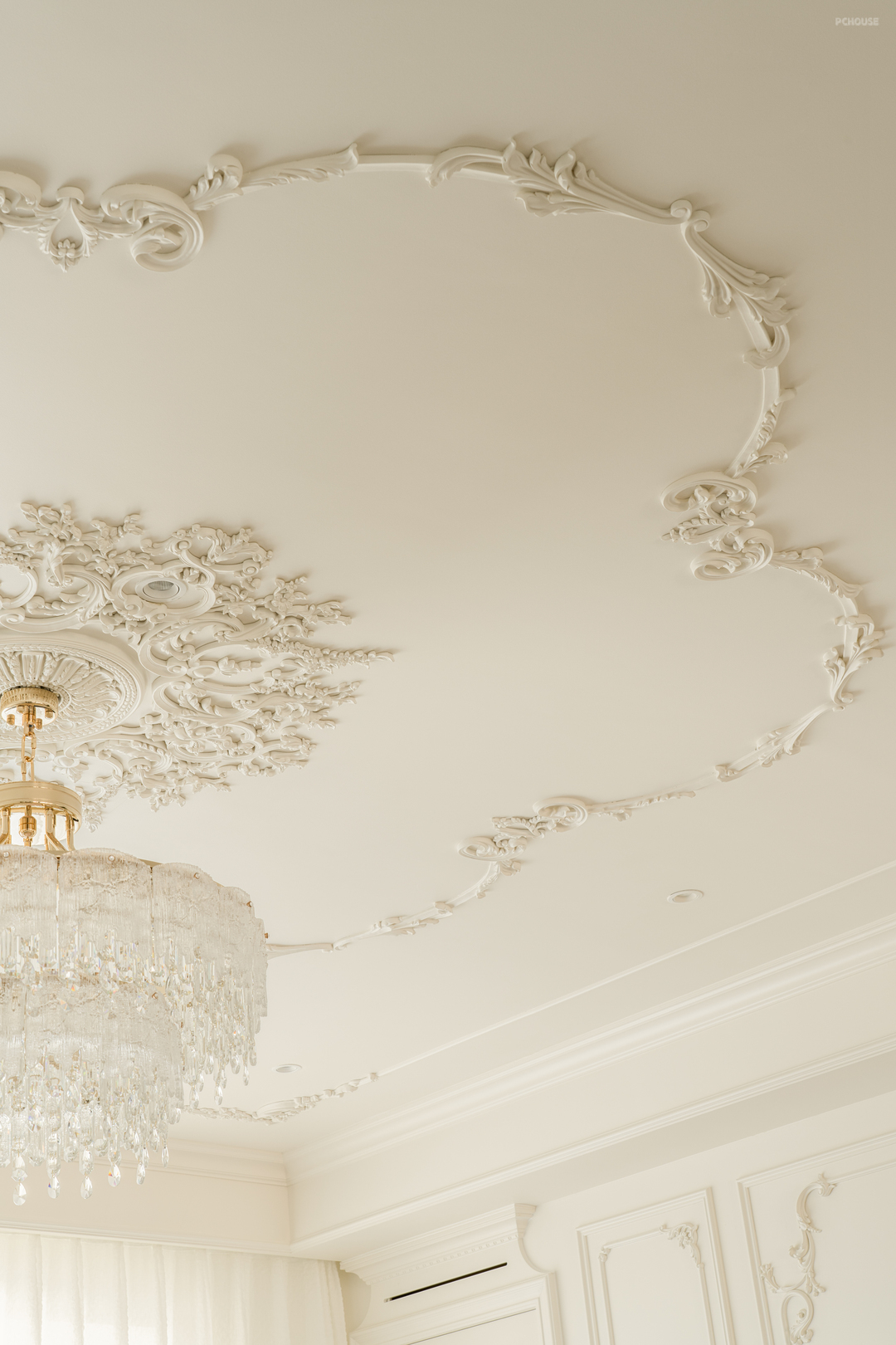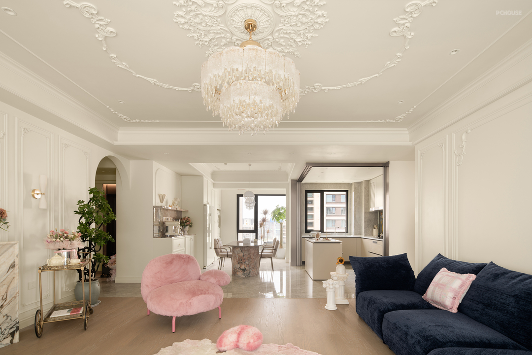 设计师特意设计的顶面线条,搭配大体量水晶吊灯,更加梦幻。客餐厅一体设计,在餐厅也可以自由看电视。次卧门隐藏在法式背景墙中完全不会破坏空间整体性。