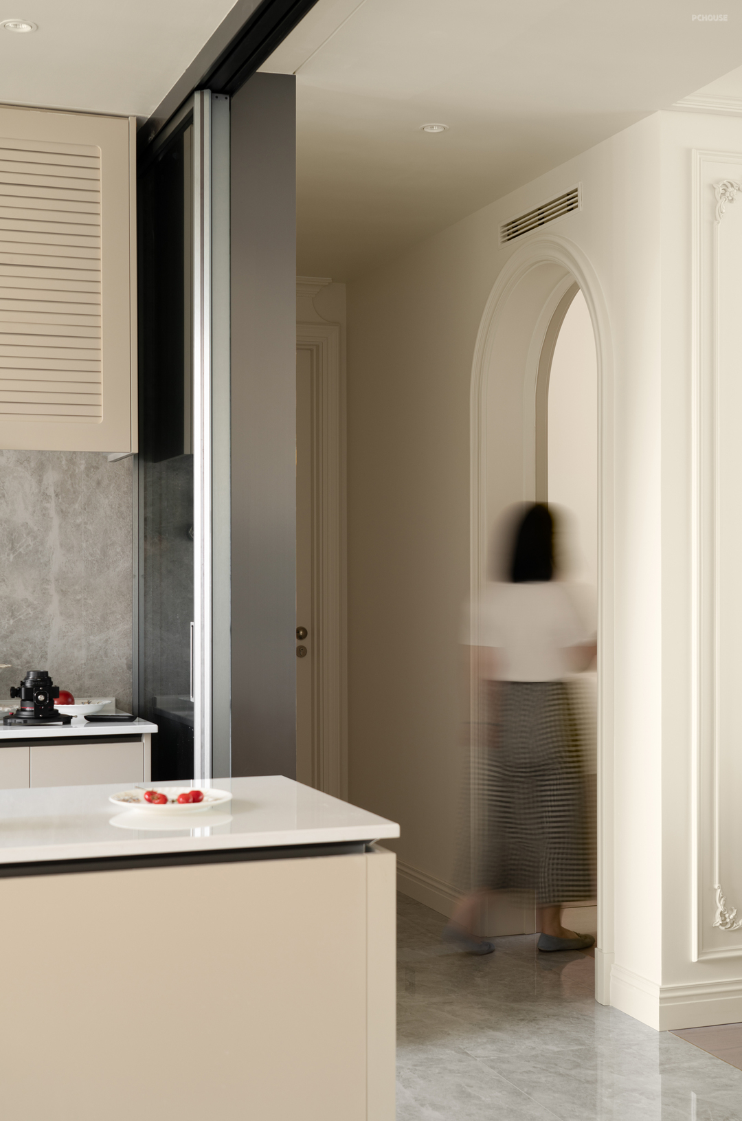 客餐厅一体且保留两侧采光的好处就是无论从客厅看向餐厨还是从另一方向,空间都开阔舒适,视野特别通透。厨房保留原始设计做无地轨推拉门,可以自由切换开放式与封闭式。