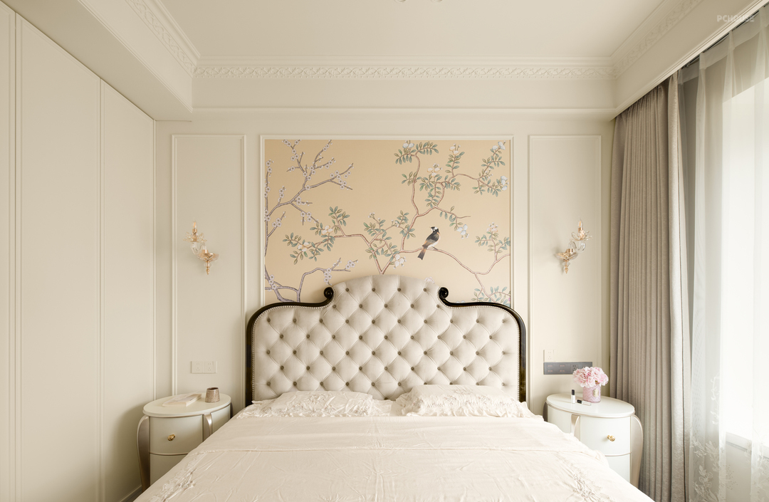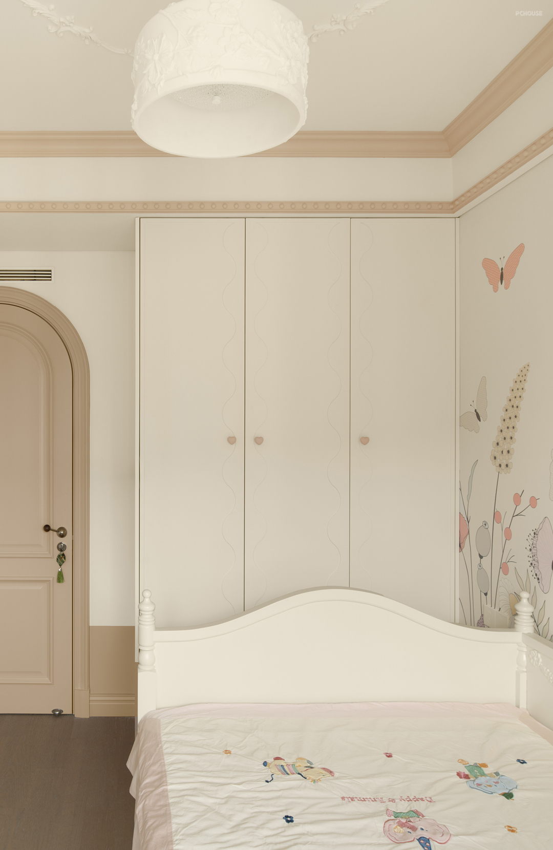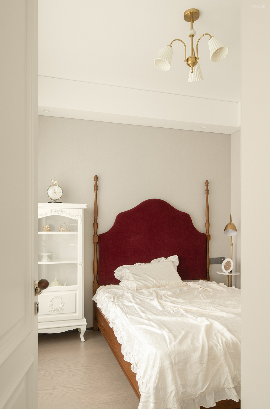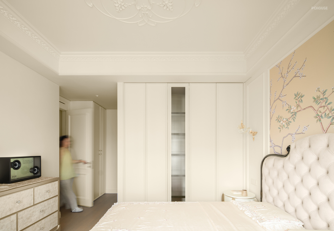 主卧睡眠区与衣柜区清晰划分。整体保持温柔的暖白色,无主灯设计以水晶壁灯及床头射灯做光源,床尾放置斗柜增加层次感。