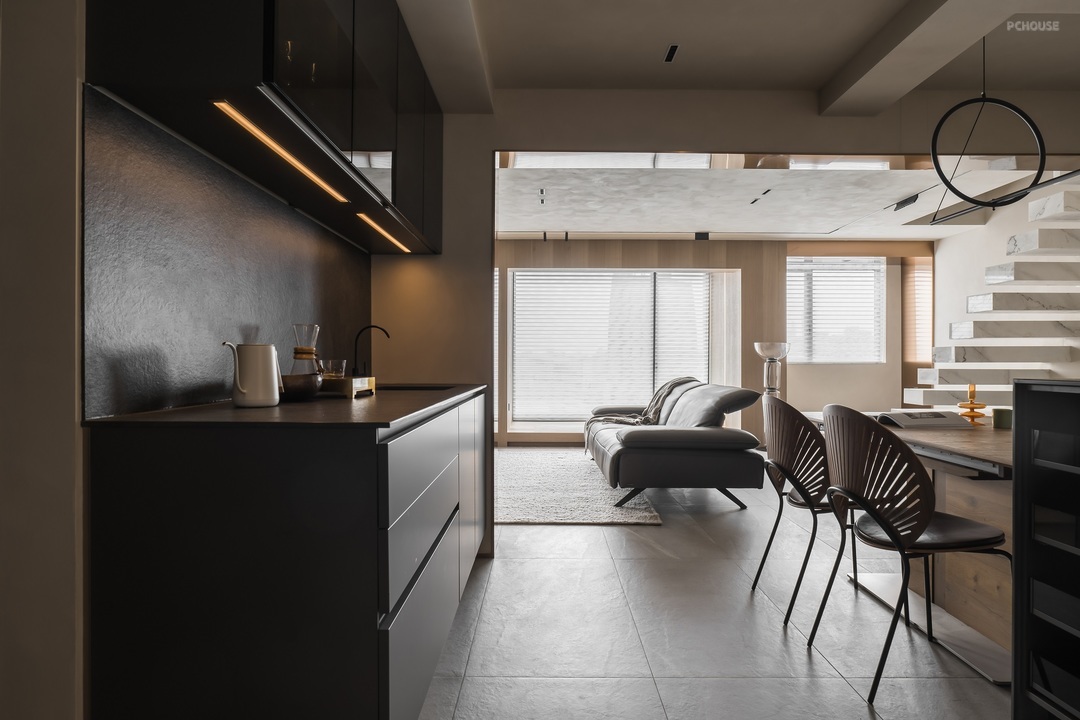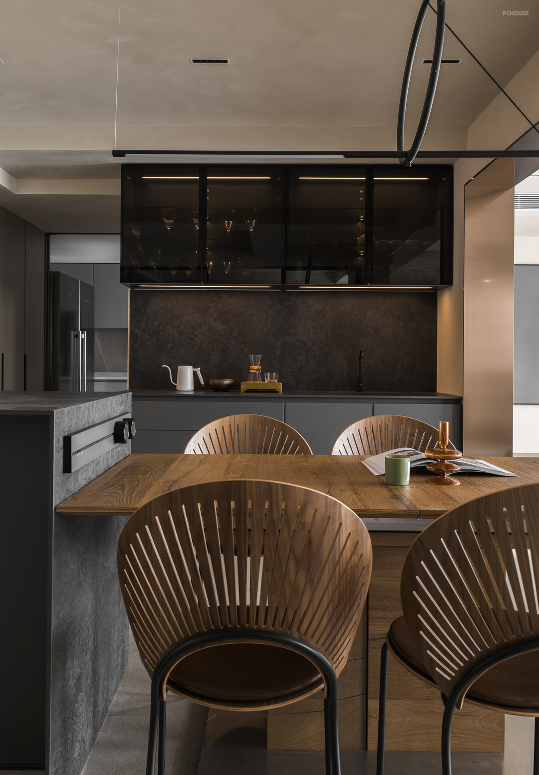 餐厅选用了火山岩岩板和原木的材质碰撞,体现出一种自然的感觉