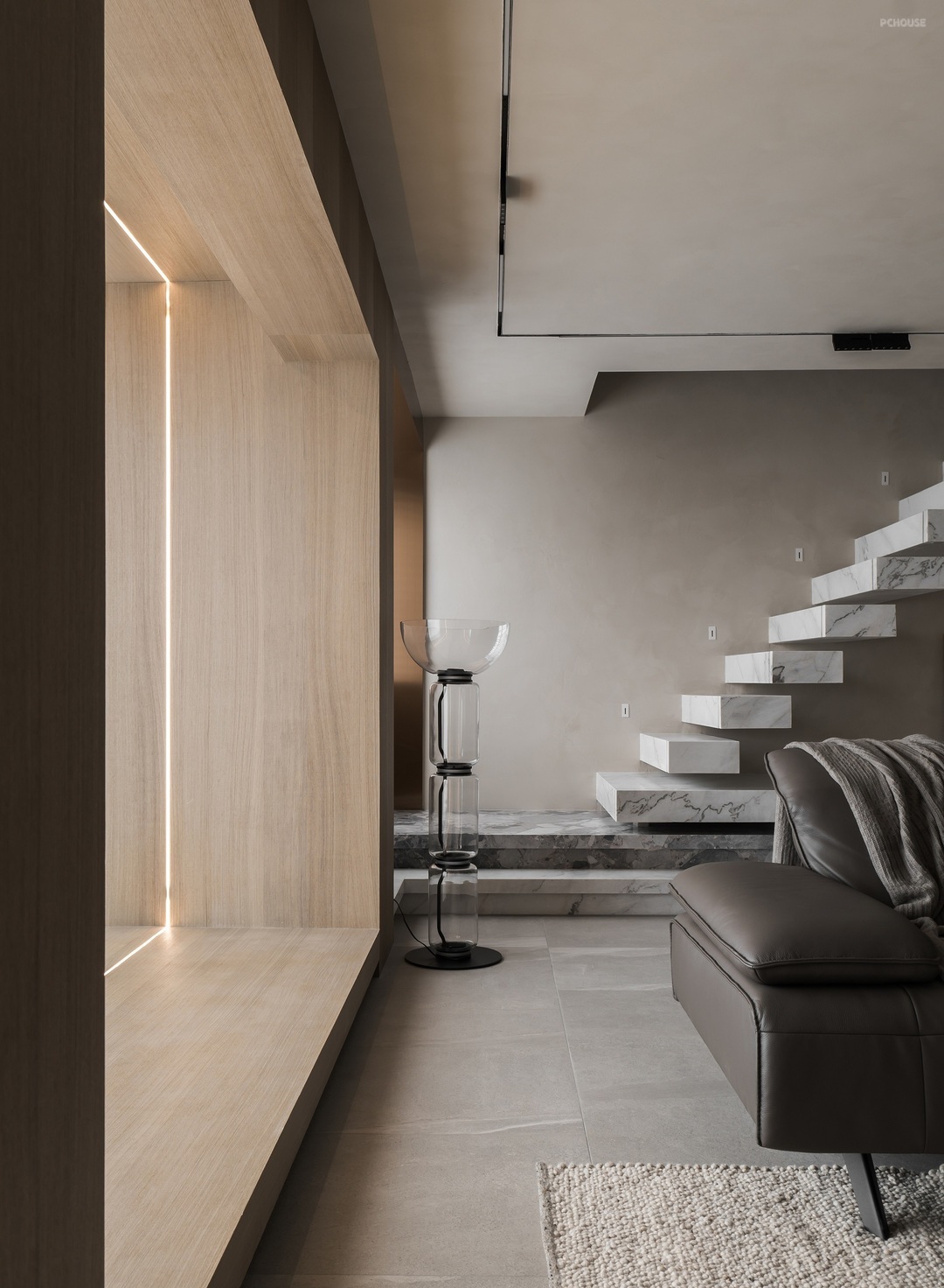 楼梯我采用了钢架悬浮的设计方式,外部用林肯白的大理石来包,为房子的整体设计增加了时尚,个性的气息。