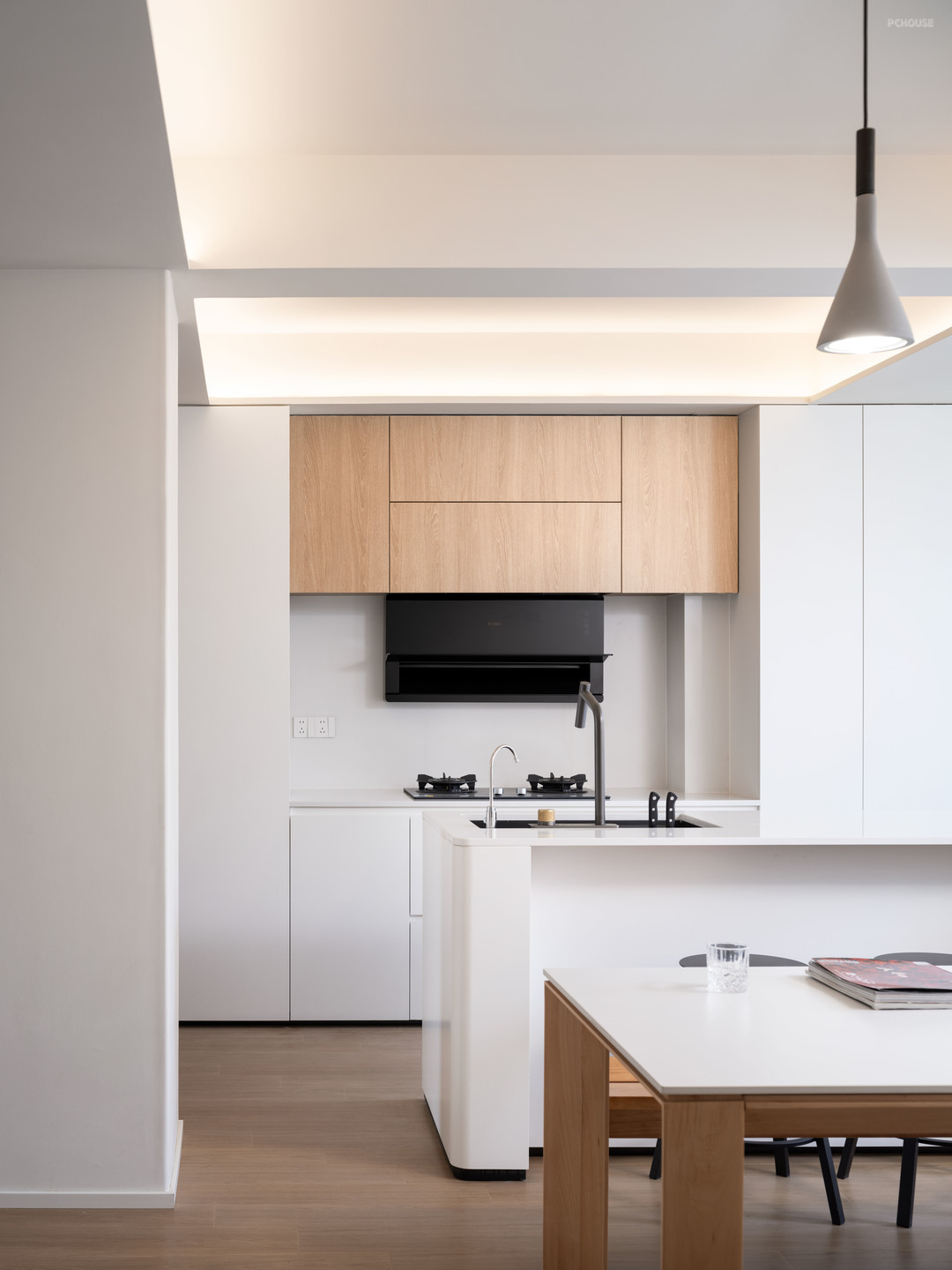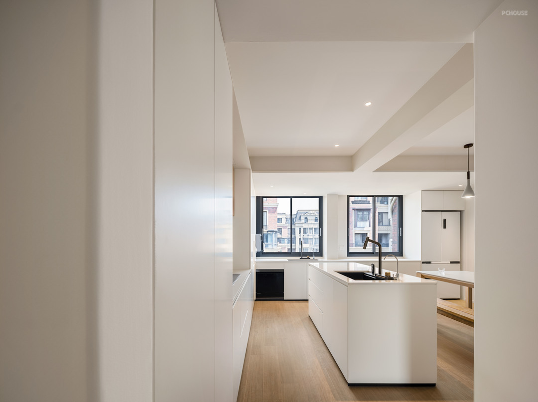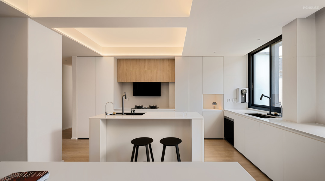 此外,设计师重新整合了原本的露台空间和厨房区域,改为开放式的厨房区,进一步提高了公共空间的开阔性和通透度。储物空间均匀的分布在房间各处,公共空间保持简洁和整体性,既满足了视觉上的美学效果,又不会影响屋主的日常使用。