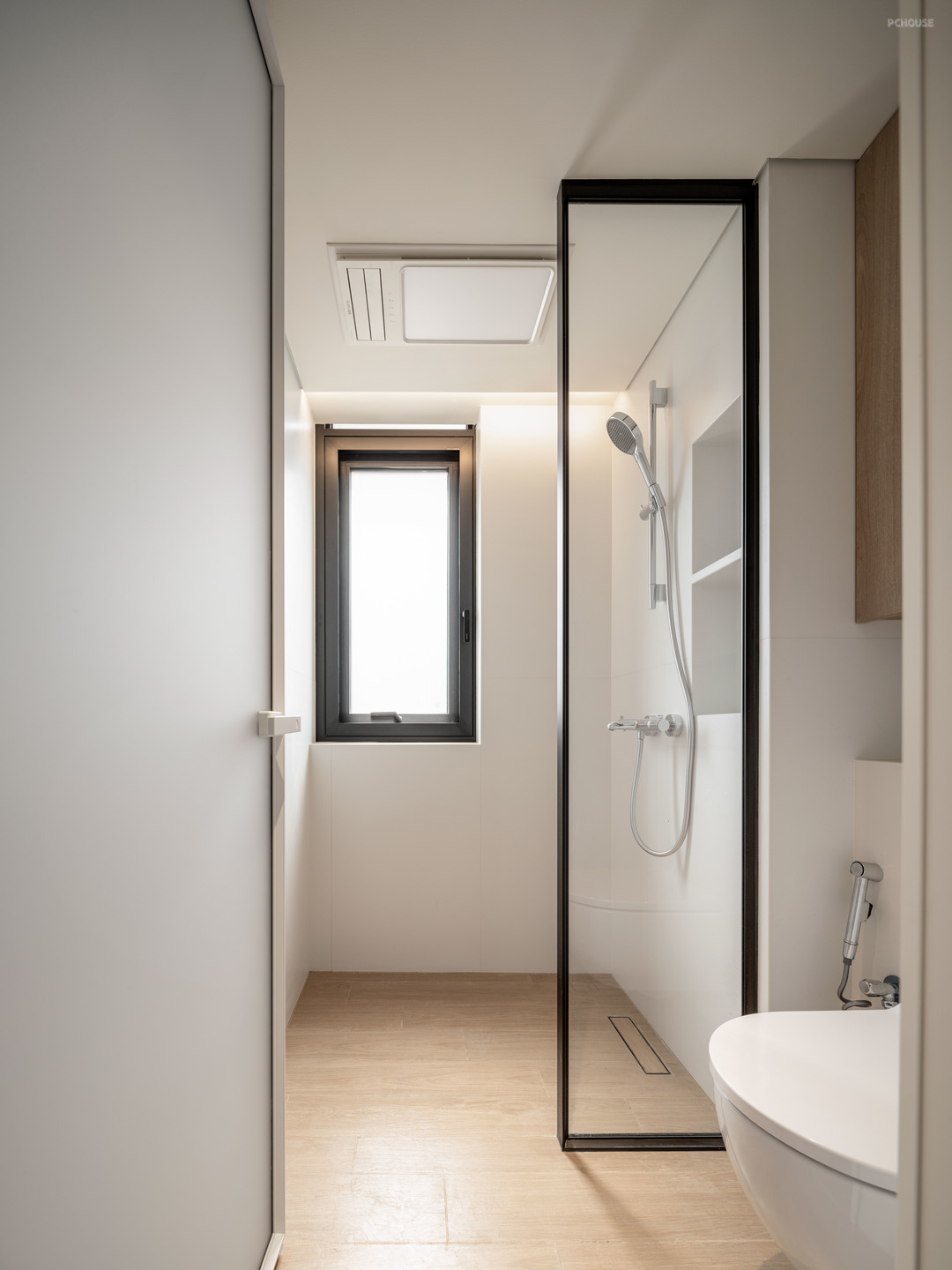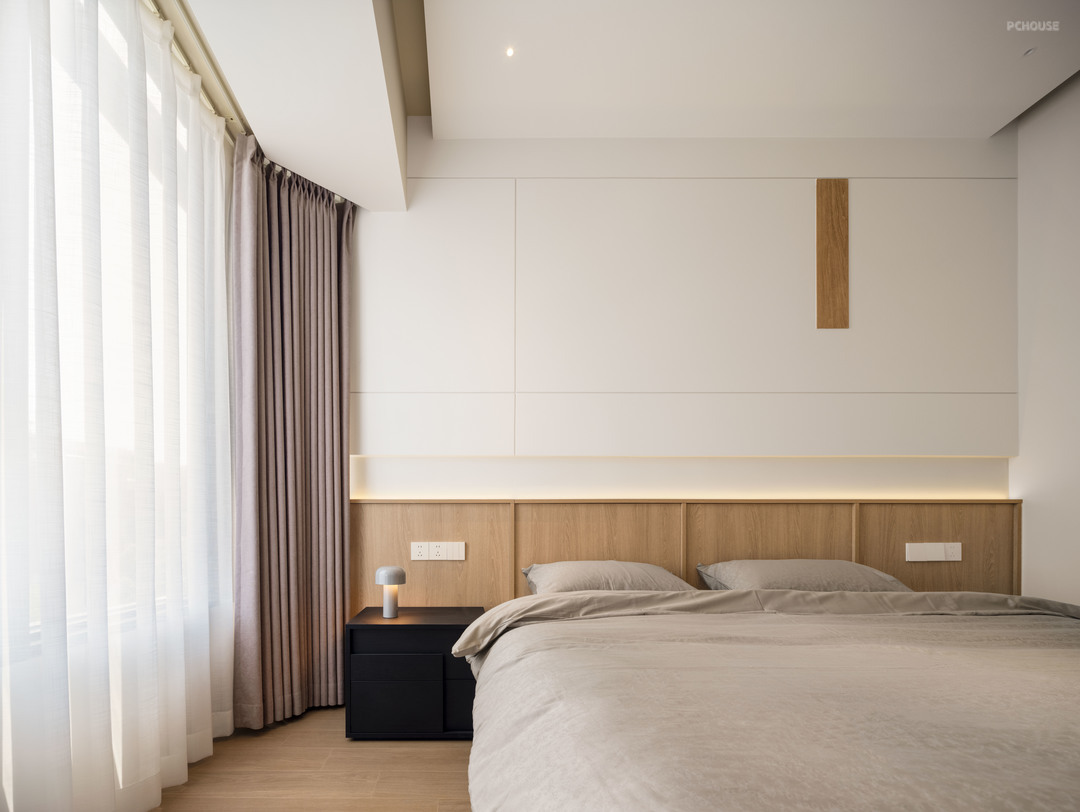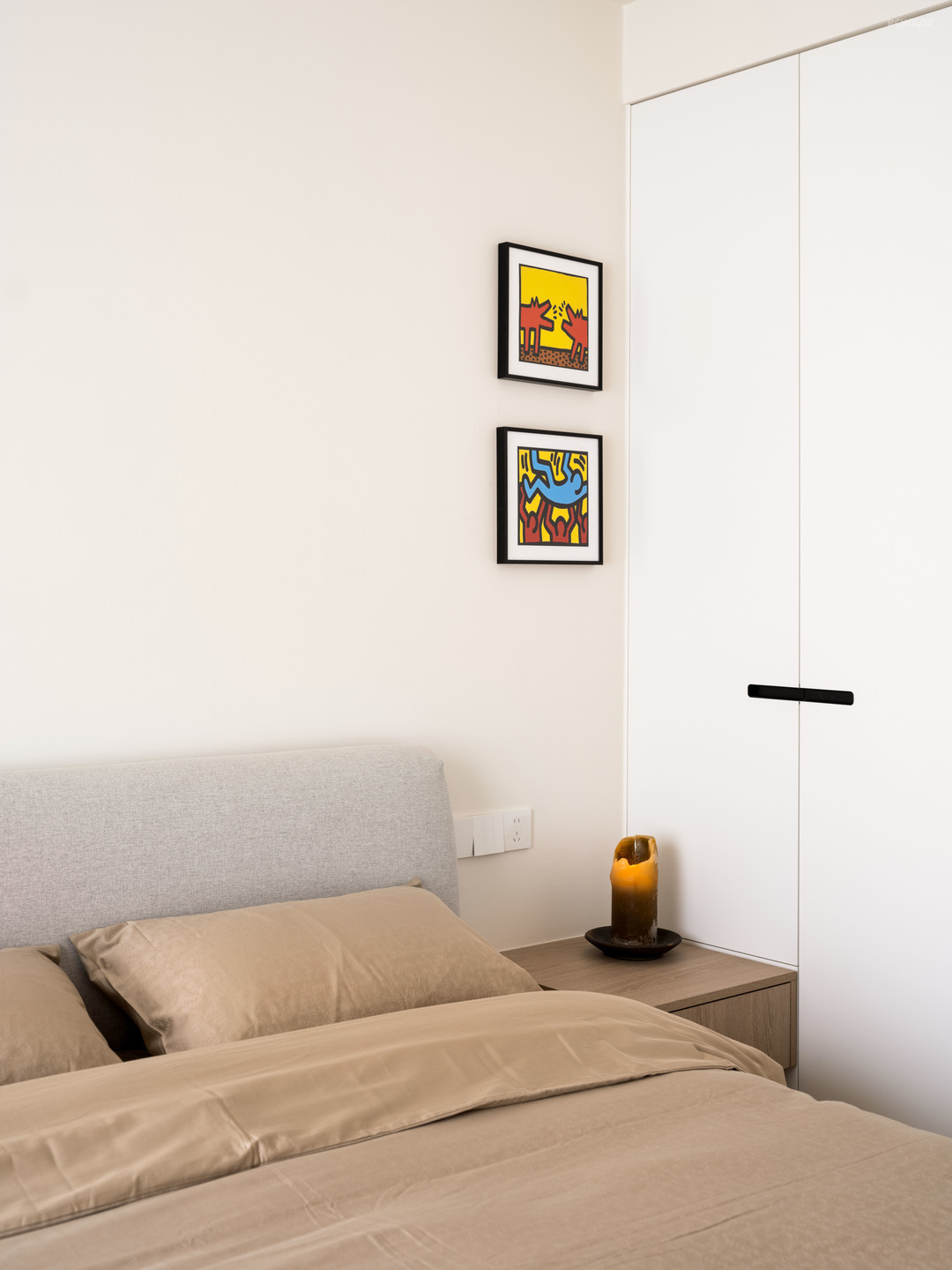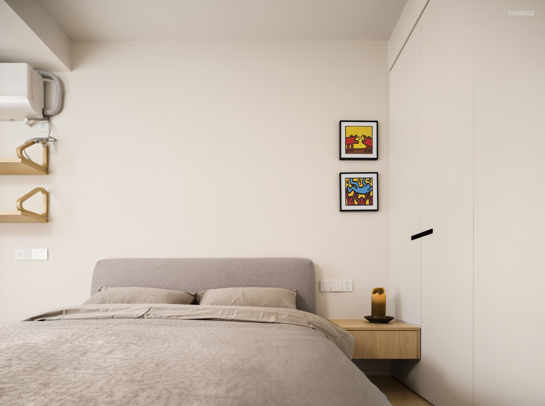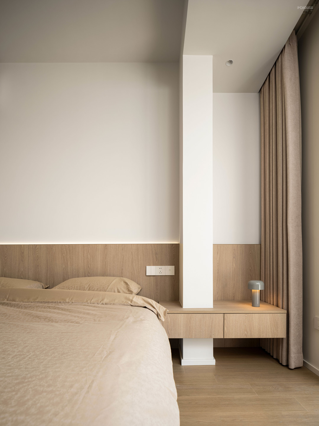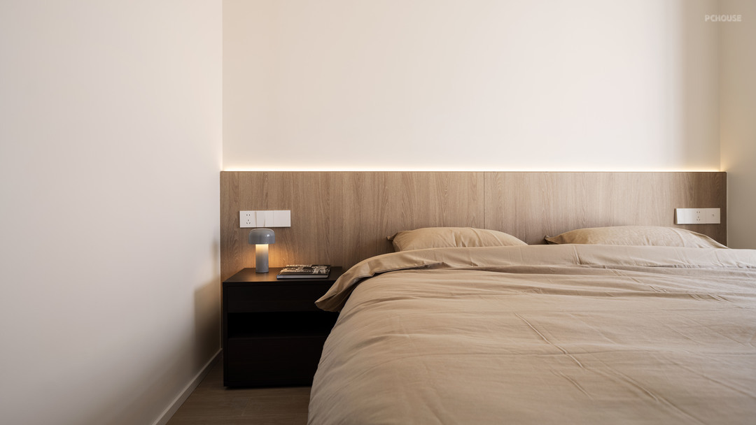 卧室是整个家中唯一需要私密性的空间,仅保留了休息和储物两个基础功能。卓越的空间尺度,在出让半个卫生间后依然毫不逊色。温馨自然的浅木色地砖,质感和触感都更加柔和。天花板的射灯装在床尾走道,床头仅用见光不见灯的线性灯带和点光源,来营造舒适的睡眠氛围。空间内没有任何多余装饰,极简床头柜,两盏暖黄的台灯,传递着屋主极简至美的审美意趣。
