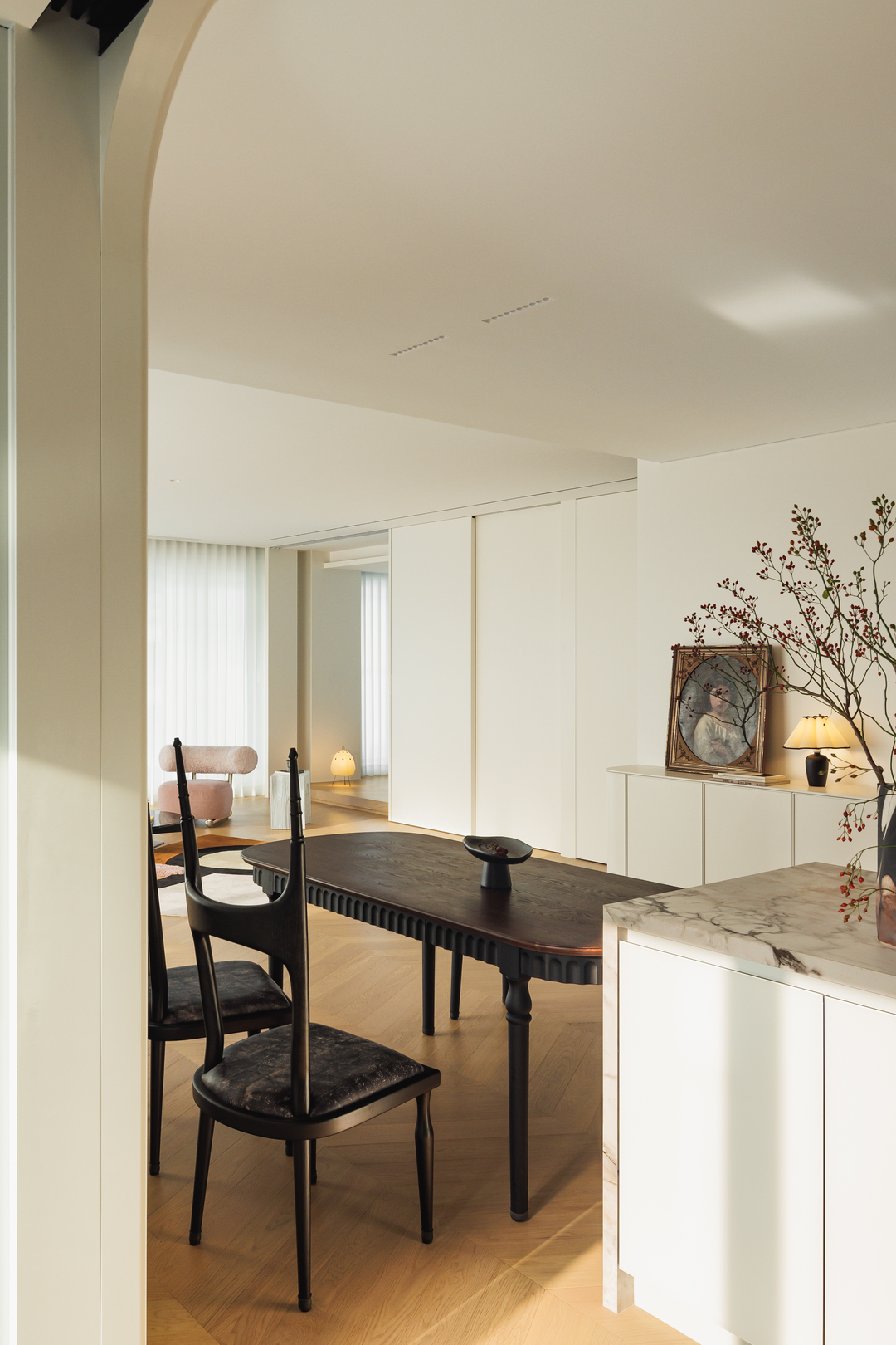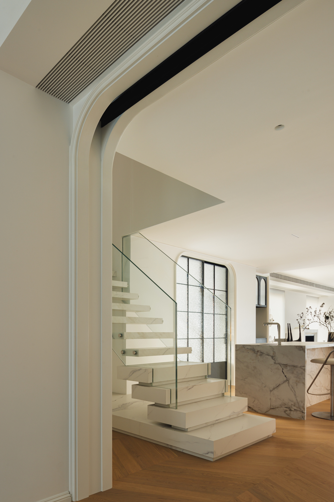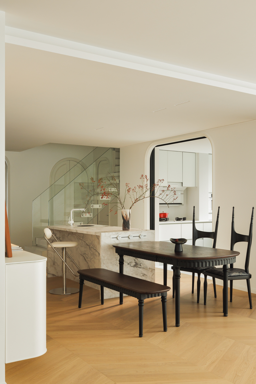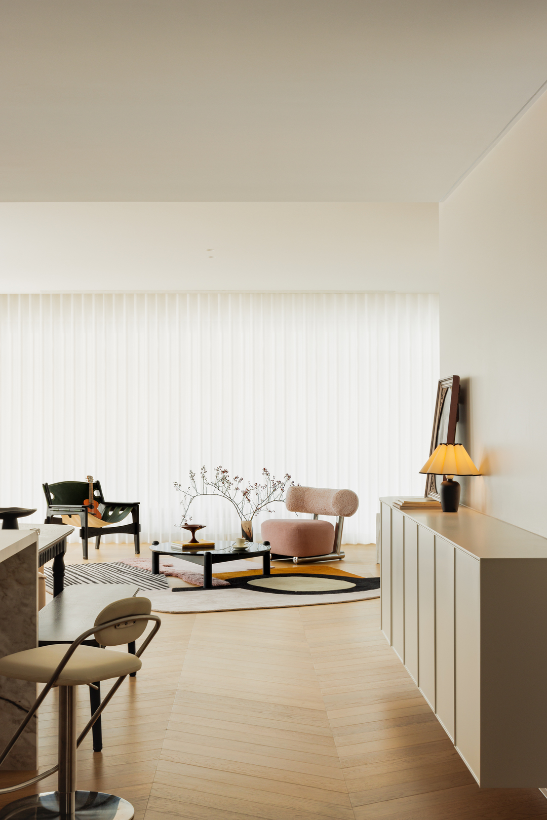 项目是一个错跃户型,面积约214平方。我们在设计上,选择打破空间常规,让家更随性慵懒。原始餐厨布局散乱,影响采光和空间利用率。于是拆除多余墙体,将客厅阳台打通,让原本“拥挤”的格局瞬间得到尺度释放,空间方正让光自由穿透。合理规划个人空间,将女儿房的布局尽量最大化,主卧则独享一份舒适安逸。