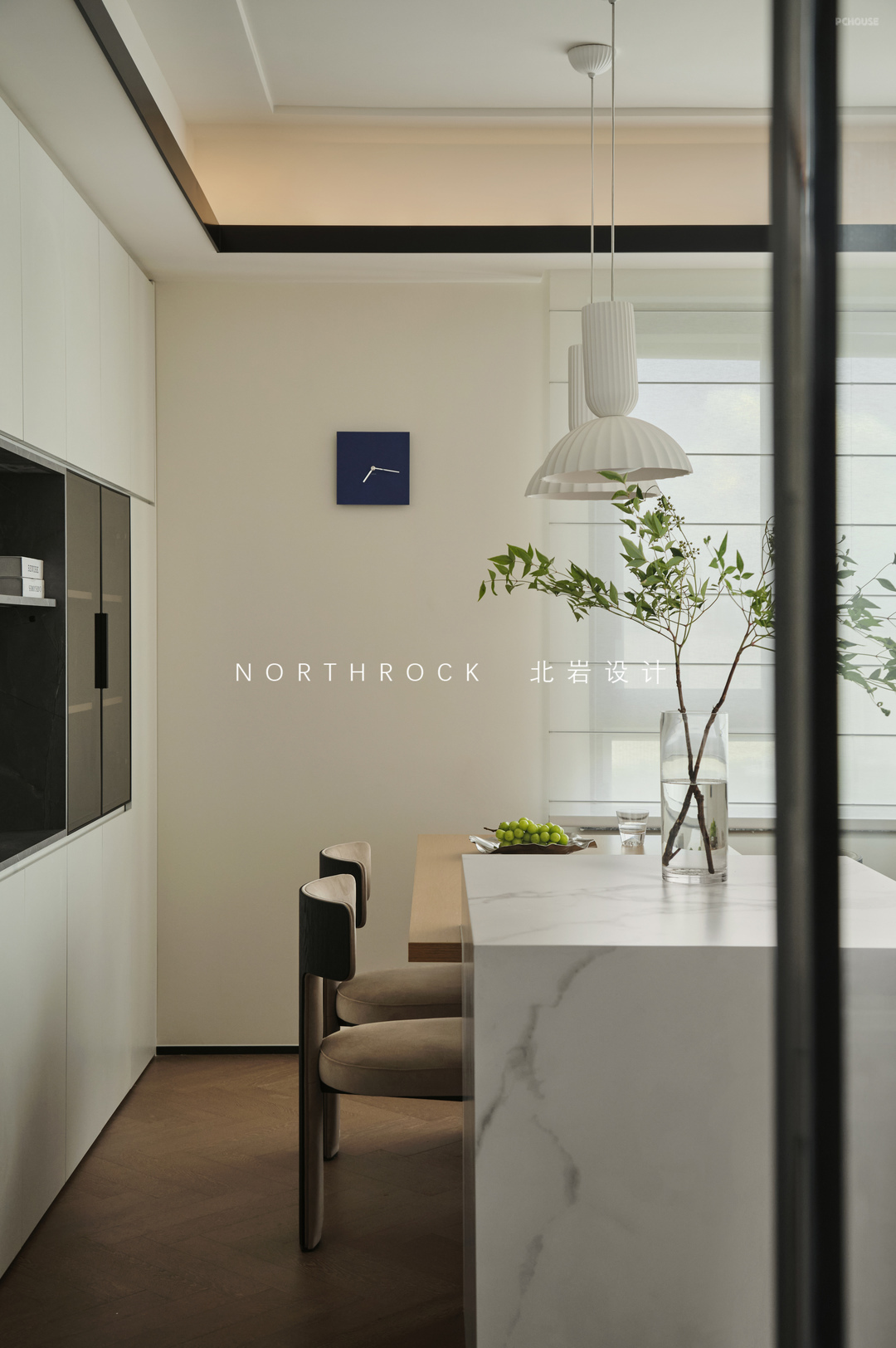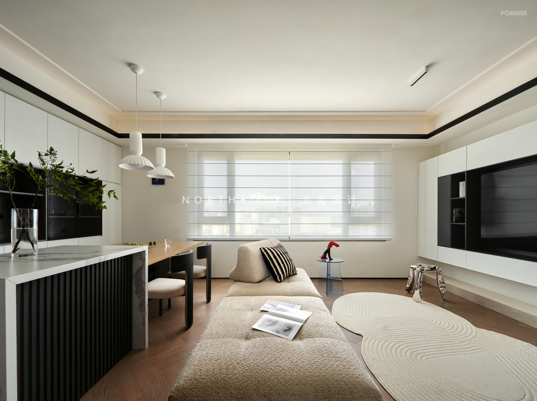 客厅以连贯有序的小横厅布局,来承载四口之家的日常动静。沙发之后依次是餐桌、岛台与餐边柜,功能依次排开,将用餐、轻厨与收纳妥帖整合。