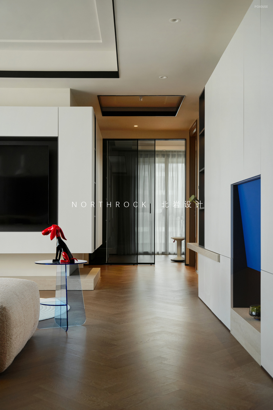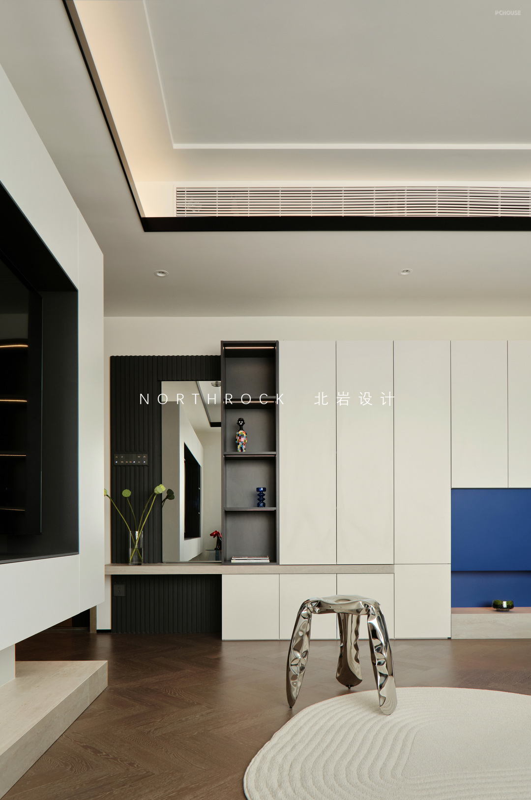 从开发商交付这面不可拆除的智能镜开始,设计便围绕着它展开。我们并未对抗它的存在,而是用一道黑色格栅与悬挑的米洞石层板重塑背景,视觉的层次感由此蔓延开来。