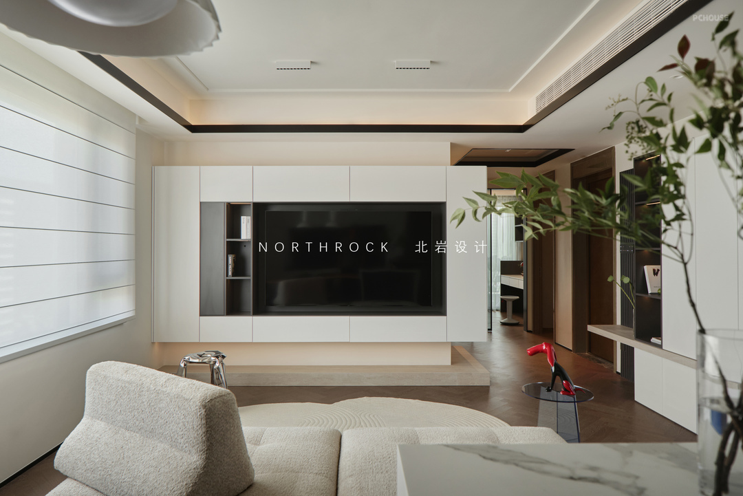 由玄关柜延伸过来的电视柜作为视觉基底,上下都做了悬空处理,电视平稳嵌入其中。整体形态一气呵成,线条干净利落,不是刻意强调的装饰,而是以一种妥帖且从容的姿态,将功能与视觉稳稳承接。
