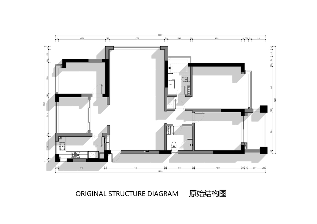 1.原始户型为常规学区二手房格局,空间划分刻板,功能区之间缺乏联动,风格表达单一。
