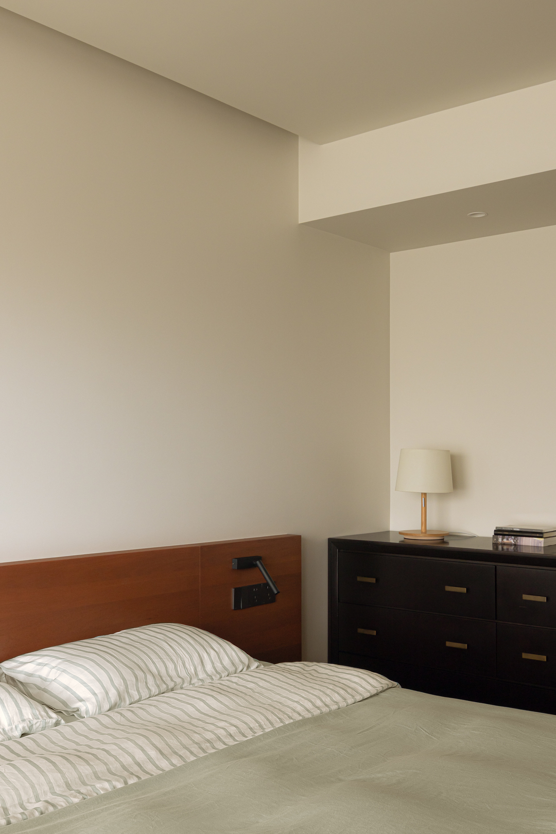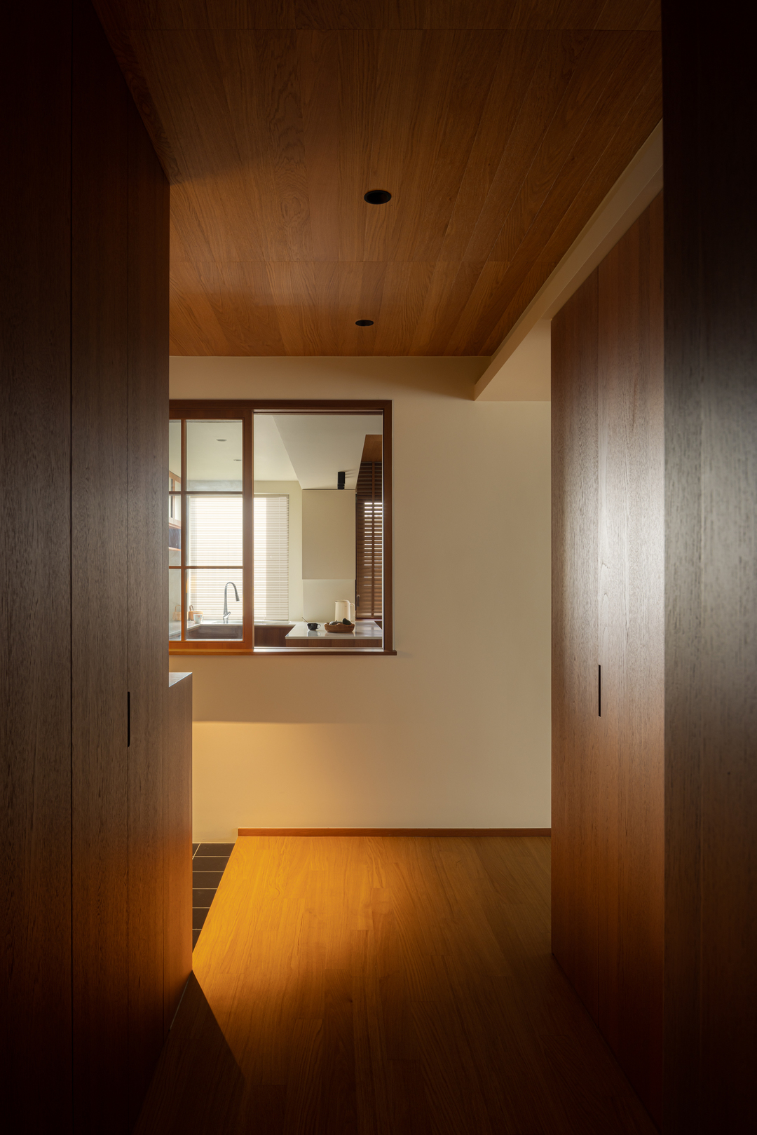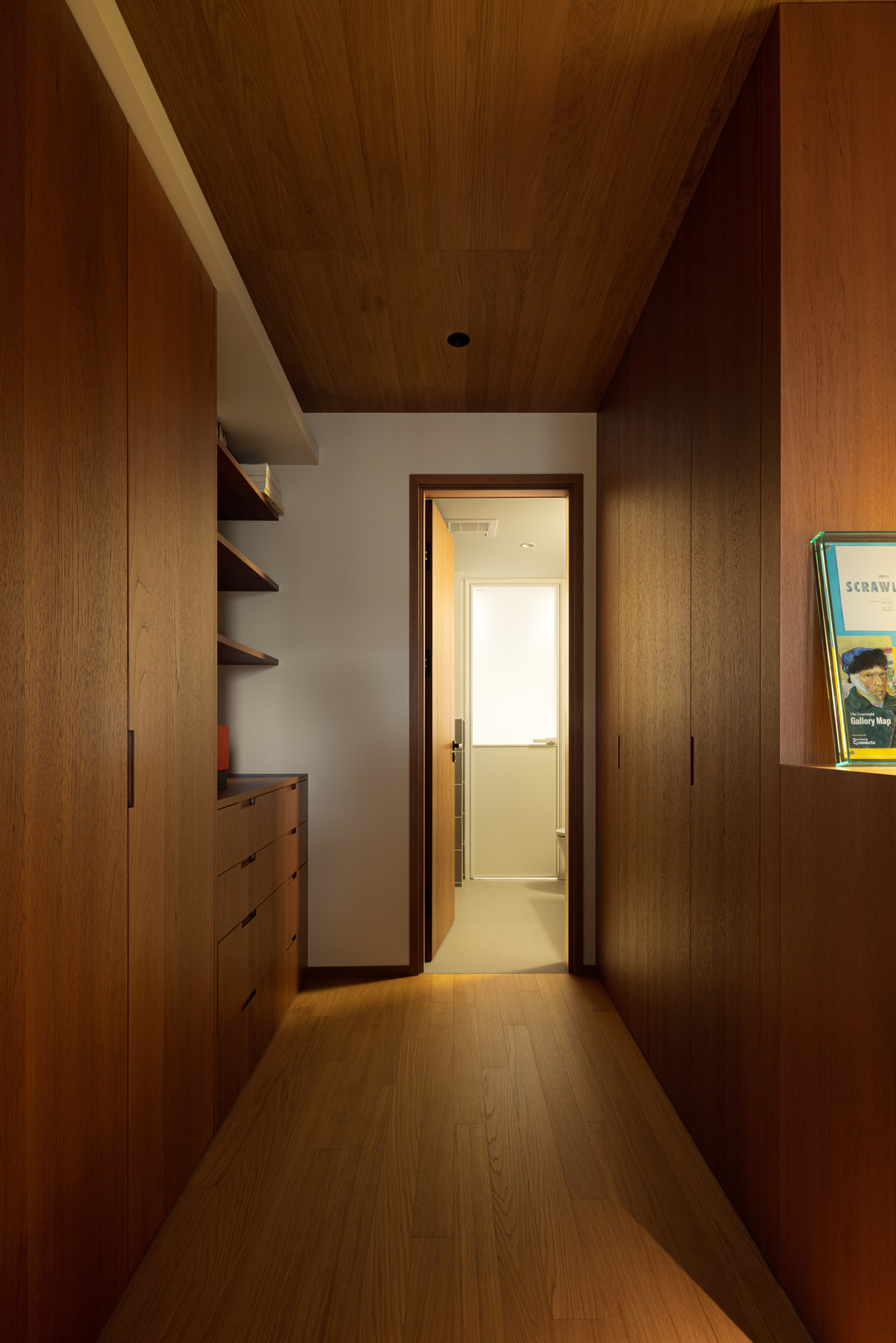 胡桃木的肌理在光影里铺展成一条隧道,从顶天立地的收纳柜到延伸至尽头的木地板,每一寸木质都在诉说秩序之美。