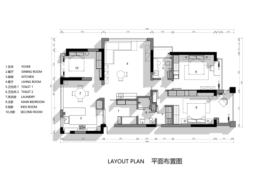 2.重构卫浴动线,将两个公共卫浴与洗衣房联动,其中次卫改为双卧室共享公卫,主卫与洗衣房形成回行动线,大幅提升使用效率。