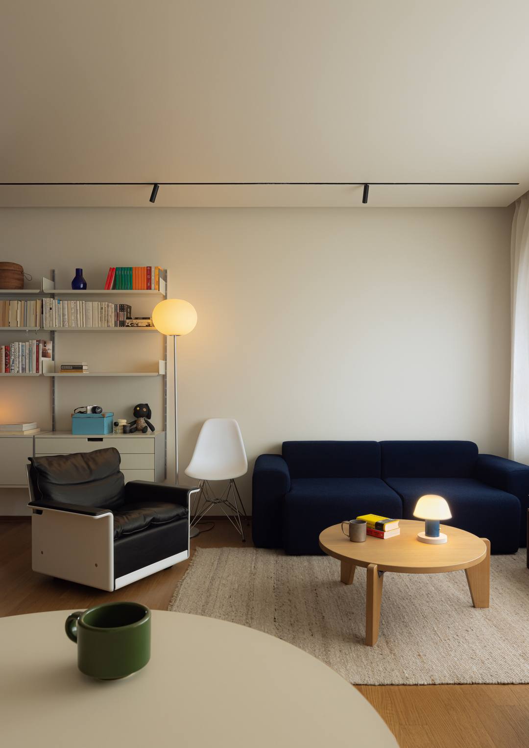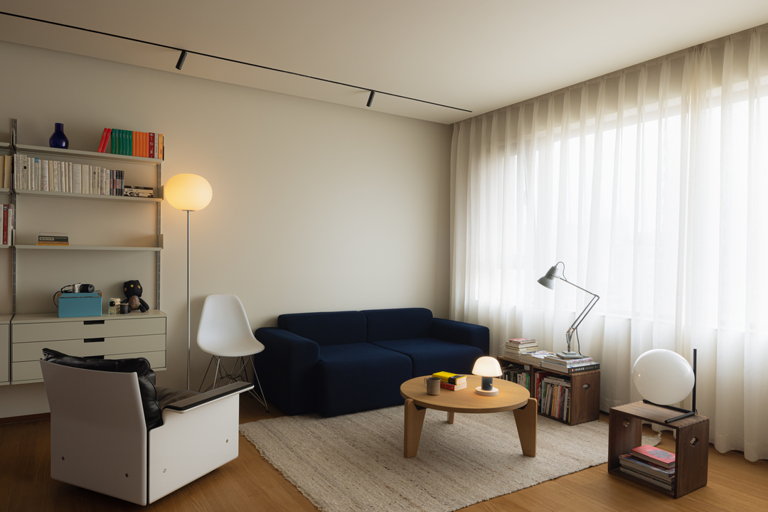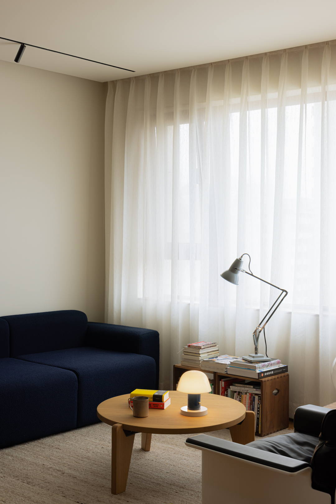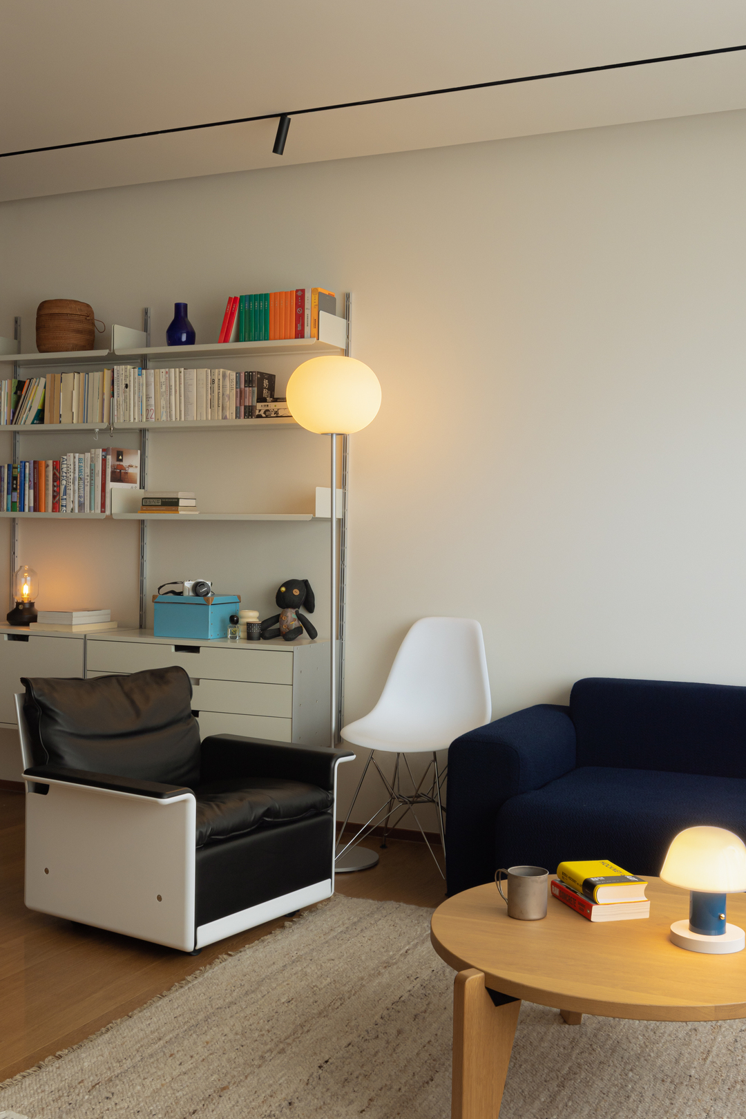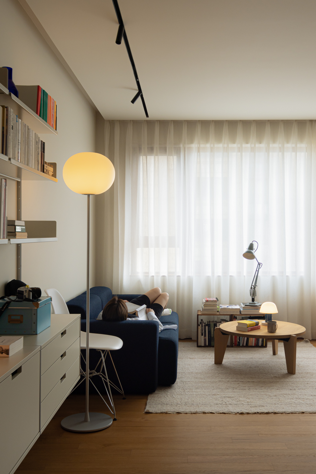 深蓝沙发承托着阅读的慵懒,中古台灯与球形落地灯的光影交错间,原木家具的温厚与书籍的人文气息悄然融合。