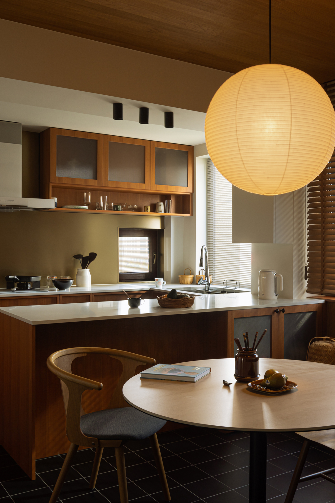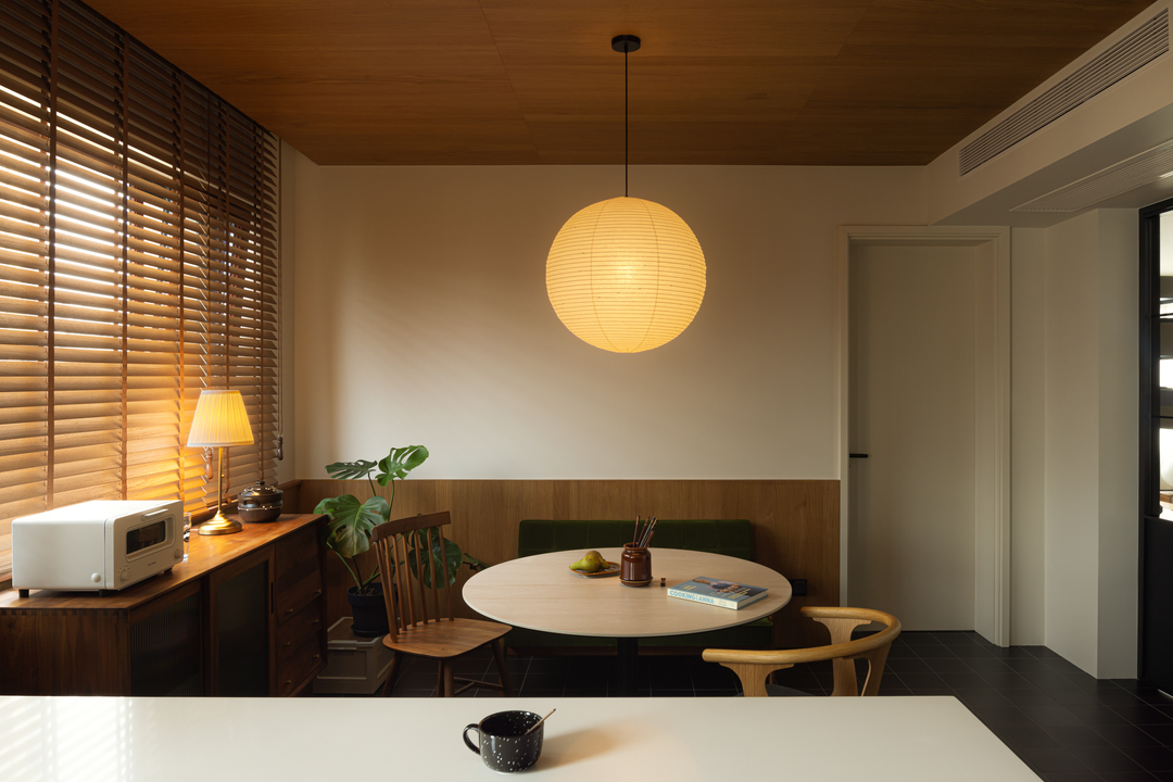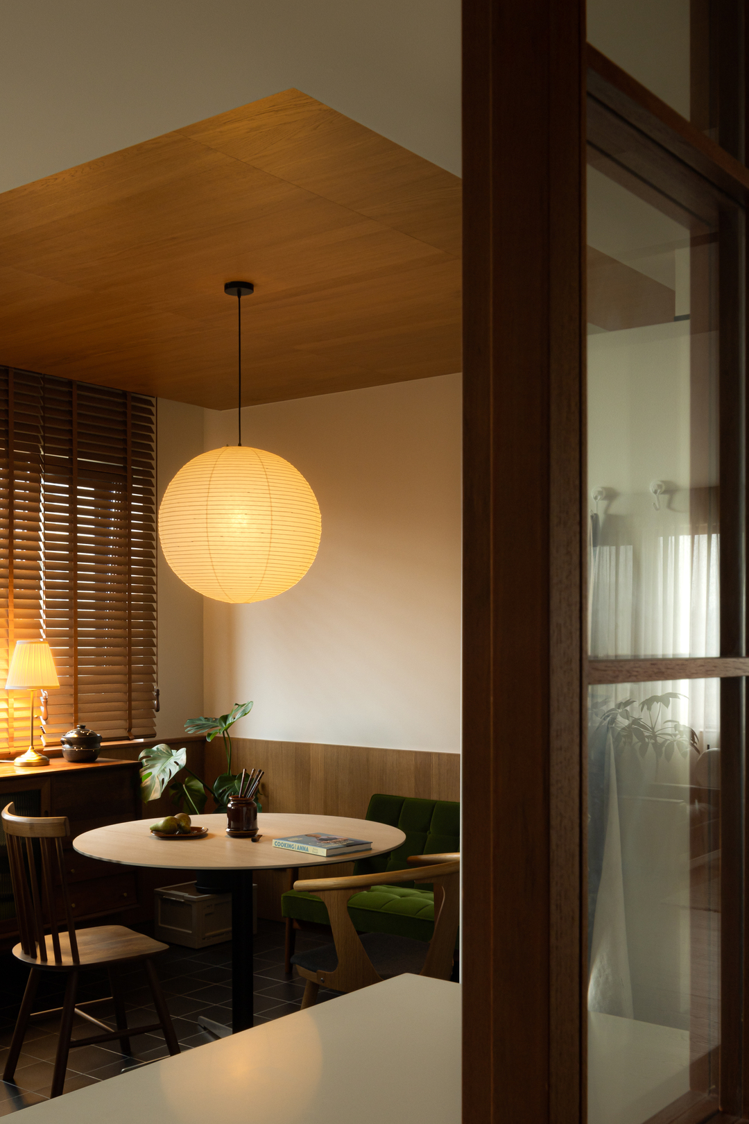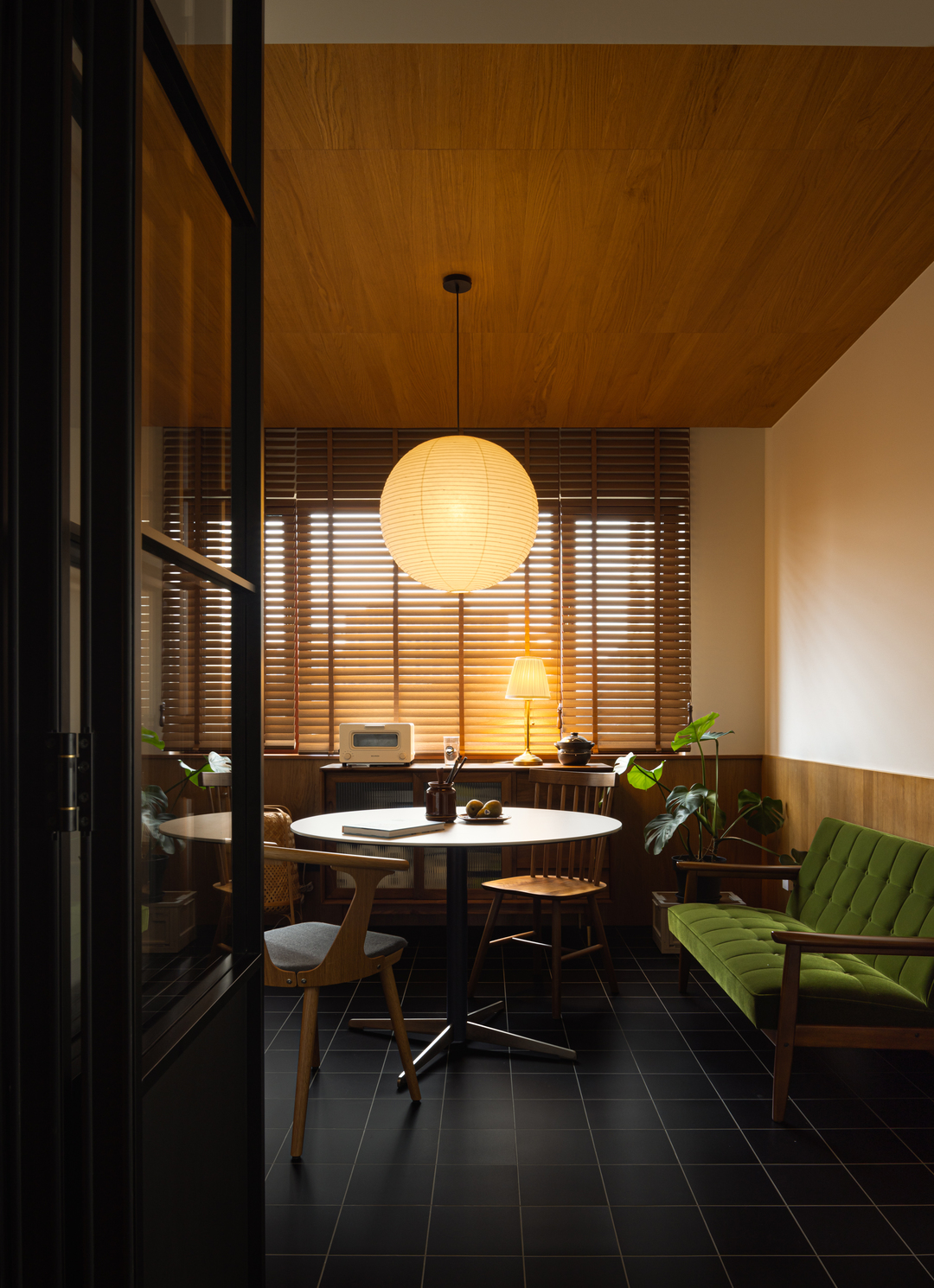 转个身,黑框玻璃门后,餐厅的暖黄纸灯与木质百叶窗正酝酿着烟火气。每一次视角转换,都是风格的自然过渡。