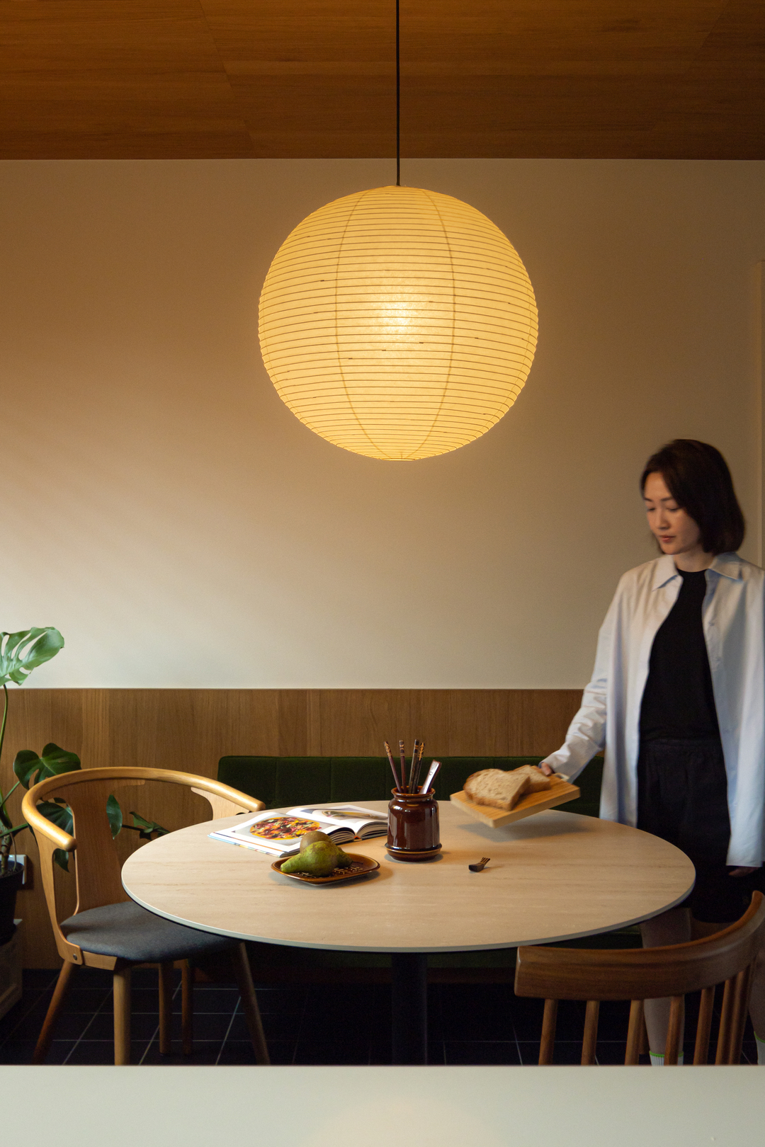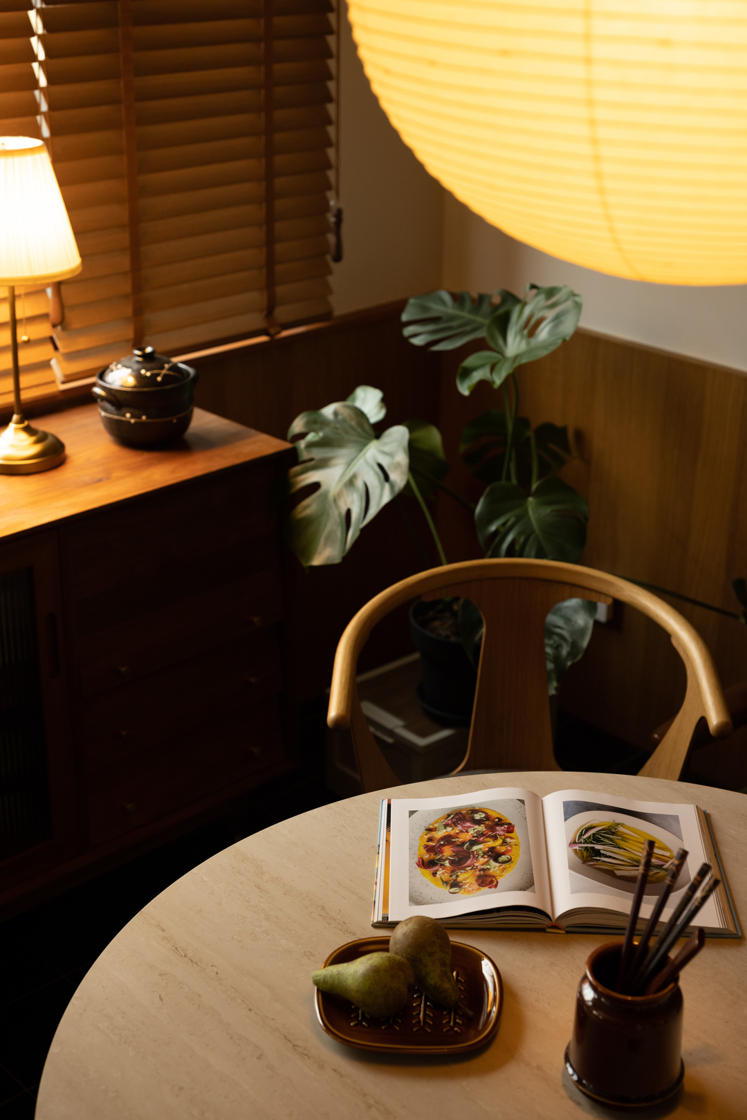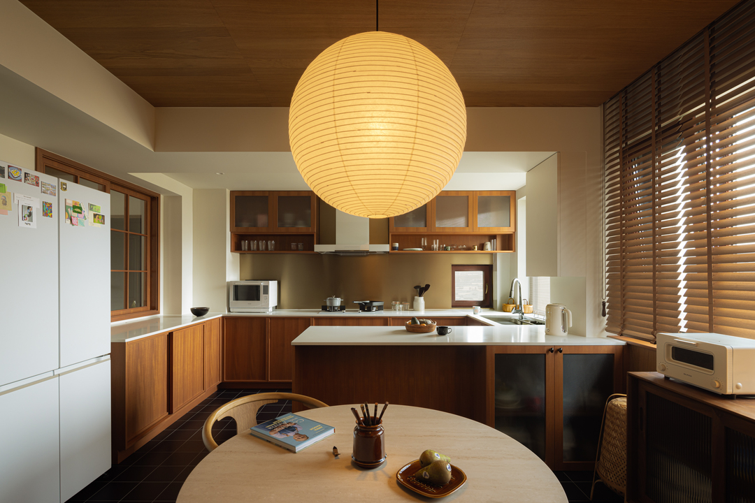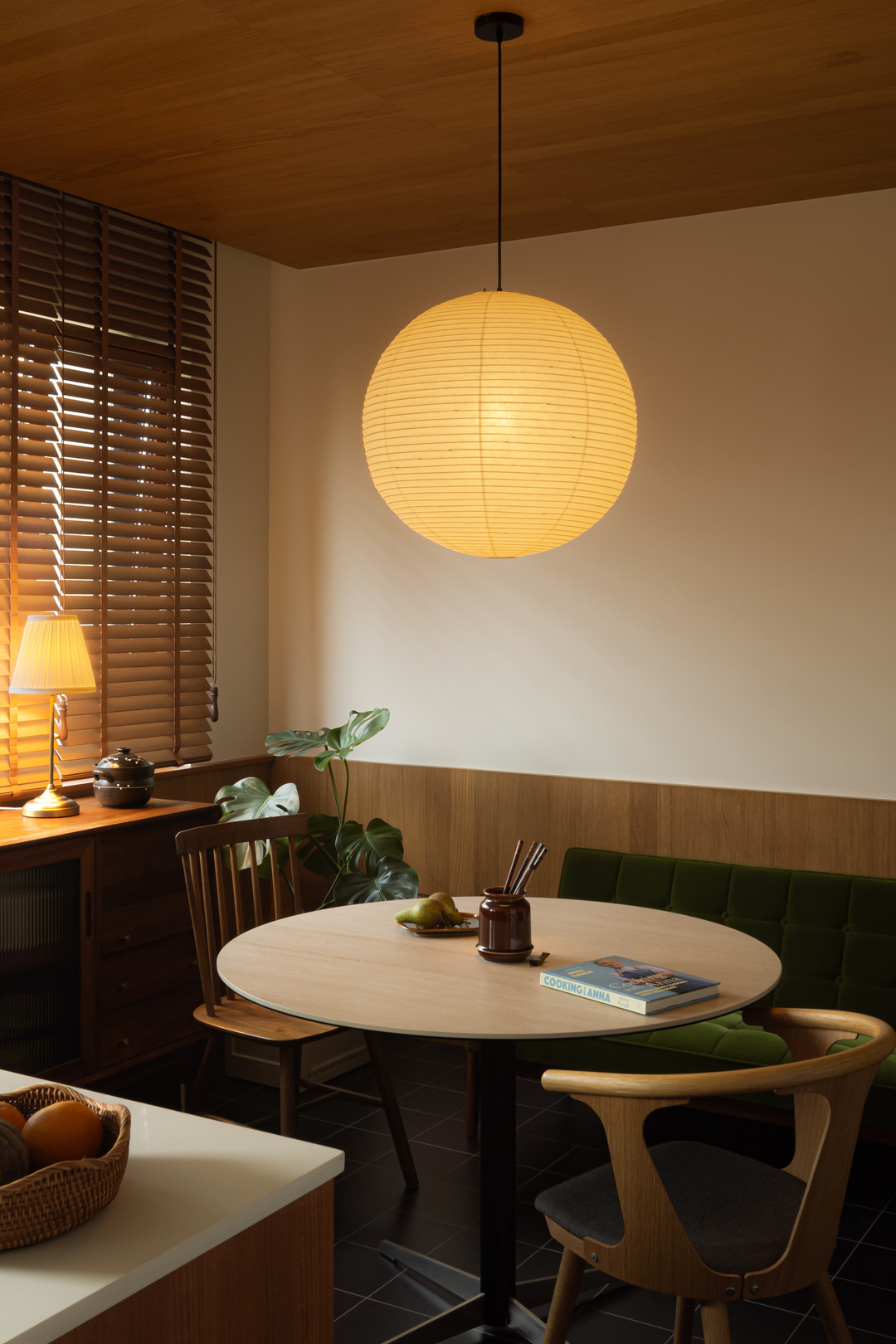 转个身,黑框玻璃门后,餐厅的暖黄纸灯与木质百叶窗正酝酿着烟火气。每一次视角转换,都是风格的自然过渡。