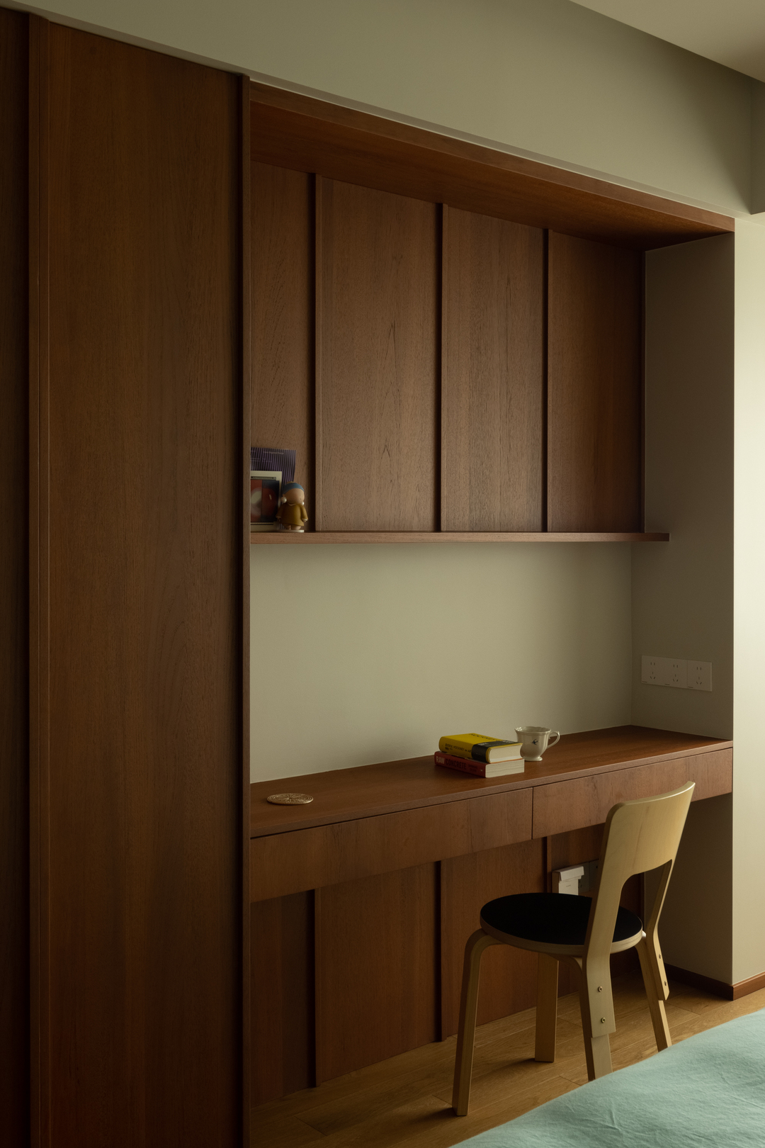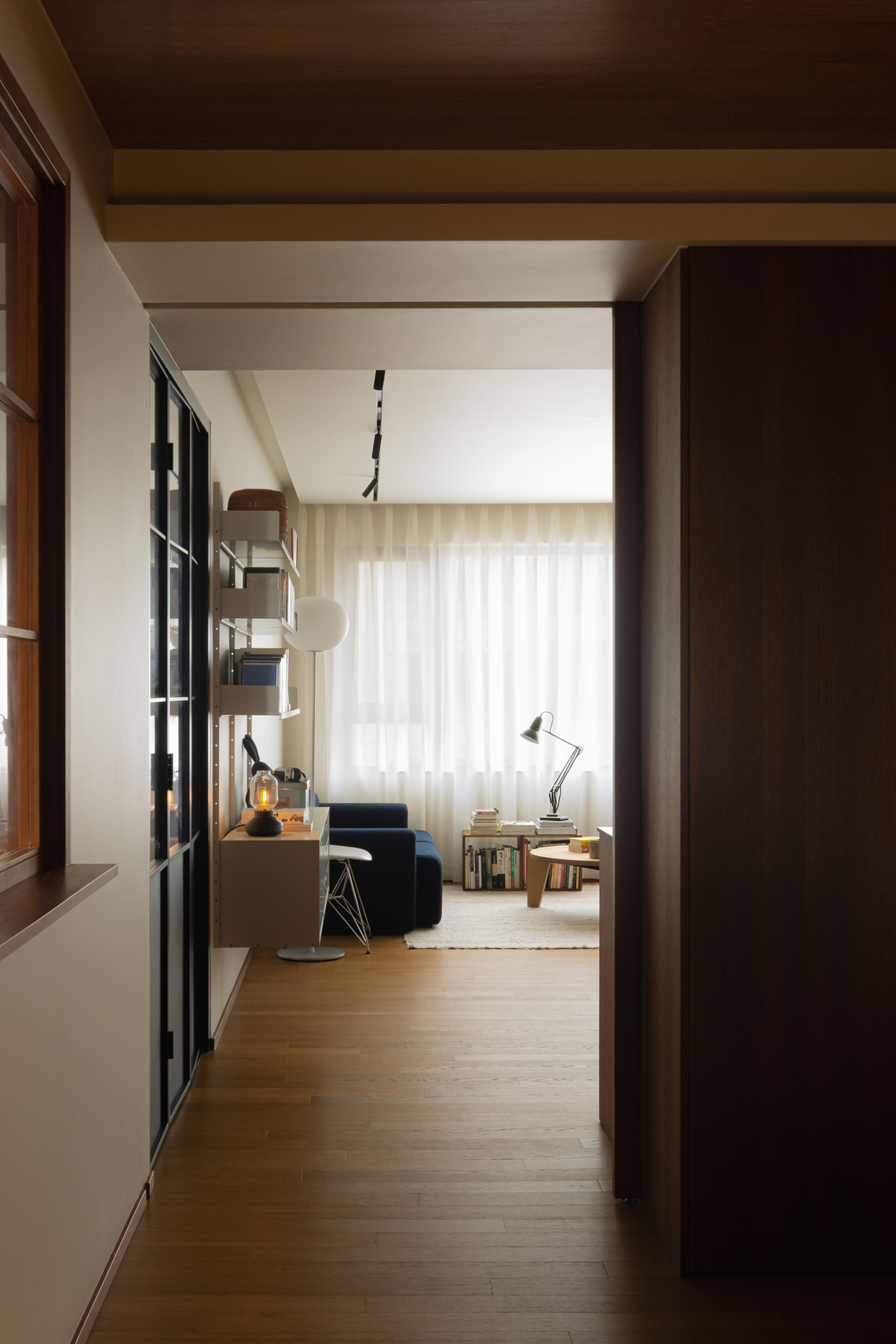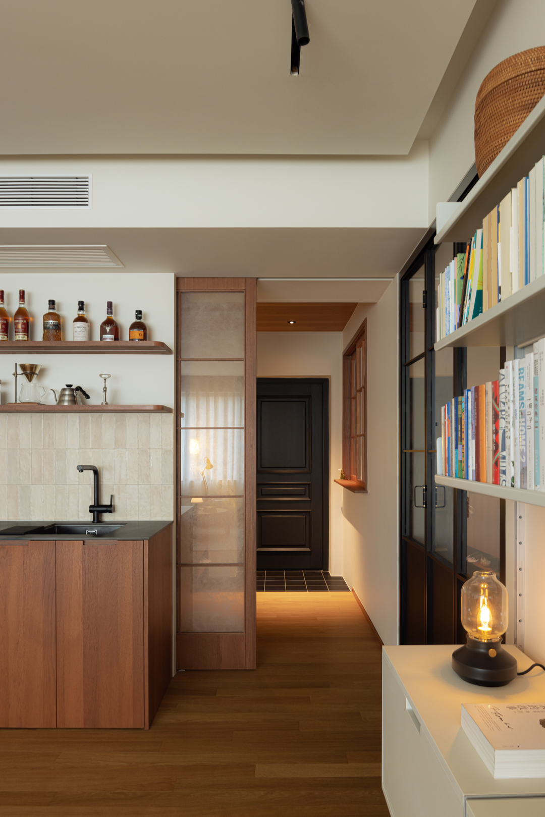 木质地板贯通始终,温润质感悄然延伸。一侧是收纳区,书籍与装饰错落有致,另一侧功能区则以木质柜体搭配精致陈列,复古气息扑面而来。每一次经过,都仿佛穿梭于中古与日式风格交织的场景之中。