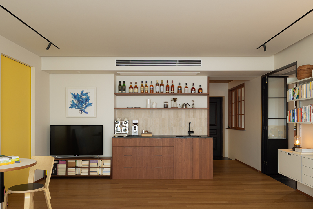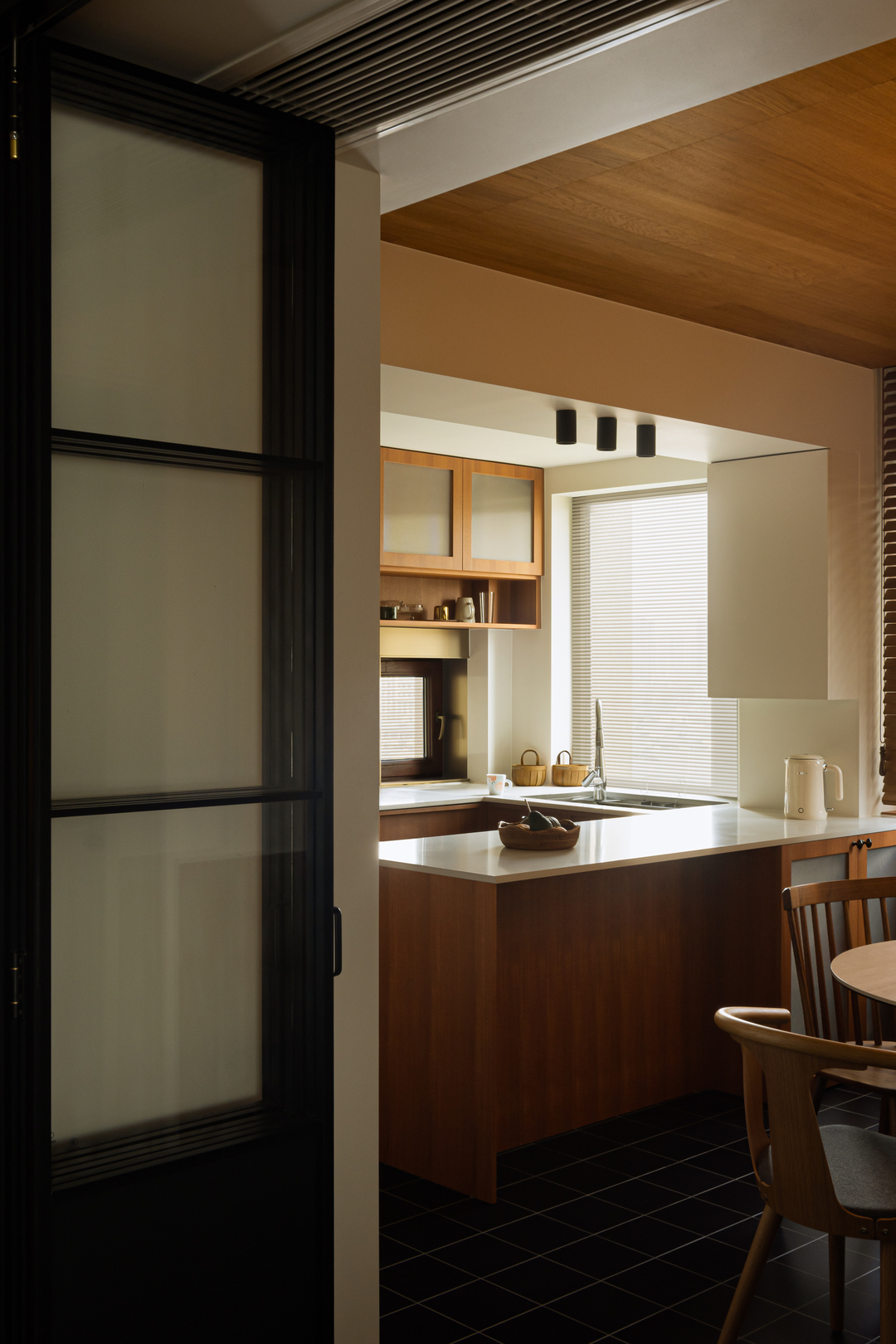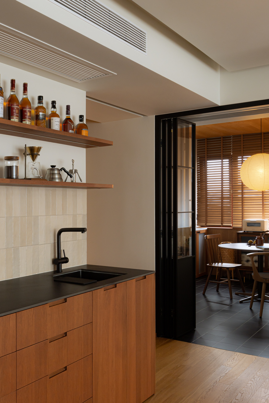 餐厨之间的折叠门进一步强化空间灵活性:打开可联通区域,闭合则明确分区。木质元素与黑砖地面相衬,在实用与美学之间取得平衡,塑造出一个灵活有序的居家场景。