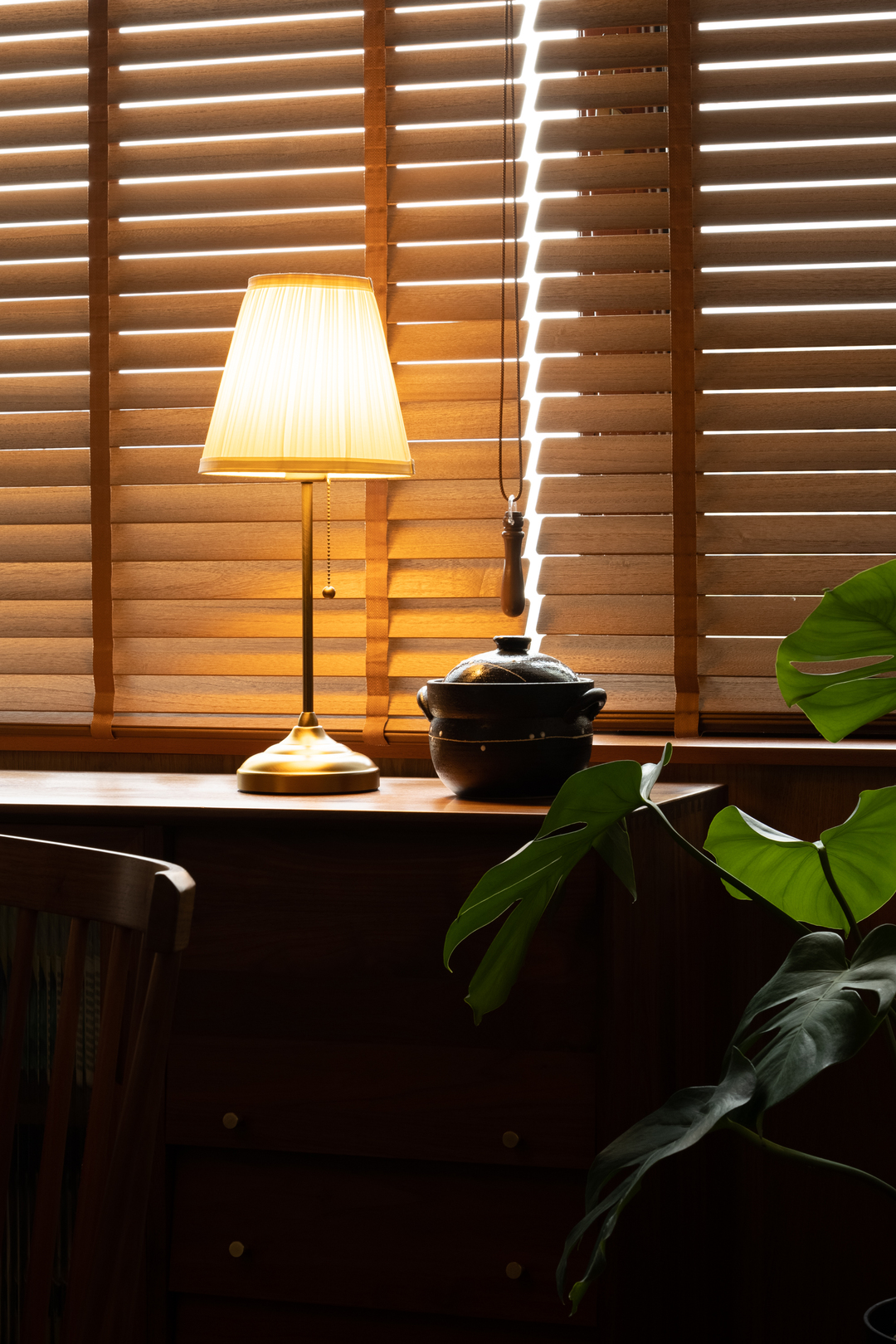 纸灯的光晕如琥珀凝固,在木百叶的缝隙间筛出光阴的纹路。木吊顶与百叶窗的肌理呼应,让自然光线在空间里慵懒游移。