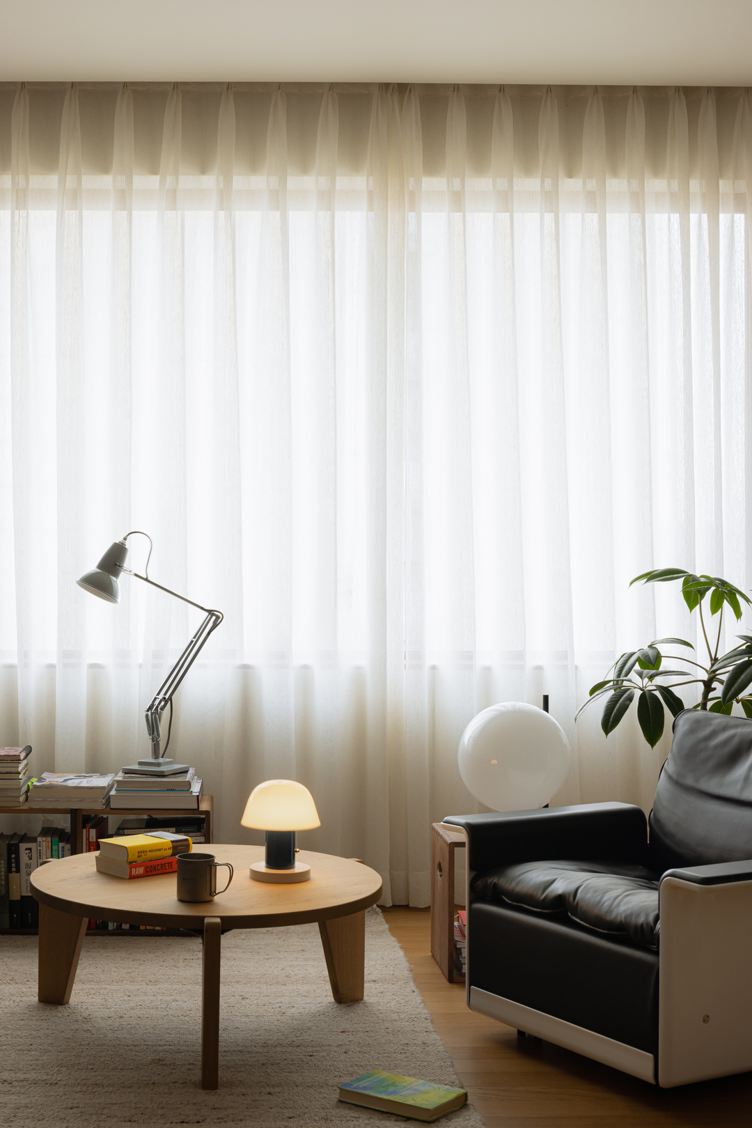 当光透过纱帘,台灯的金属质感与球形灯的柔和光晕交织,为空间晕染出层次分明的温暖。原木茶几的质朴、皮革沙发的复古,在书籍与绿植的点缀下,勾勒出“随性不随便”的生活格调。
