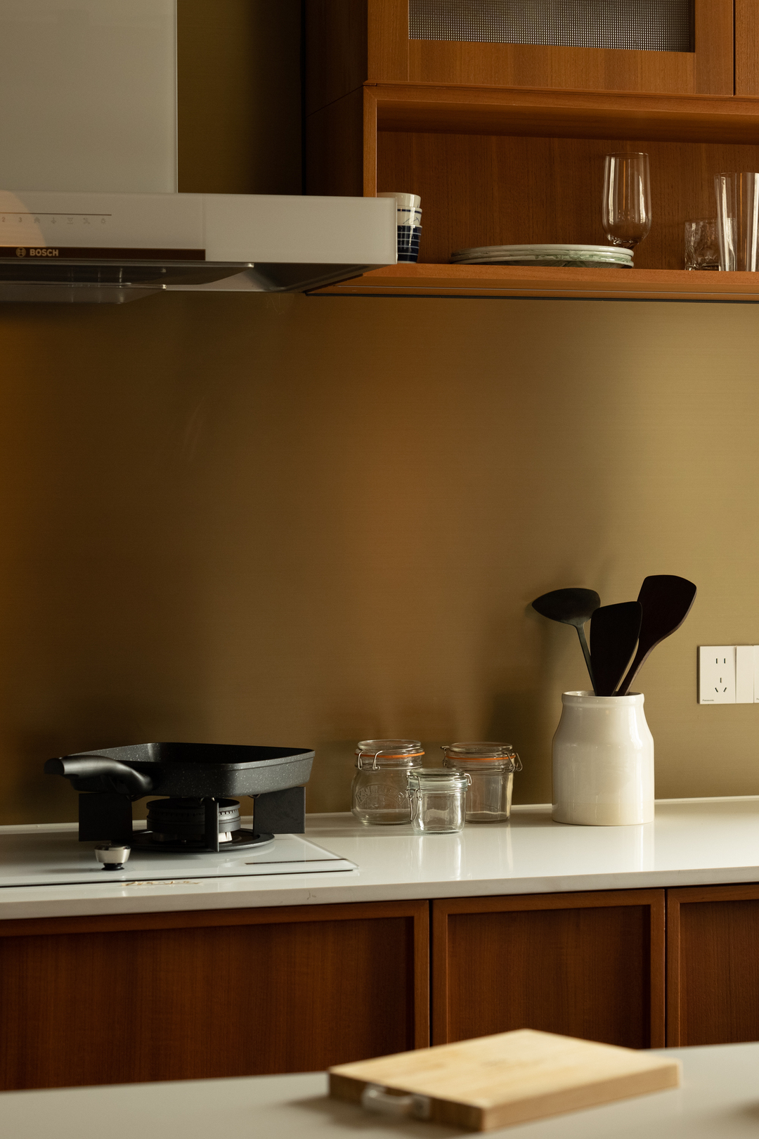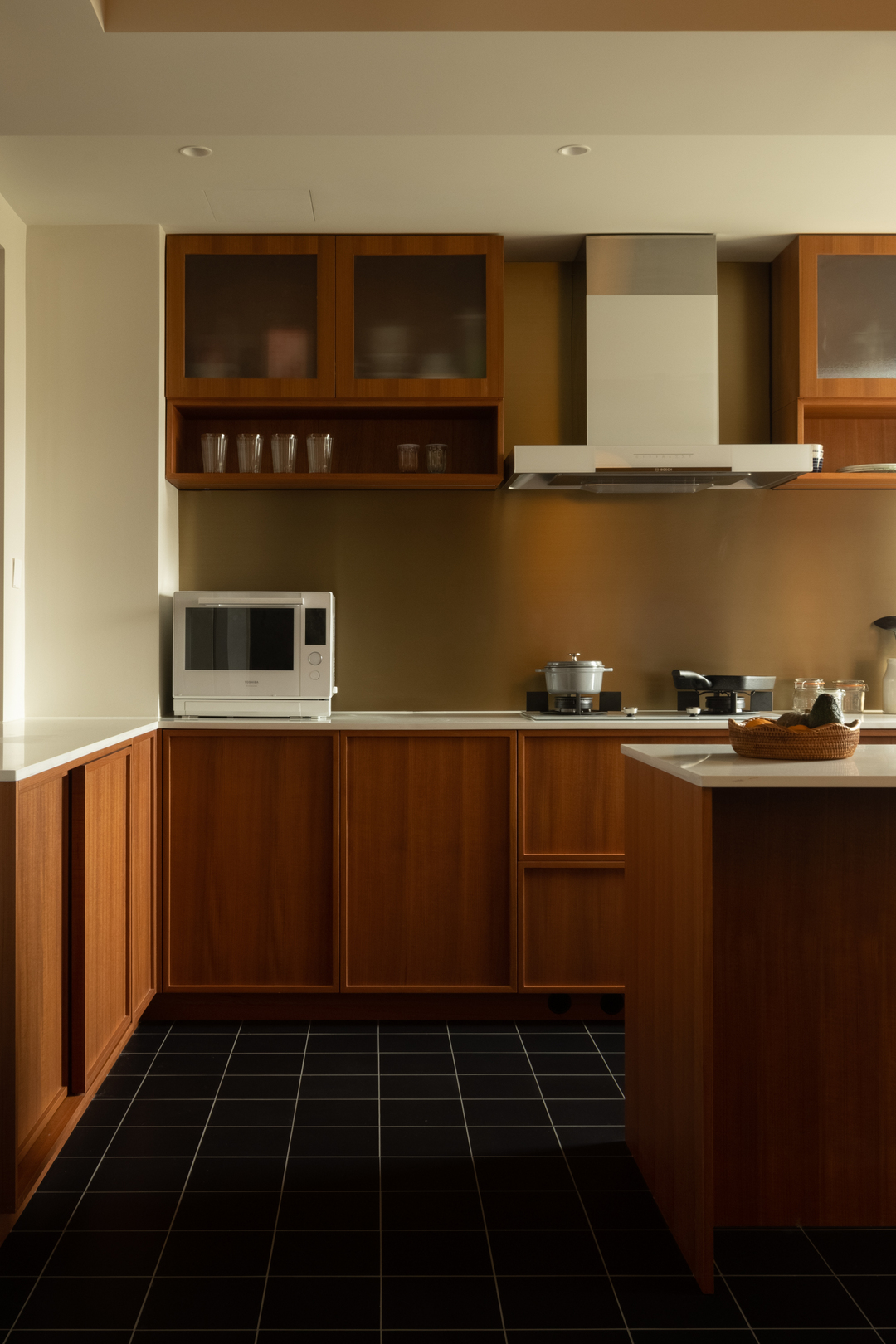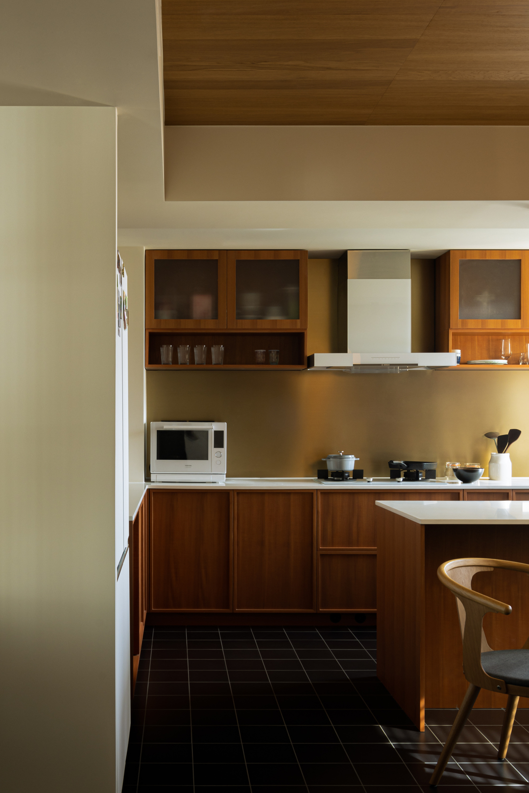 厨房以木色橱柜为主调,搭配黑砖地面,质感温暖且沉稳。功能布局紧凑有序,烹饪区、收纳区与餐厨过渡自然。