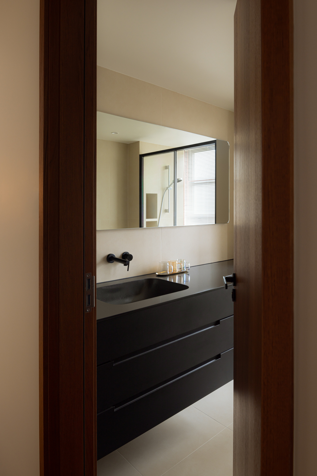 宽大的镜面拓展了空间的深度与通透感,淋浴区用玻璃隔断维持了视觉的连贯。百叶窗筛入细腻光影,这里没有冗余的装饰,只有黑白灰演绎的理性与优雅。