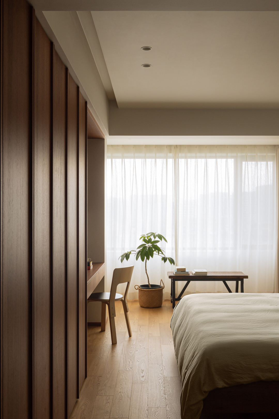 白纱帘滤过柔光,给空间裹上一层慵懒。角落的绿植舒展着枝叶,书桌与床的边界模糊了功能的界限。当木质的肌理、布艺的柔软与光影的诗意交织,每一次躺卧,都是与治愈感的相拥。
