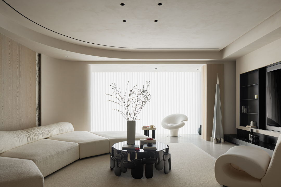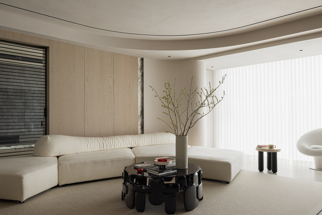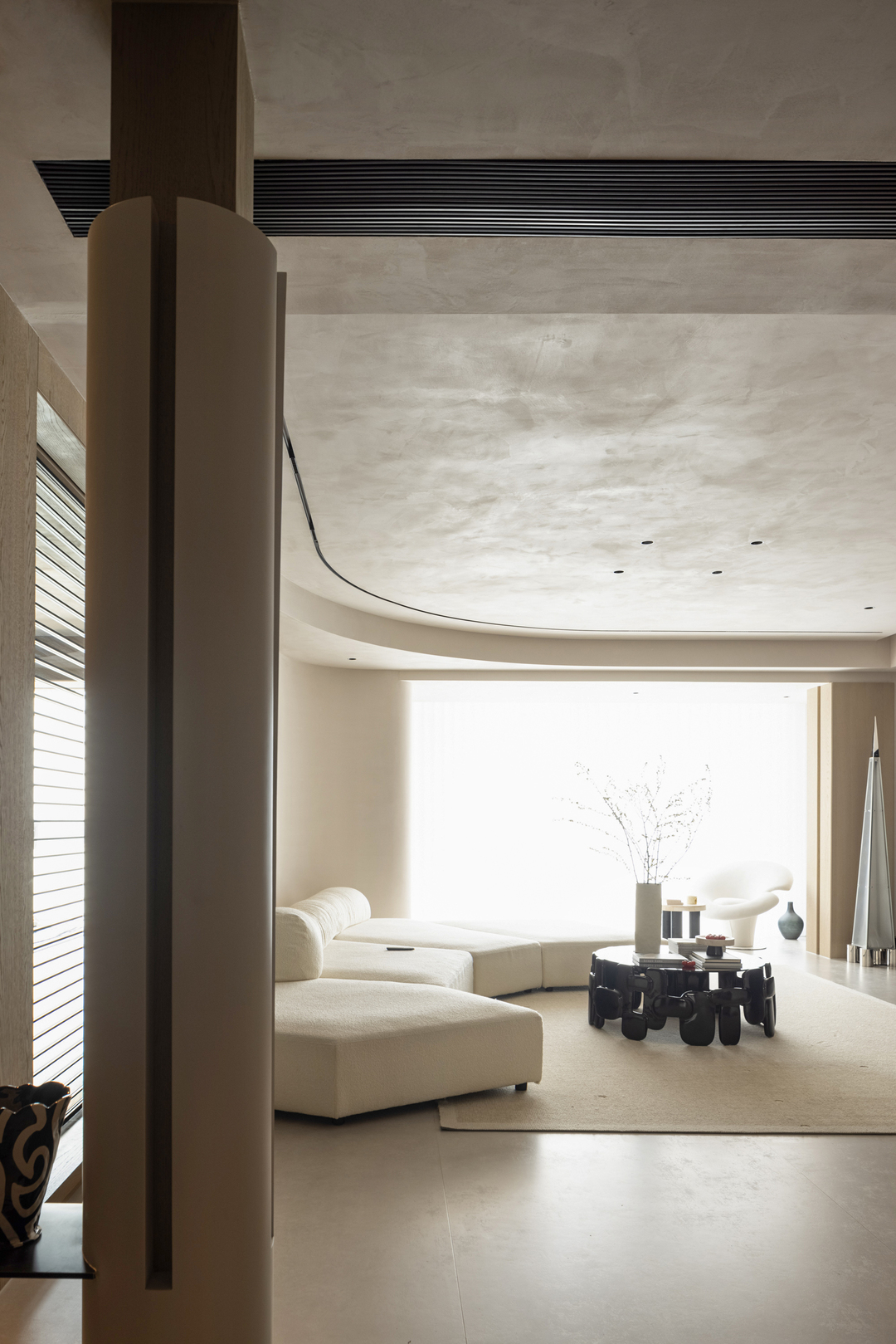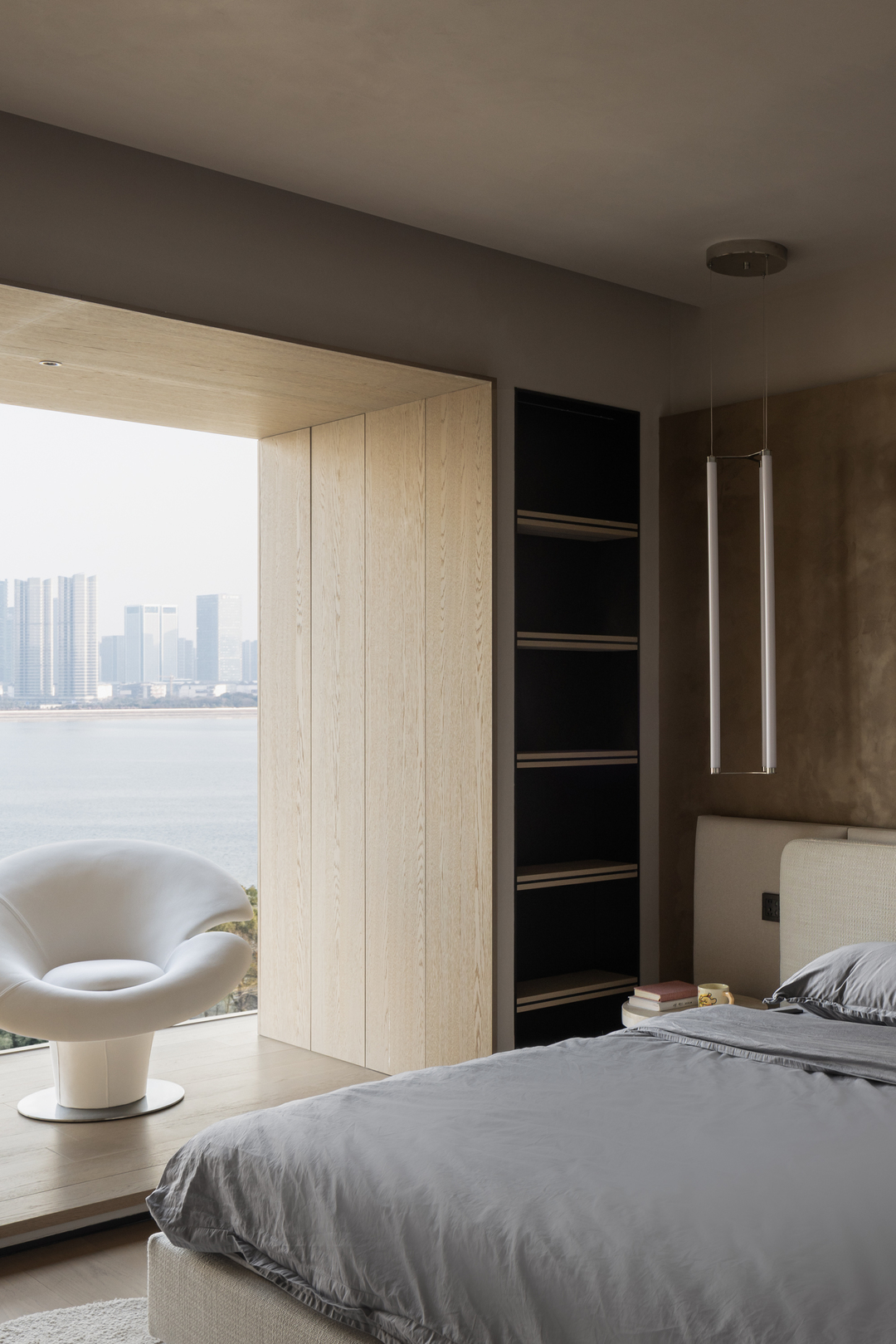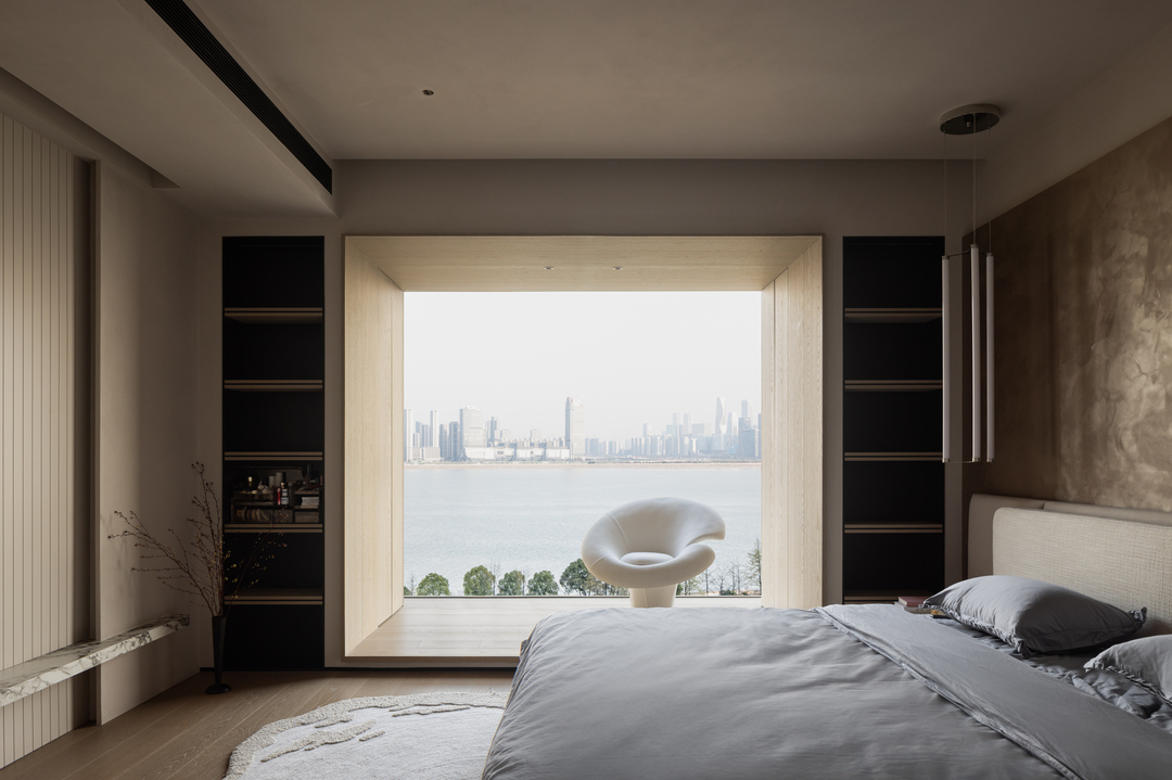 极简的轮廓下是高级质感的沉静表达。浅灰与米白交融,巨幅窗景将流动的江色与城市天际线从容引入室内。