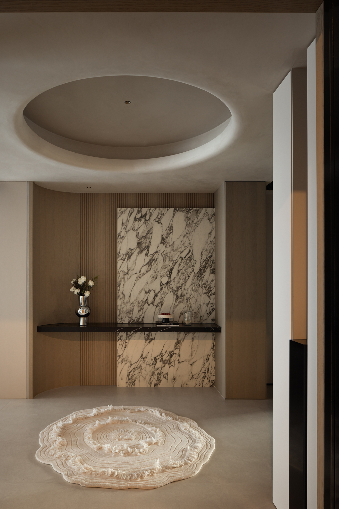 入户之境,穹顶弧线勾勒出艺术轮廓,大理石肌理铺陈自然诗篇,木石相生间尽显雅致韵律。一方圆形地毯点睛,让归家的第一步,便踏入质感与美学交织的私享场域。