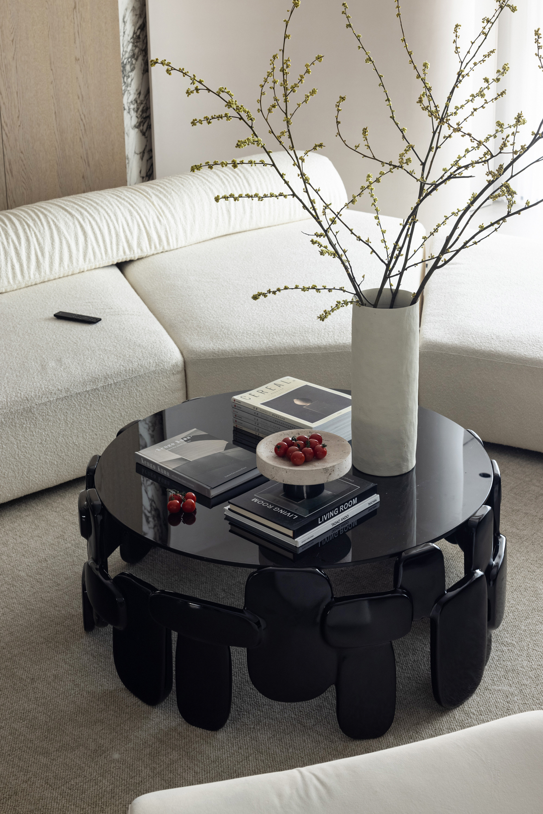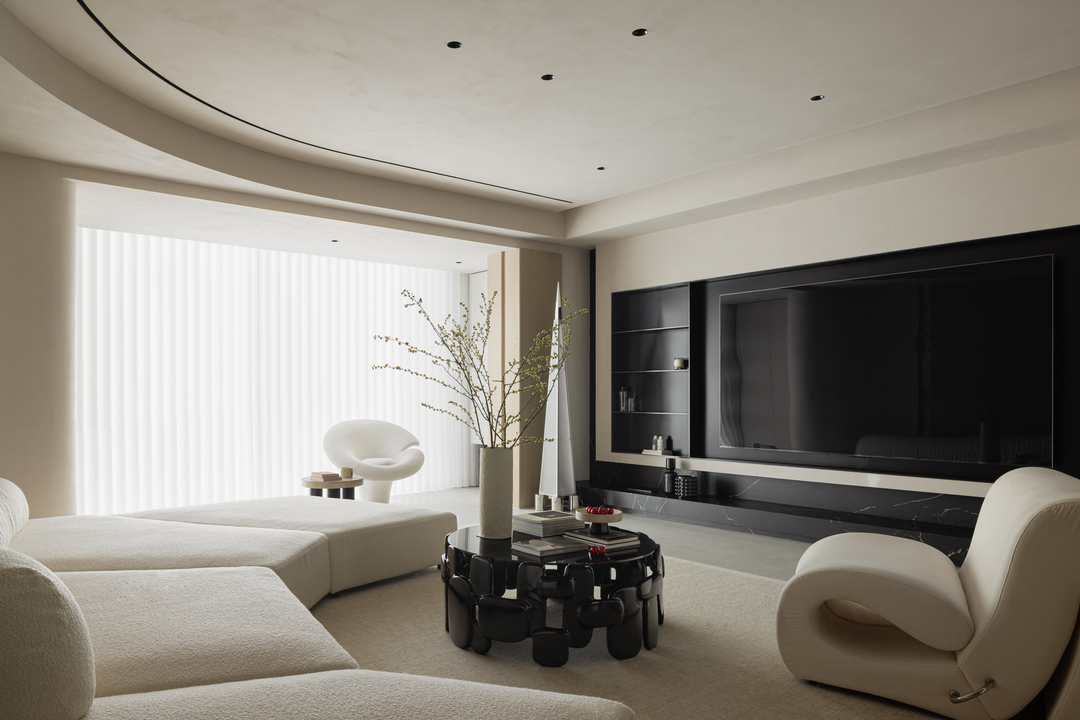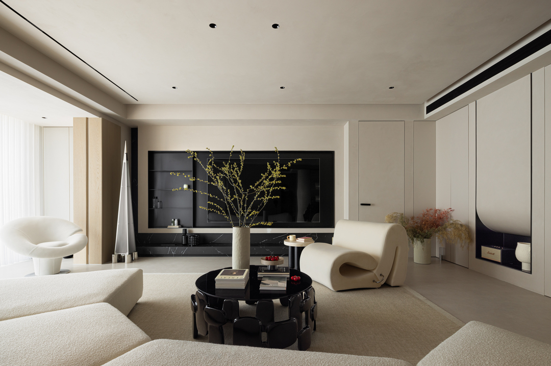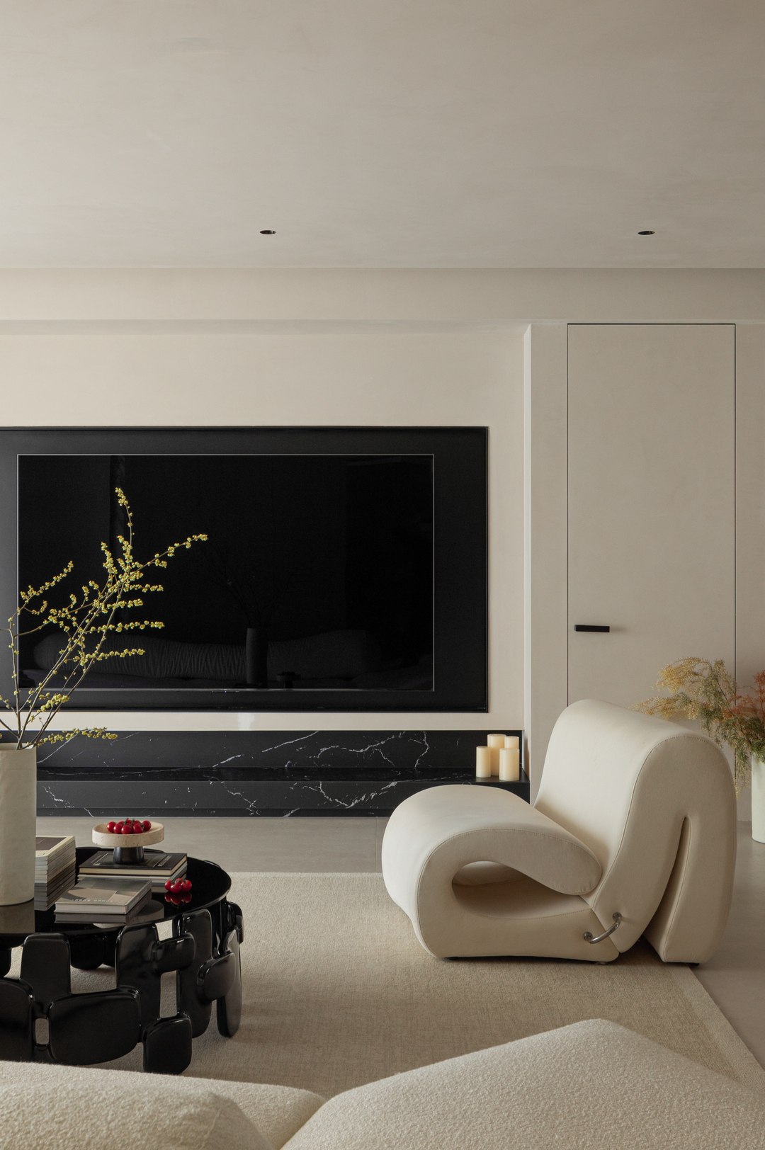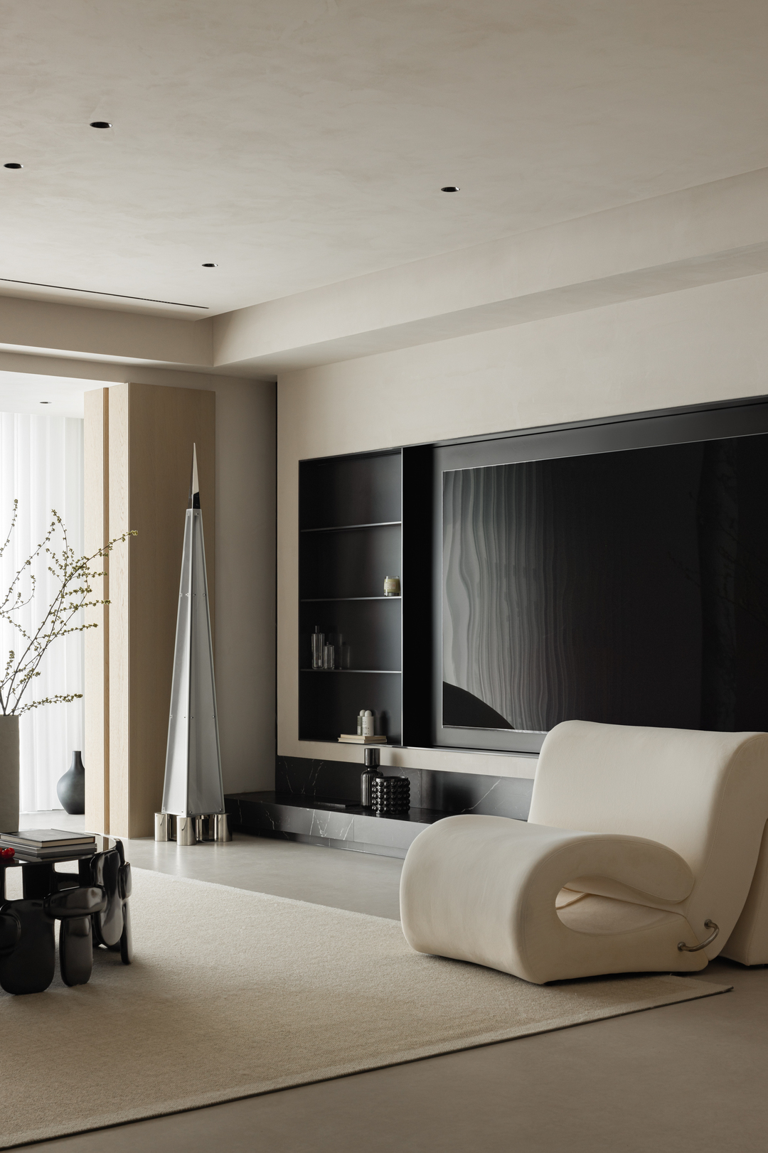 大理石基底的冷冽质感,与暖调空间碰撞出高级冲突。它不只是影音载体,更是一件嵌在生活里的立体装置,用黑与白的博弈、线与面的交响,把功能墙变成了空间中美的锚点。