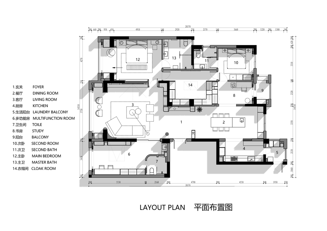 1.打破常规四叶草户型的过道布局,将过道整体整合,打造出主卧、次卧两间套房,同时拓展出大面积衣帽间,既强化了起居空间的私属性,又满足了业主作为博主对收纳与展示的双重需求。