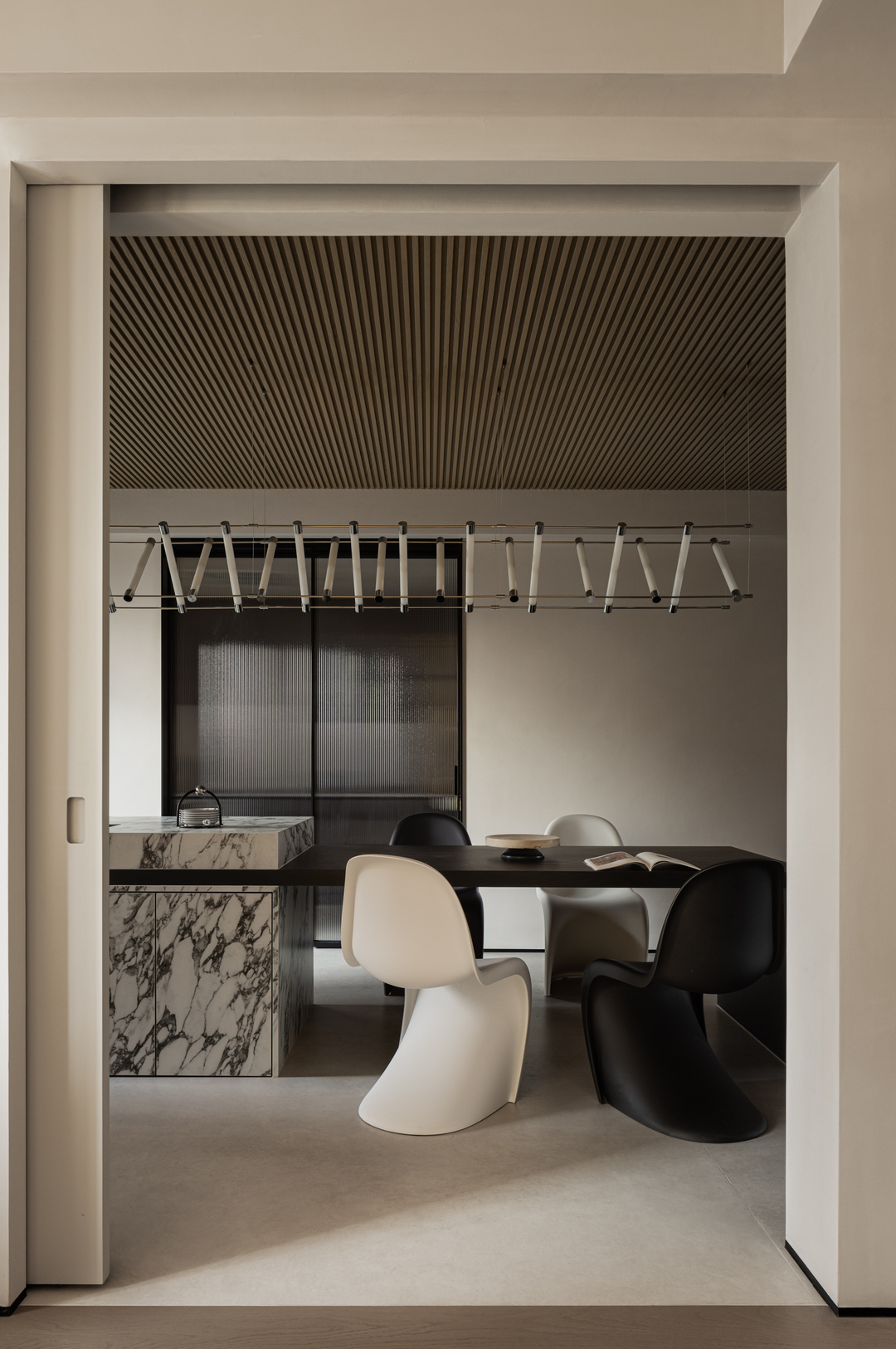 黑白餐椅循人体工学造形,落座即享舒适。米墙铺陈柔和,原木吊顶藏着暖意,几何吊灯以金属与亚克力的碰撞,划出利落现代感。