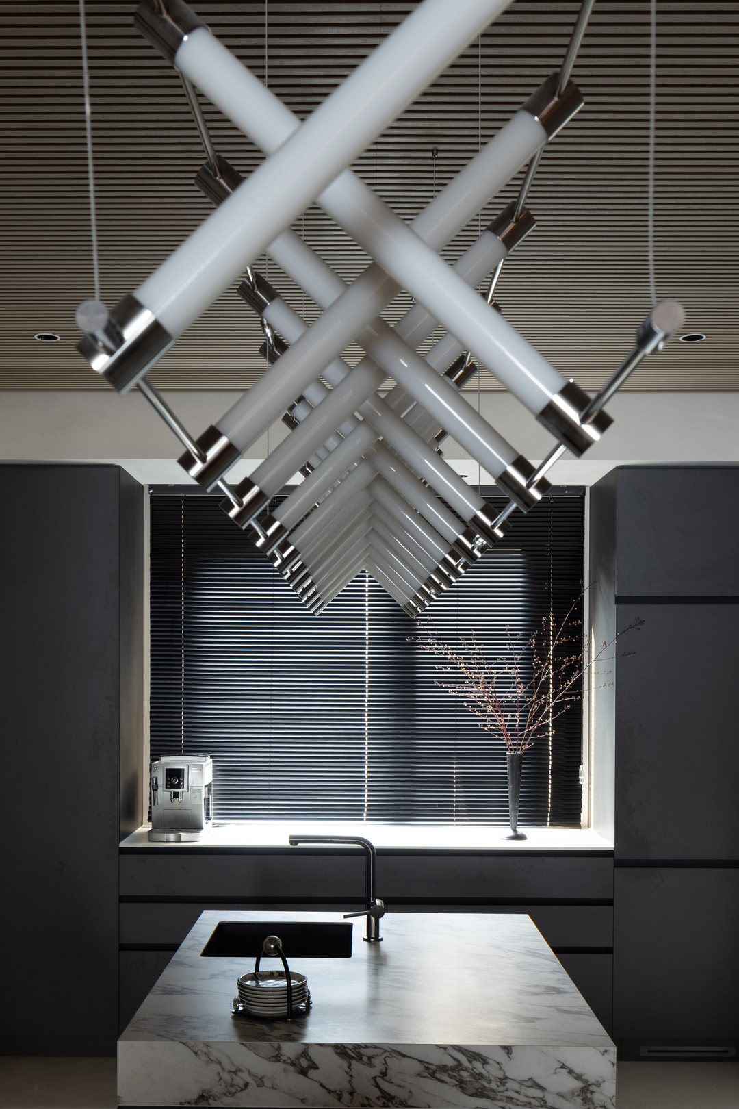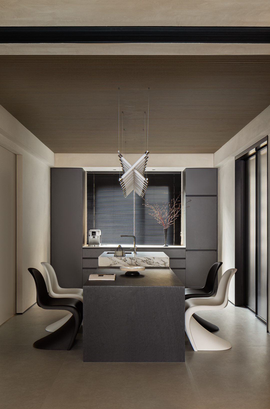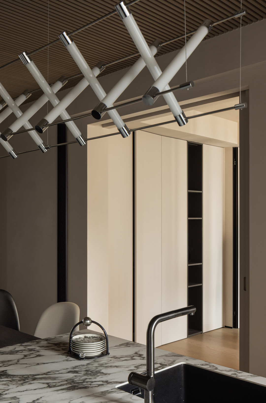百叶窗把光线裁成细缕,照映出大理石台面的水墨画稿,几何吊灯以金属与玻璃的交织,在头顶织就现代艺术的肌理。